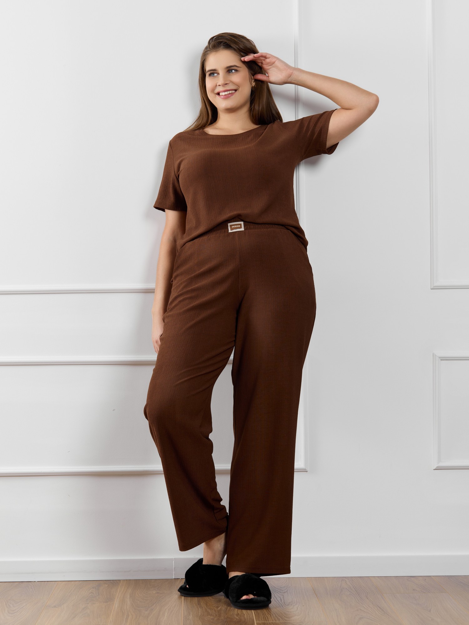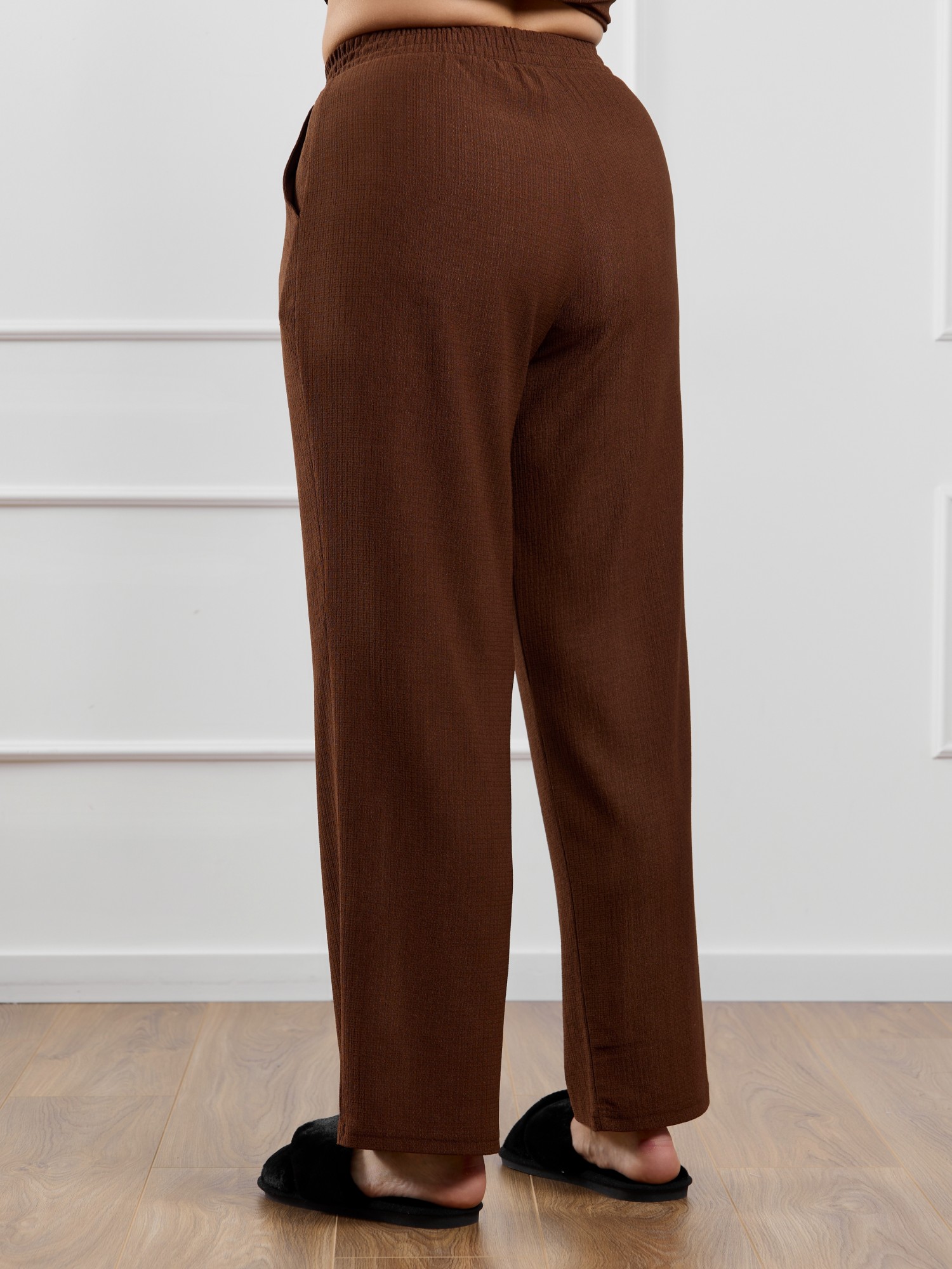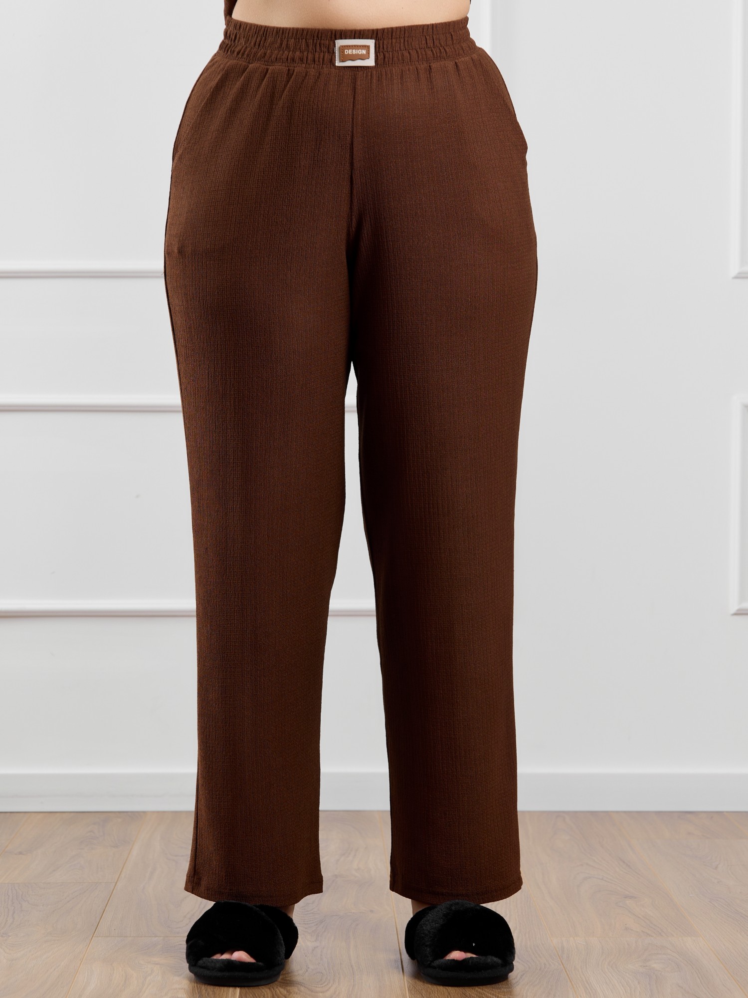 Брюки женские из гладкокрашенного трикотажного полотна «бурумчук», свободного покроя, с карманами в боковых швах, на притачном поясе с эластичной тесьмой внутри.