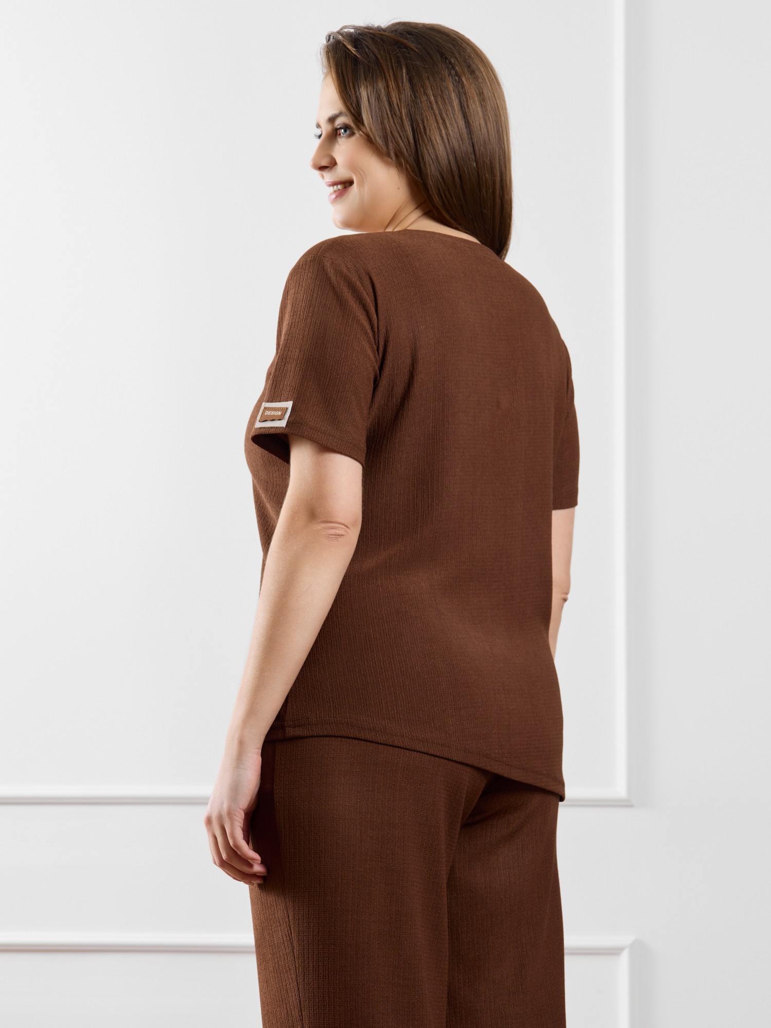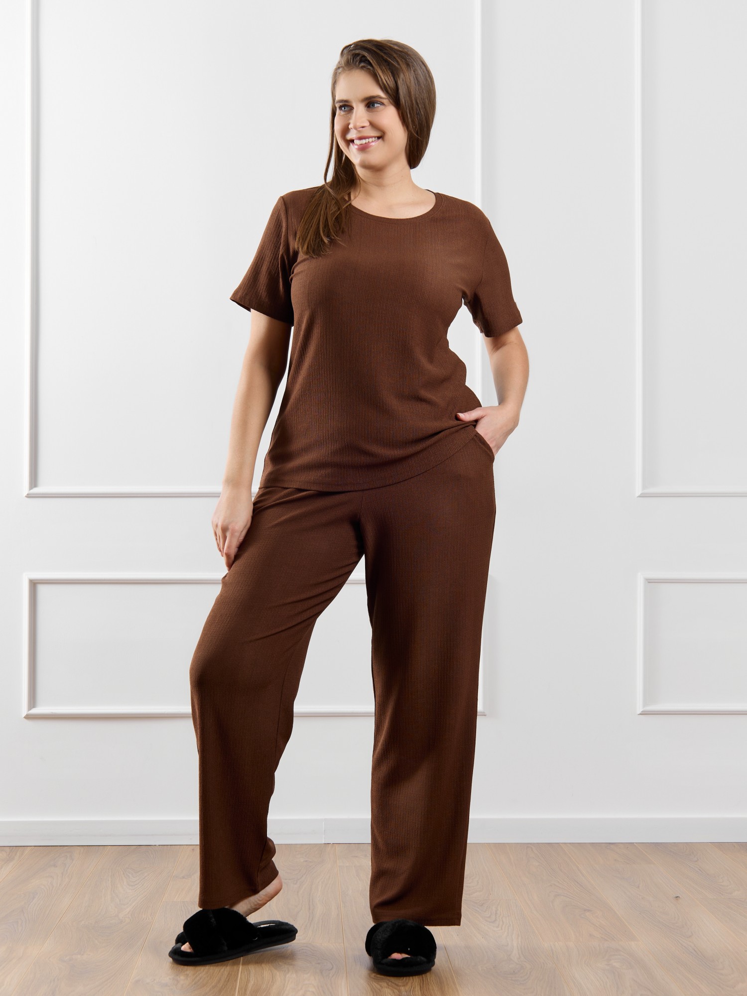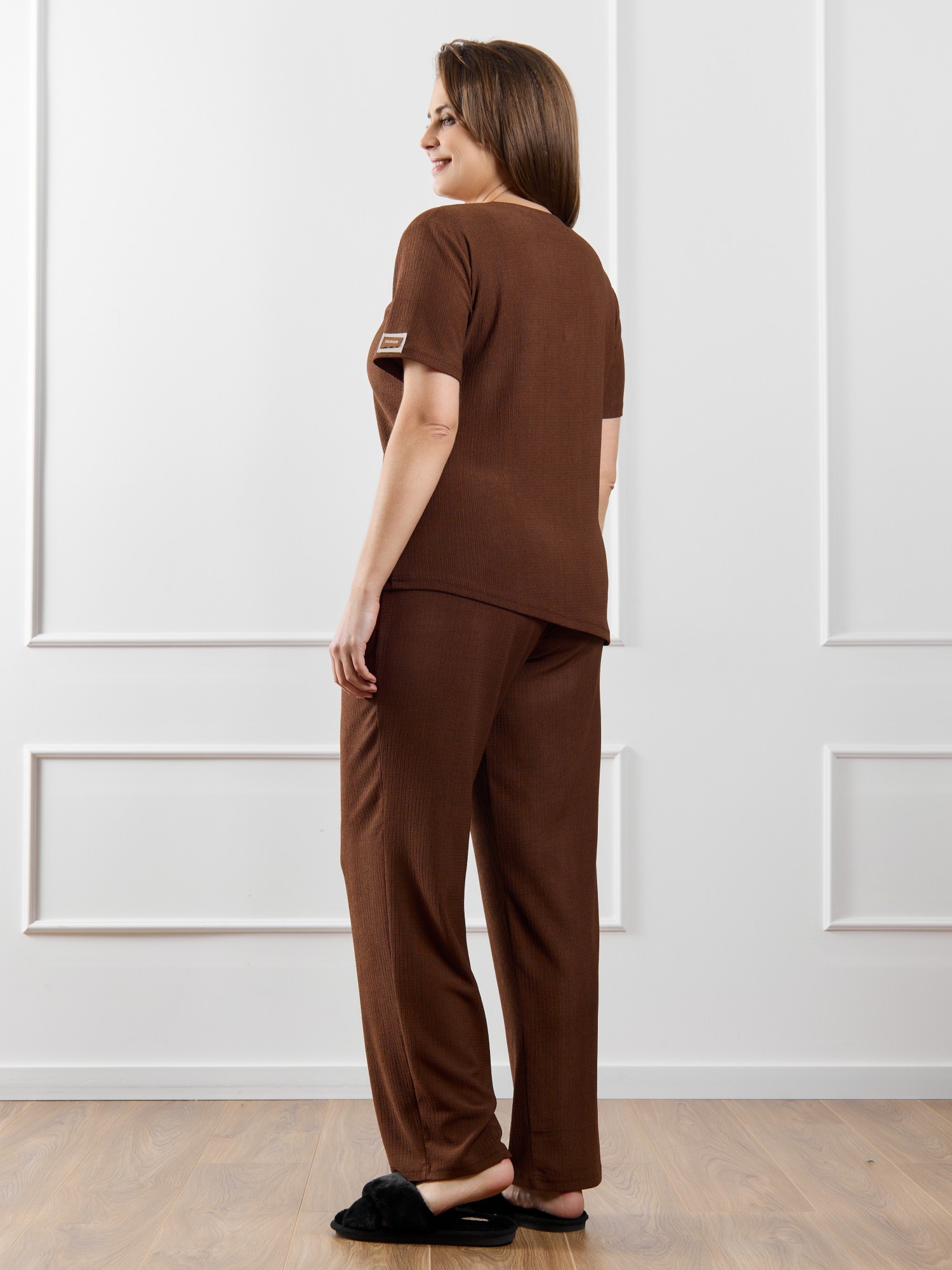 Брюки женские из гладкокрашенного трикотажного полотна «бурумчук», свободного покроя, с карманами в боковых швах, на притачном поясе с эластичной тесьмой внутри.