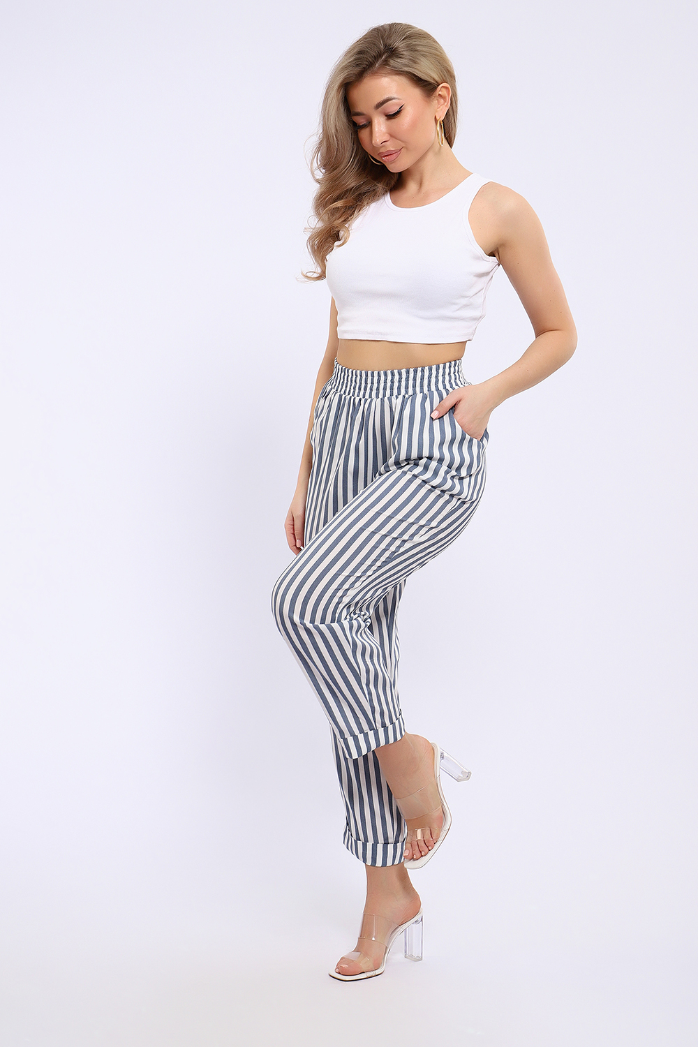 Брюки имеют два боковых внутренних кармана. Длина их 7/8, снизу притачаны манжеты, которые можно подвернуть наверх или отвернуть вниз, чтобы удлинить штаны. В замерах указана длина брюк с подвернутыми наверх манжетами. Рост модели 167см. Обхват талии в замерах соответствует длине резинки в растянутом виде.