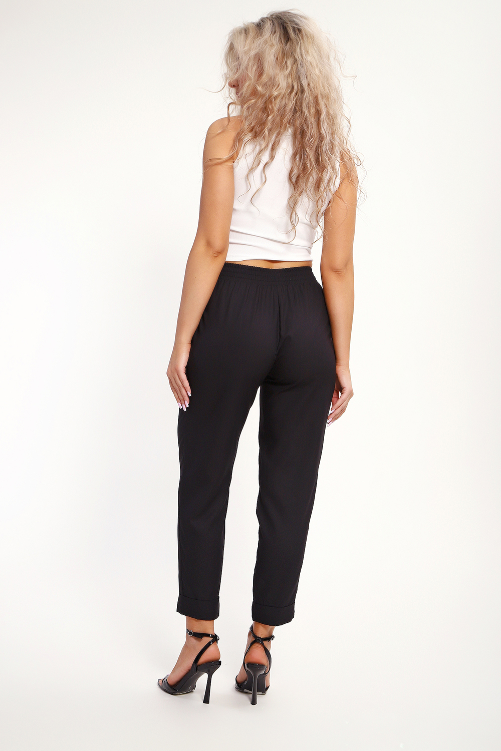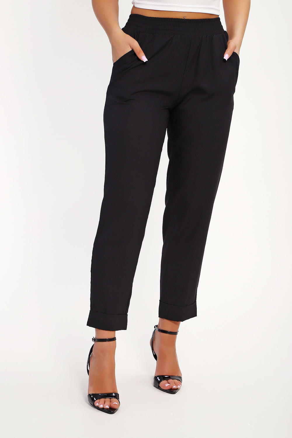 Брюки имеют два боковых внутренних кармана. Длина их 7/8, снизу притачаны манжеты, которые можно подвернуть наверх или отвернуть вниз, чтобы удлинить штаны. В замерах указана длина брюк с подвернутыми наверх манжетами. Рост модели 167см. Обхват талии в замерах соответствует длине резинки в растянутом виде.