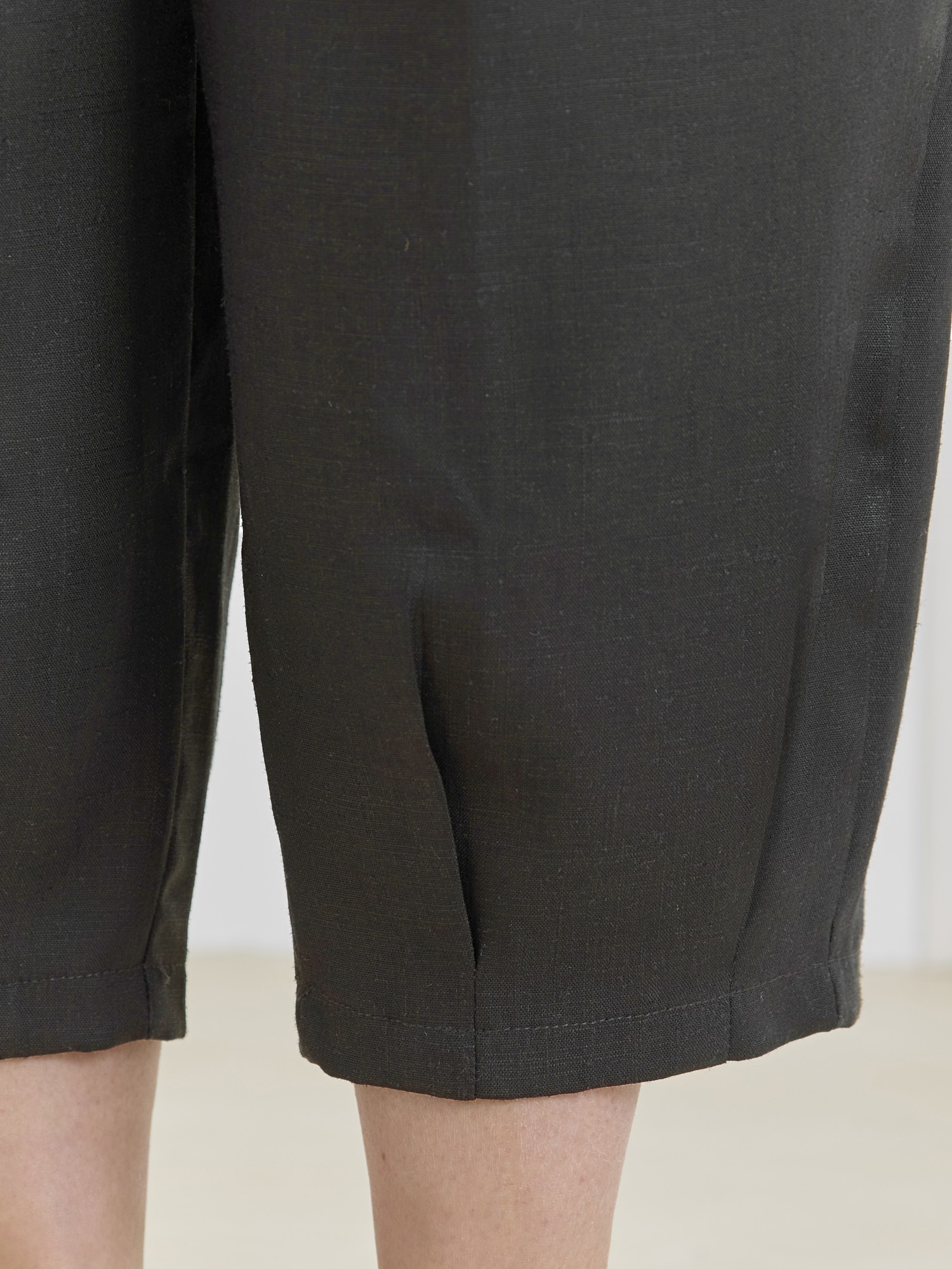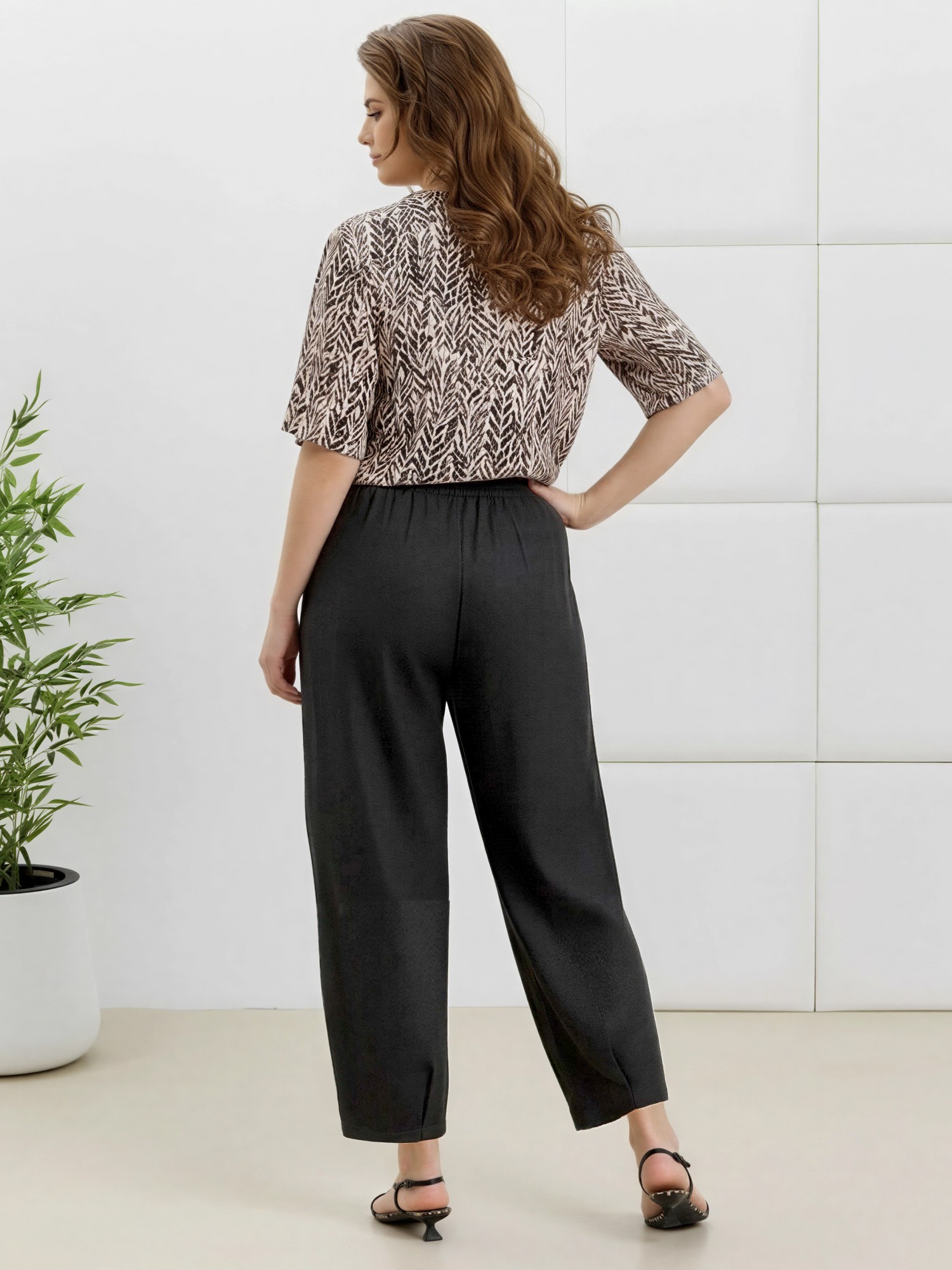 Брюки женские «бананы» из гладкокрашеной плательной ткани, стандартной длины, с заложенными складками по талии, на притачном поясе с эластичной тесьмой внутри, с карманами в боковых швах, зауженные к низу. На нижних частях передних и задних половин застрочены складки-защипы.