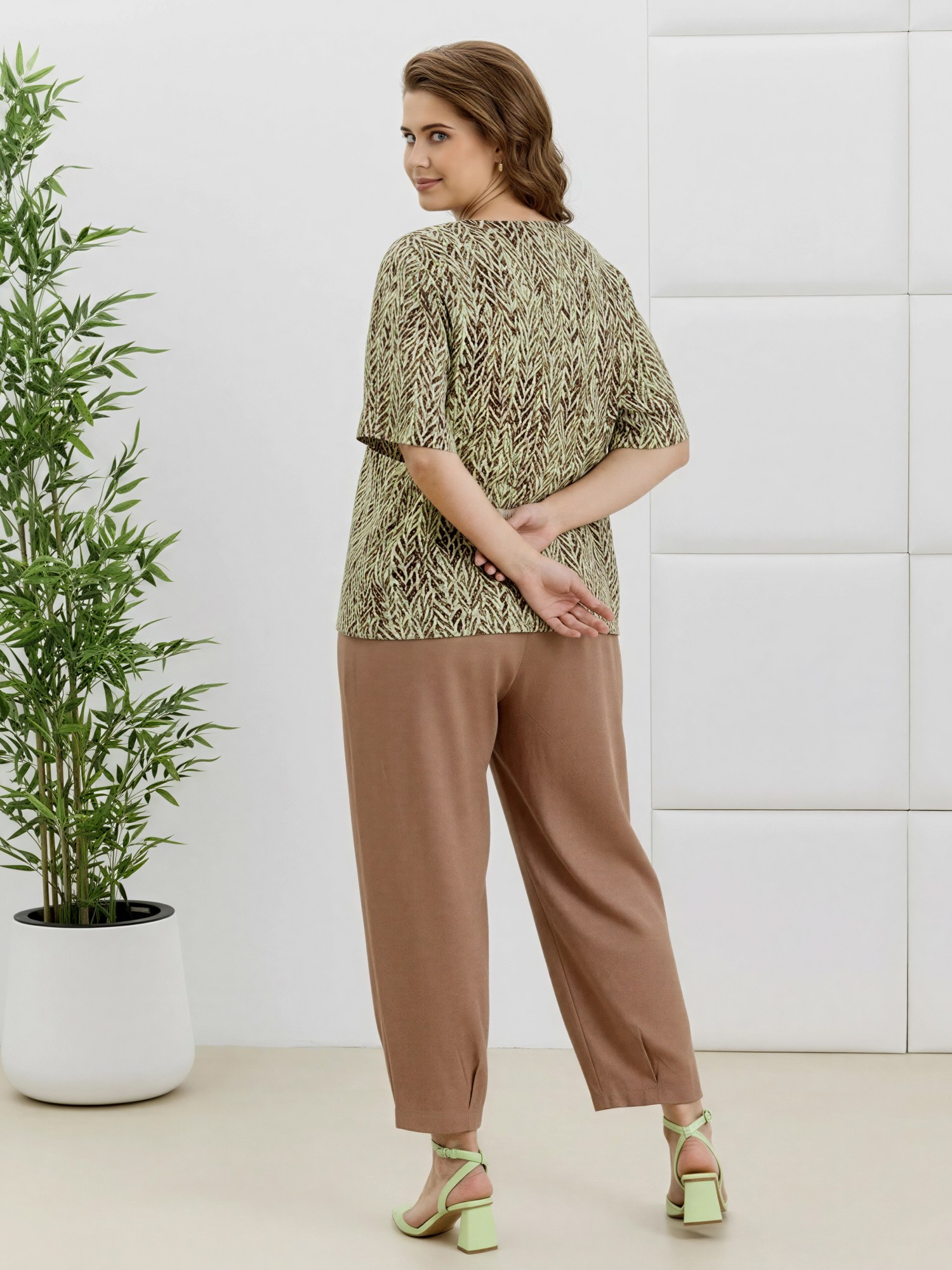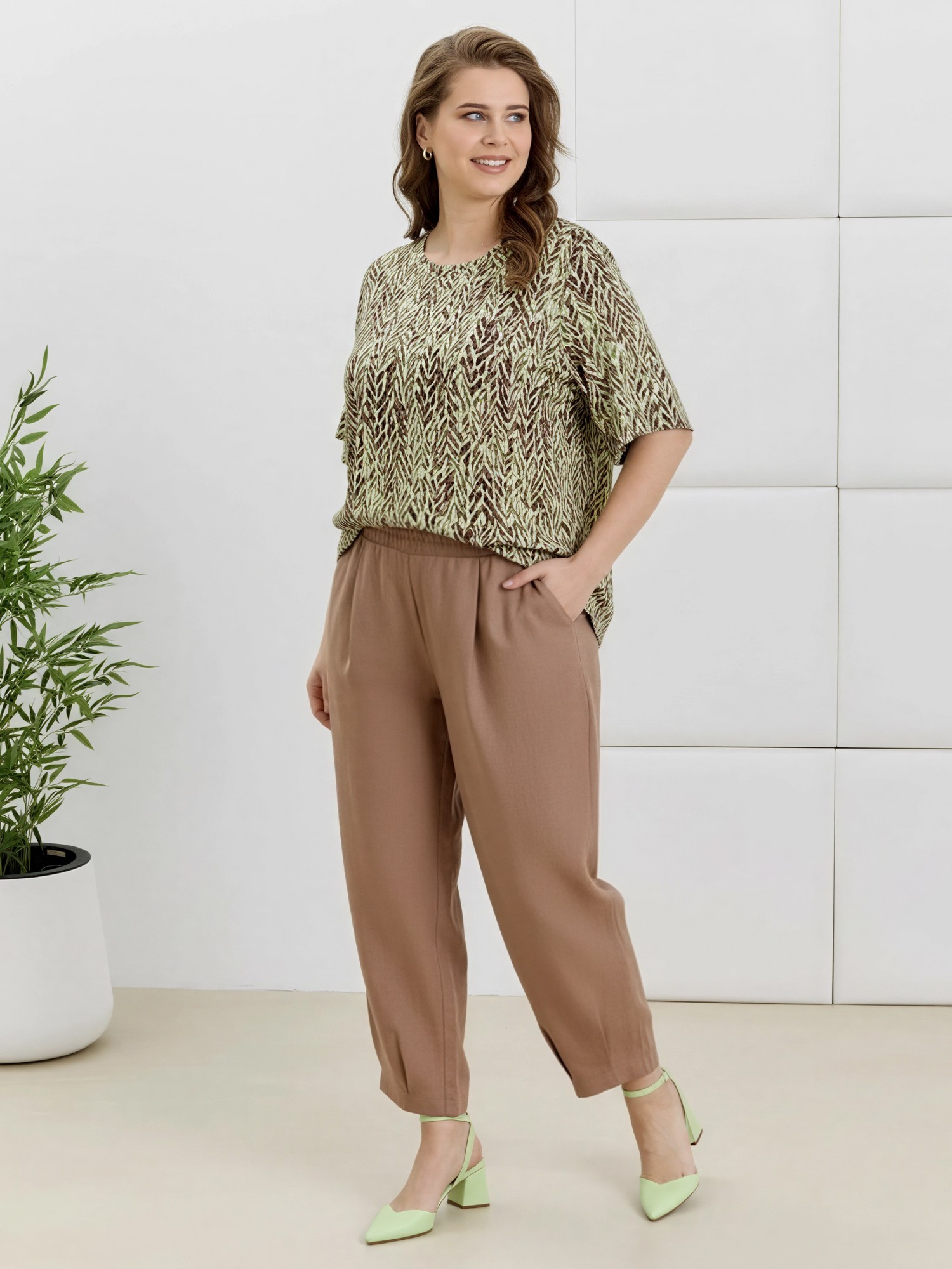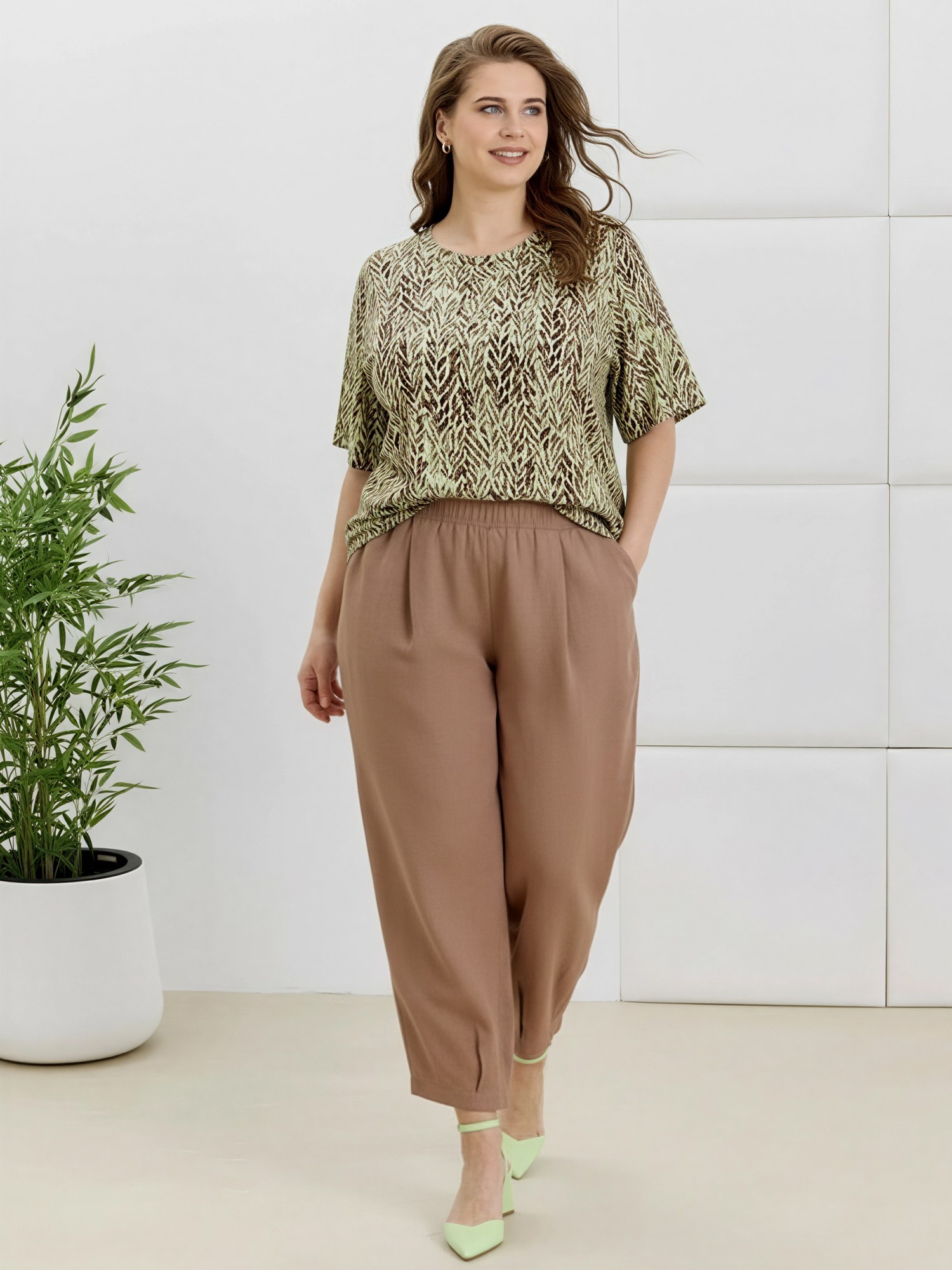 Брюки женские «бананы» из гладкокрашеной плательной ткани, стандартной длины, с заложенными складками по талии, на притачном поясе с эластичной тесьмой внутри, с карманами в боковых швах, зауженные к низу. На нижних частях передних и задних половин застрочены складки-защипы.