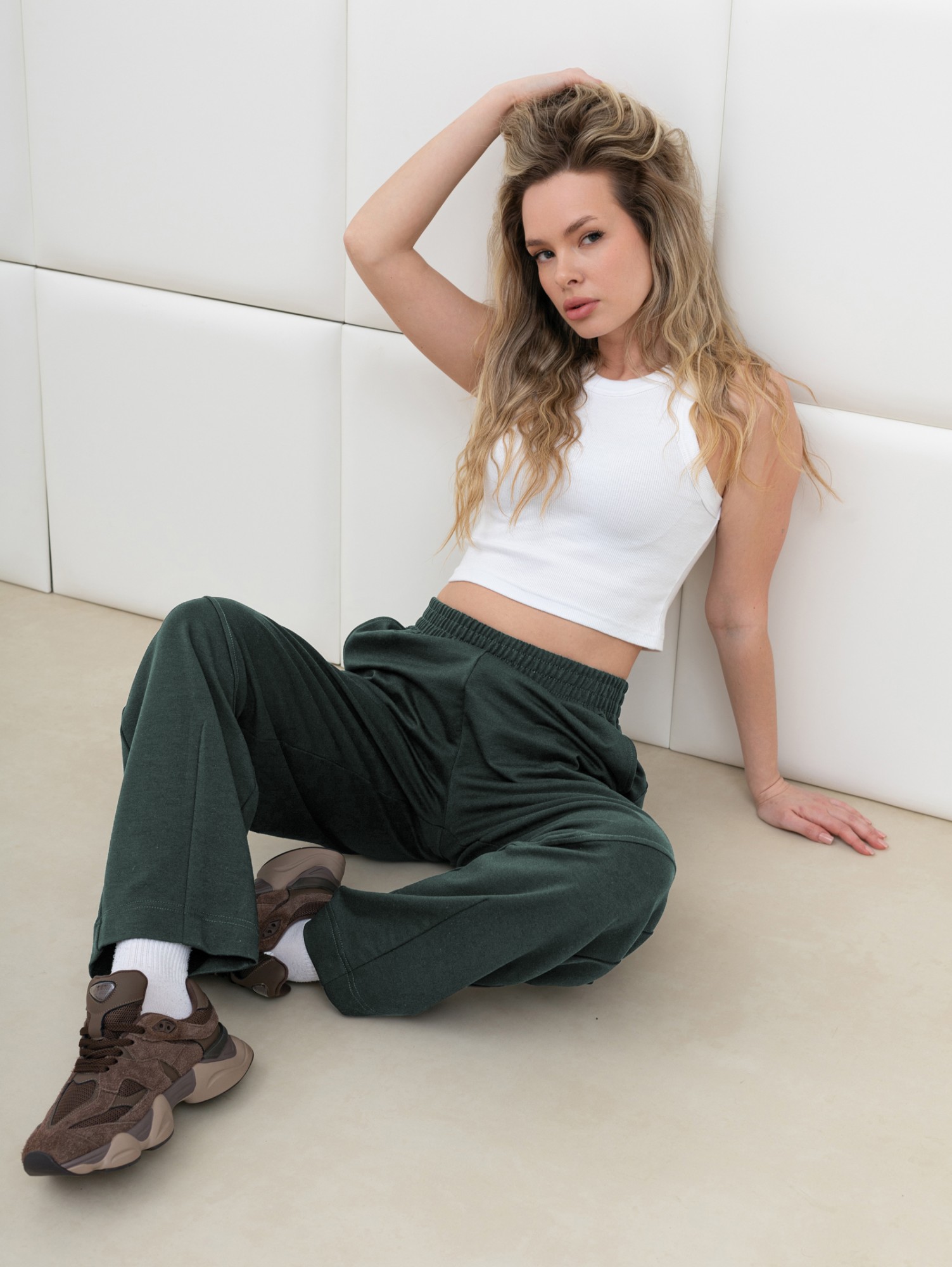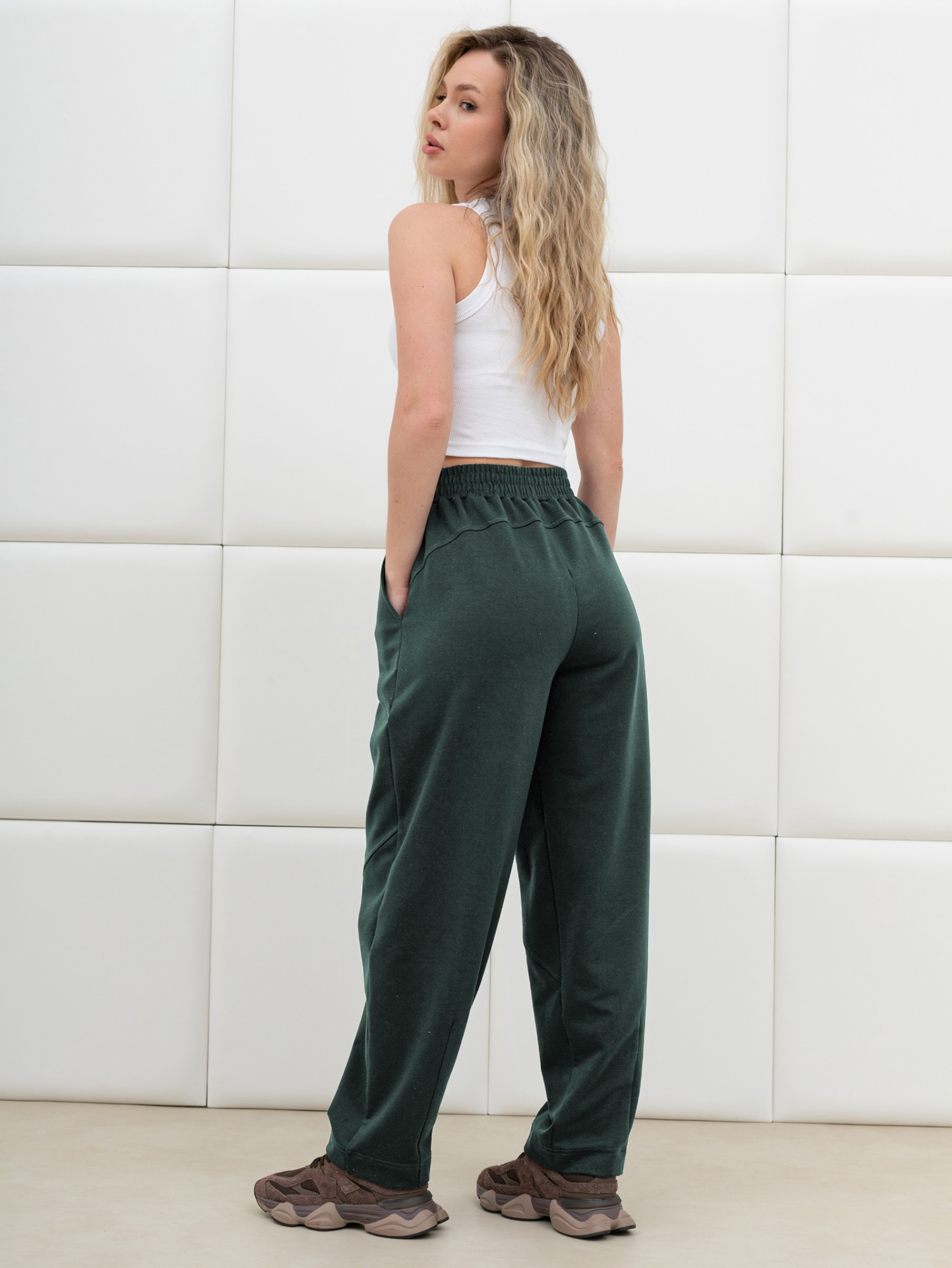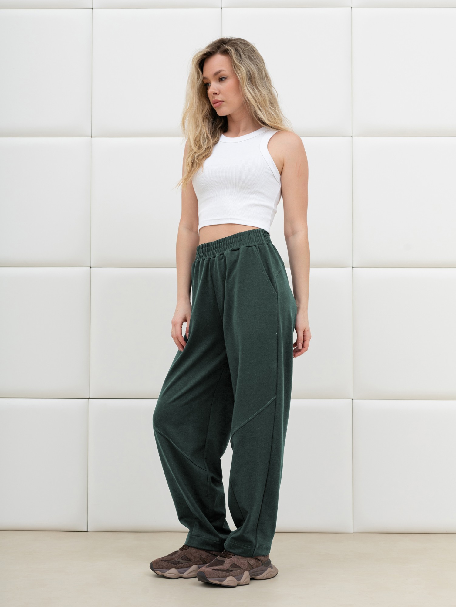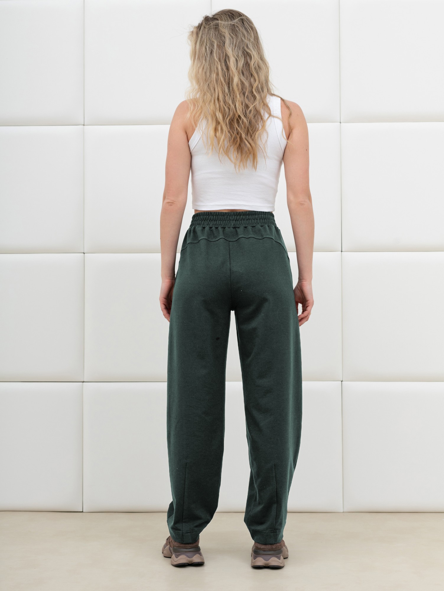 Брюки женские из трикотажного гладкокрашеного полотна «футер вискозный», слегка зауженные, стандартной длины, на притачном поясе с эластичной тесьмой внутри, с карманами в боковых швах. Правая и левая половины брюк состоят из двух частей, скроенных по косой, с отделочными строчками по шву стачивания. На нижних частях передних и задних половин застрочены вытачки.