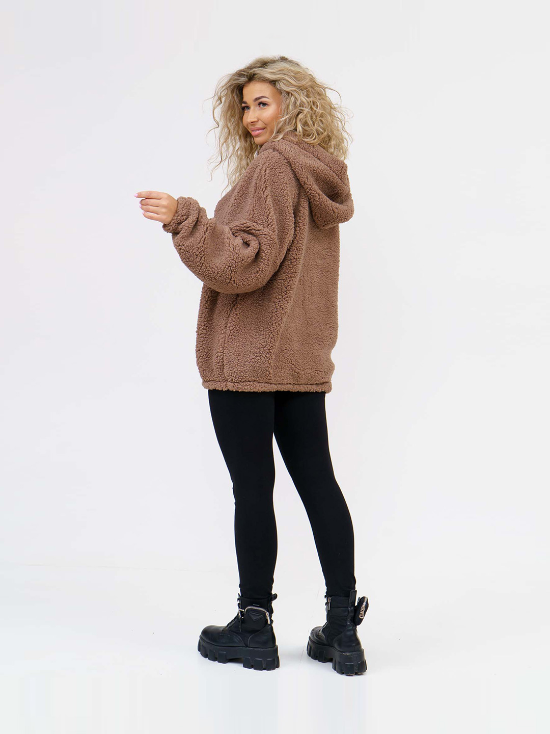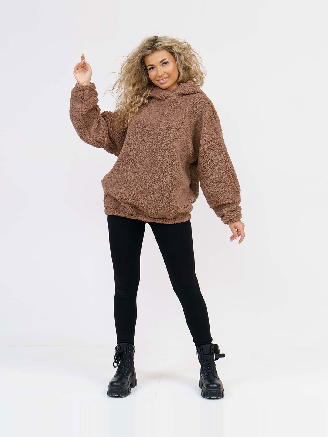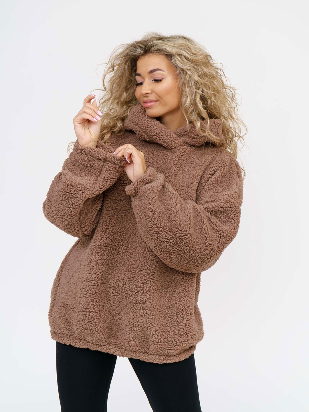 Толстовка мод.1770/2 (оверсайз) / Коричневый станет прекрасным подарком на любой праздник! Шерпа – синтетическое полотно с имитацией меха на лицевой поверхности. На ощупь материал плотный, приятный, мягкий. Хорошо согревает. Изнаночная сторона – текстильное полотно трикотажного переплетения. Фактура ткани хорошо видна на фото. Идеально подойдет для прохладного времени года. Толстовка идеально сочетается с любыми вещами в гардеробе с джинсами, юбкой, можно надеть поверх платья холодным вечером. Она непременно понравится взрослым женщинам и девочкам - подросткам.