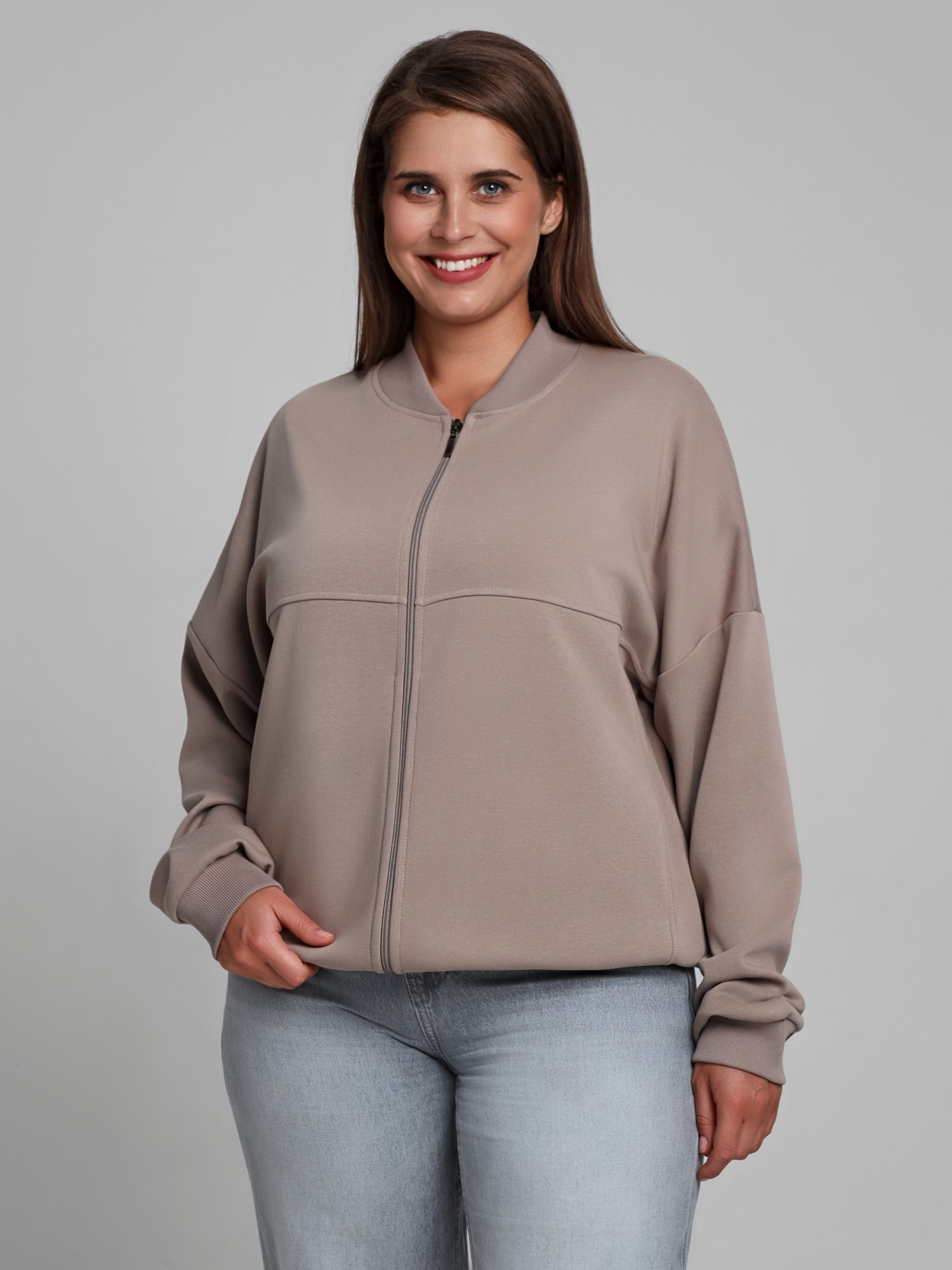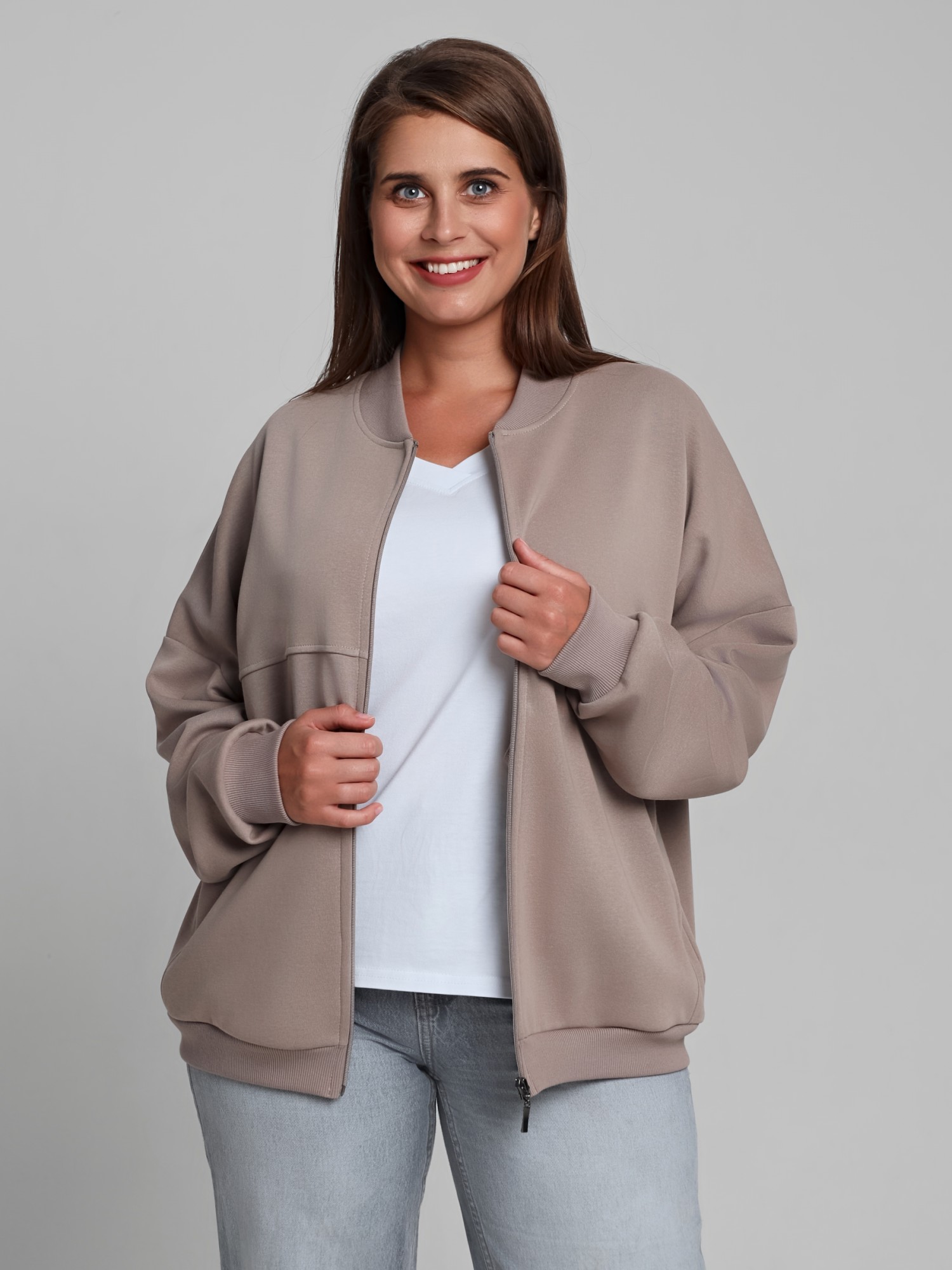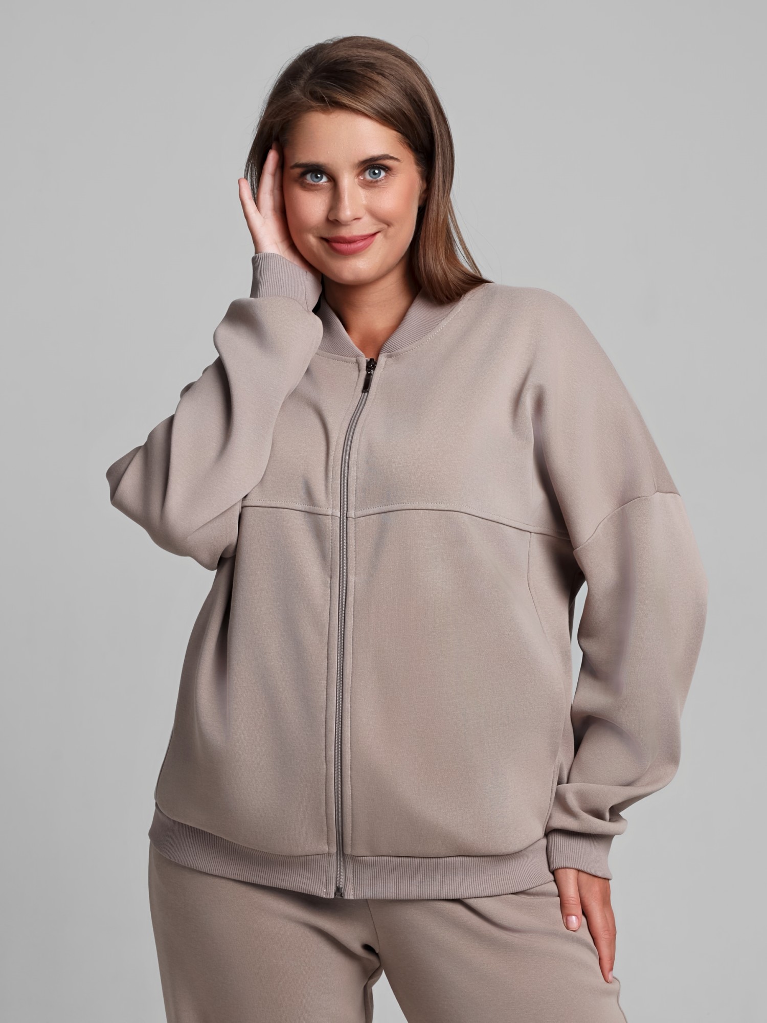Куртка – женская из гладкокрашенного трикотажного полотна «лининг» прямого силуэта, свободная, с длинными втачными рукавами, горловиной овальной формы, обработанной втачной планкой, центральной бортовой застежкой на тесьму «молния». Полочка состоит из трех деталей, на нижней части в рельефах выполнены карманы, низ изделия с притачным поясом, рукава с притачными манжетами. Пояс, планка горловины, манжеты рукавов выполнены из трикотажного полотна «кашкорсе».