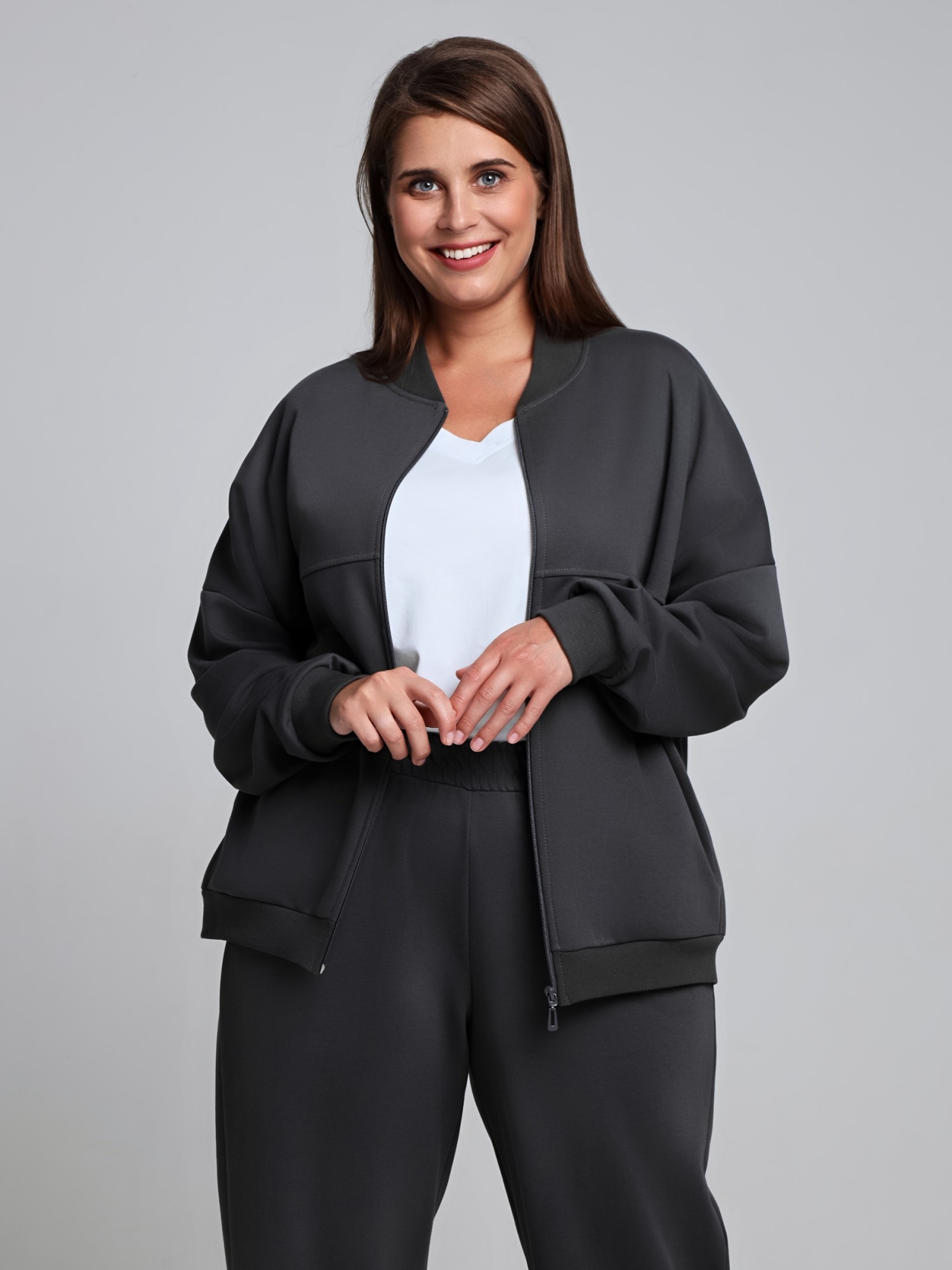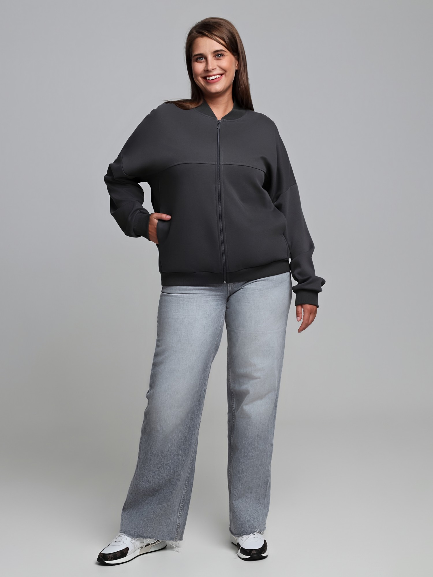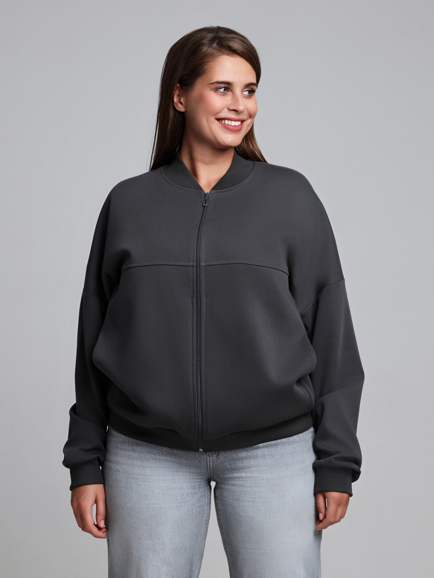 Куртка – женская из гладкокрашенного трикотажного полотна «лининг» прямого силуэта, свободная, с длинными втачными рукавами, горловиной овальной формы, обработанной втачной планкой, центральной бортовой застежкой на тесьму «молния». Полочка состоит из трех деталей, на нижней части в рельефах выполнены карманы, низ изделия с притачным поясом, рукава с притачными манжетами. Пояс, планка горловины, манжеты рукавов выполнены из трикотажного полотна «кашкорсе».