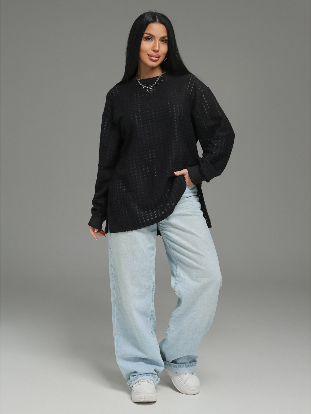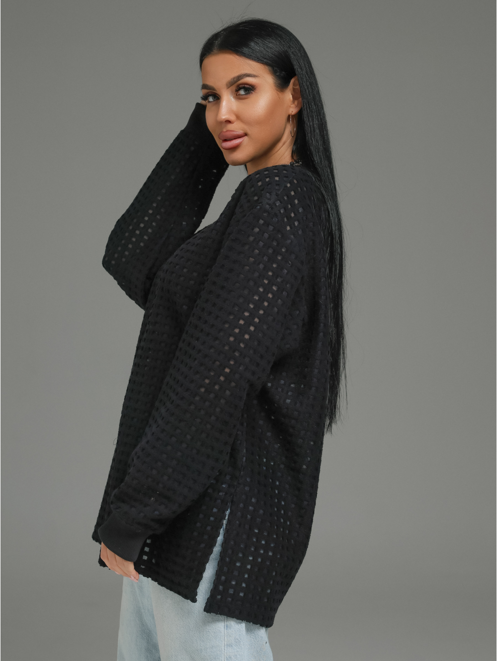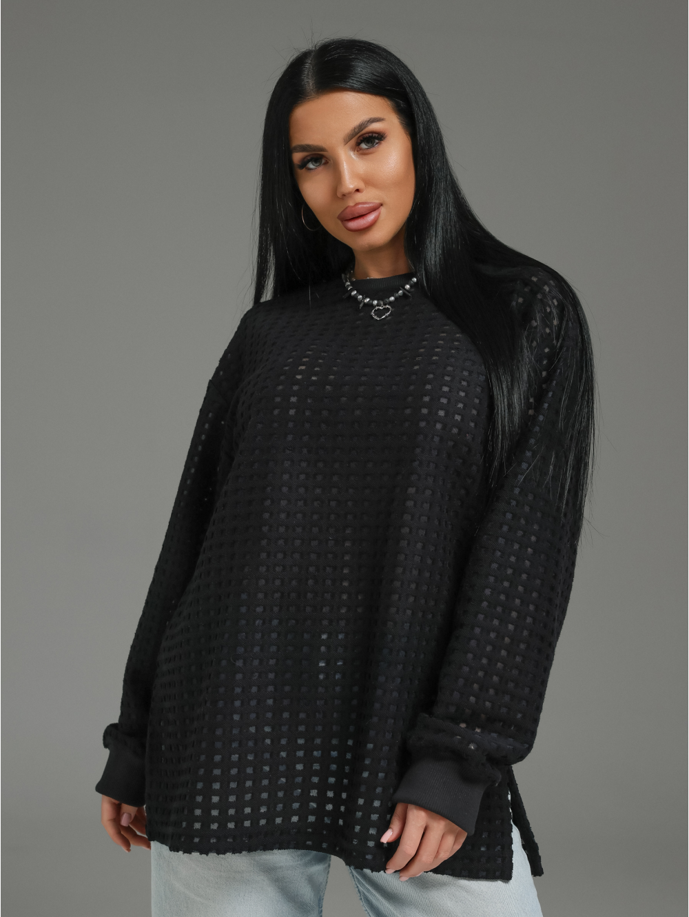 Главный герой — роскошный футер. Это не просто трикотаж. Это футер трехнитка «петля» с жаккардовым узором. Необычная фактура в клетку с прозрачными вставками в каждой клетке. Это ткань, которая выглядит дорого и так же ценно ощущается на теле.