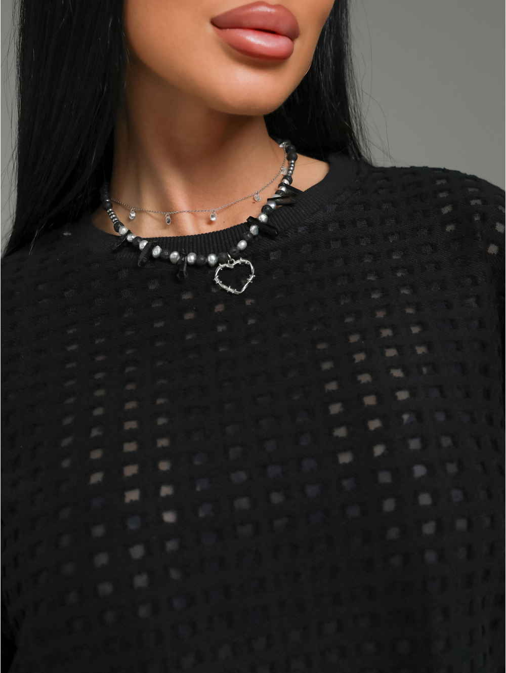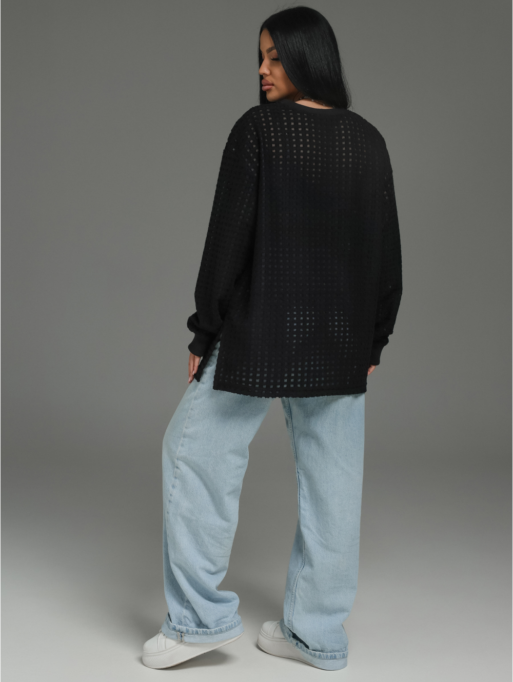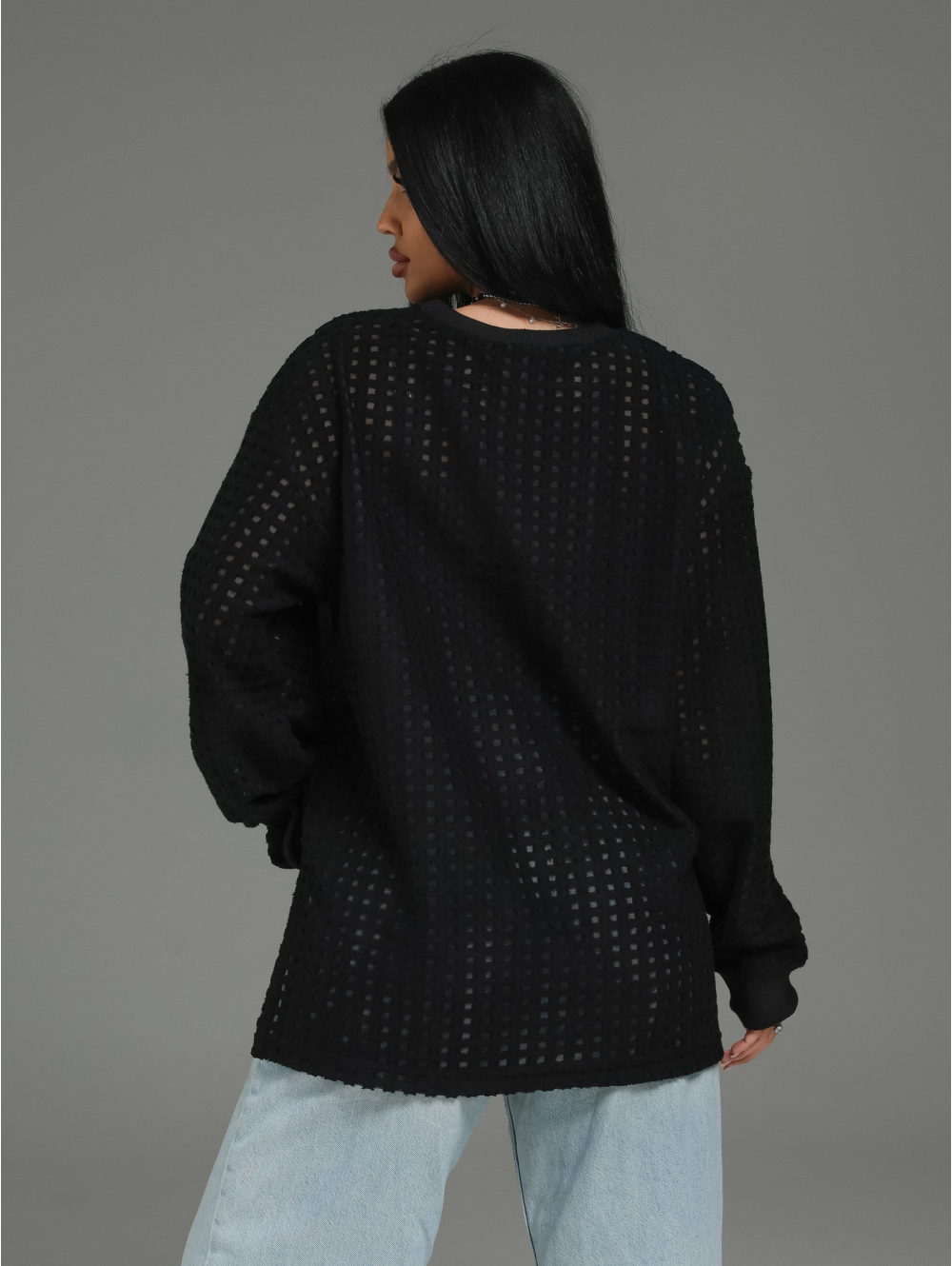 Главный герой — роскошный футер. Это не просто трикотаж. Это футер трехнитка «петля» с жаккардовым узором. Необычная фактура в клетку с прозрачными вставками в каждой клетке. Это ткань, которая выглядит дорого и так же ценно ощущается на теле.