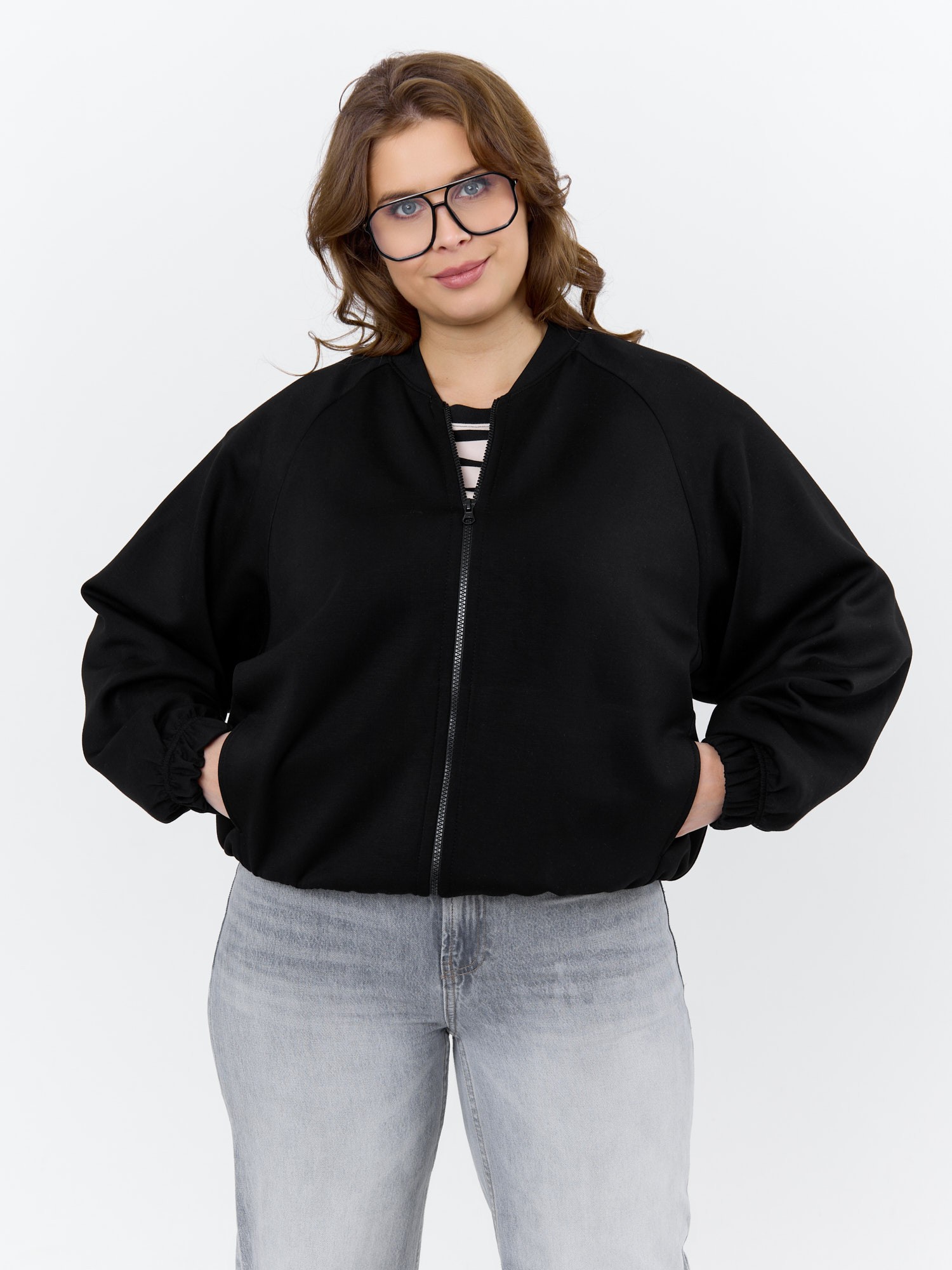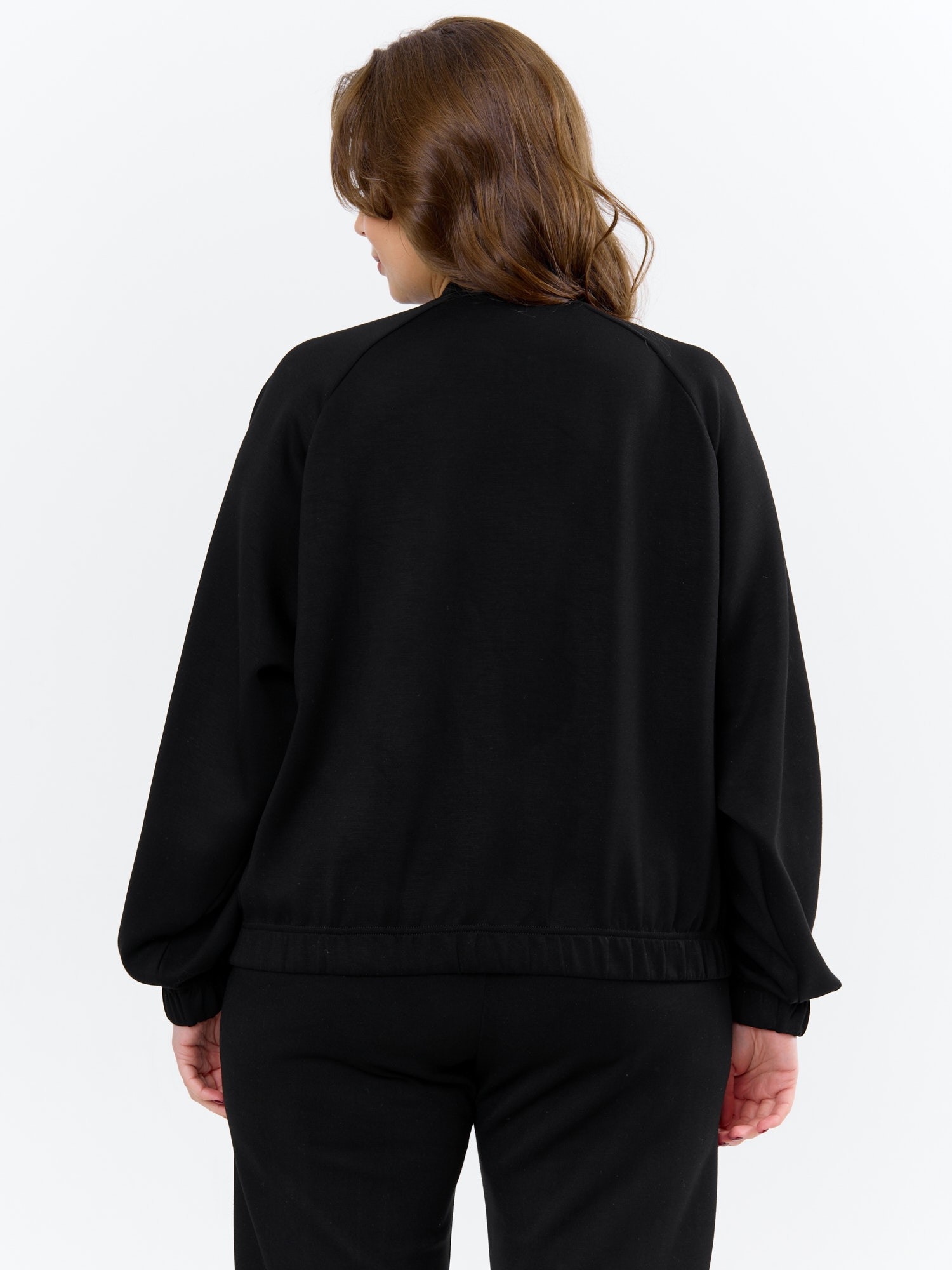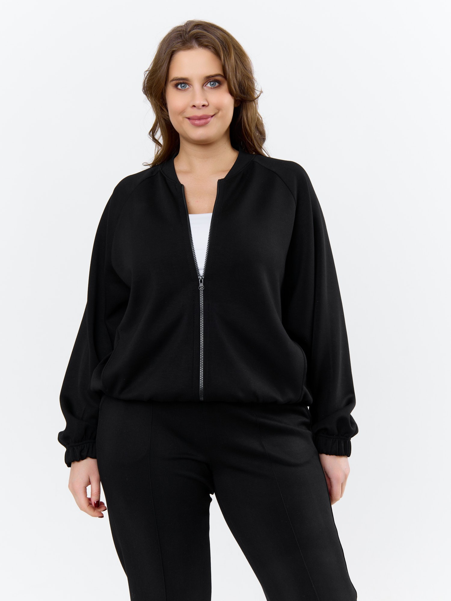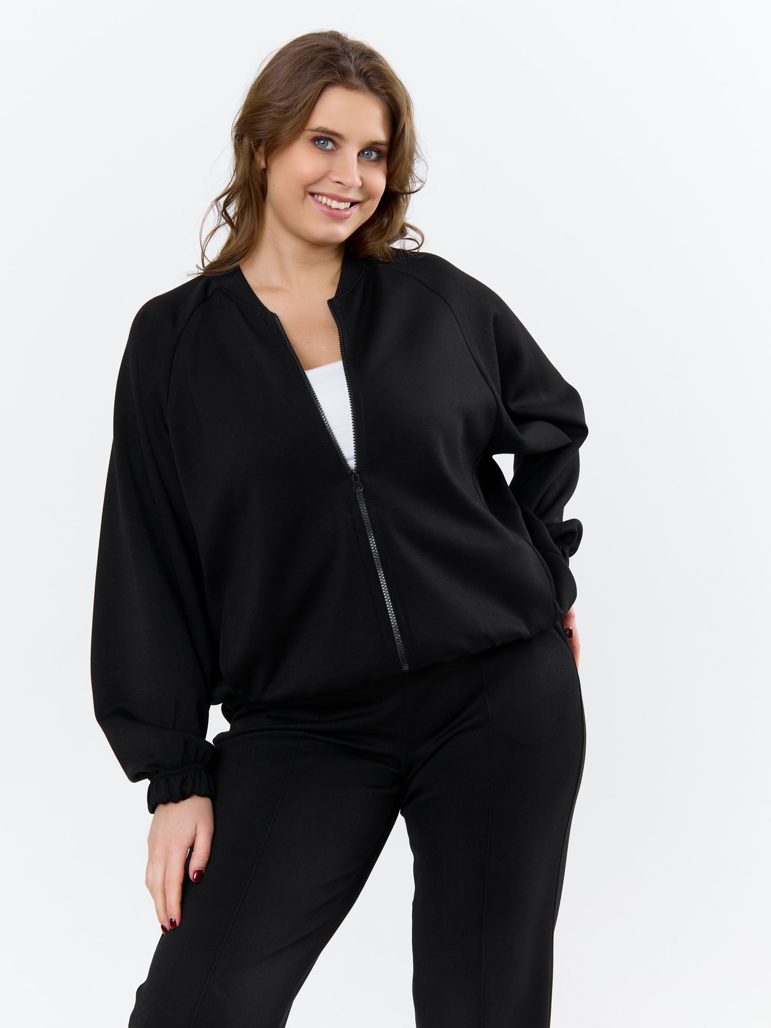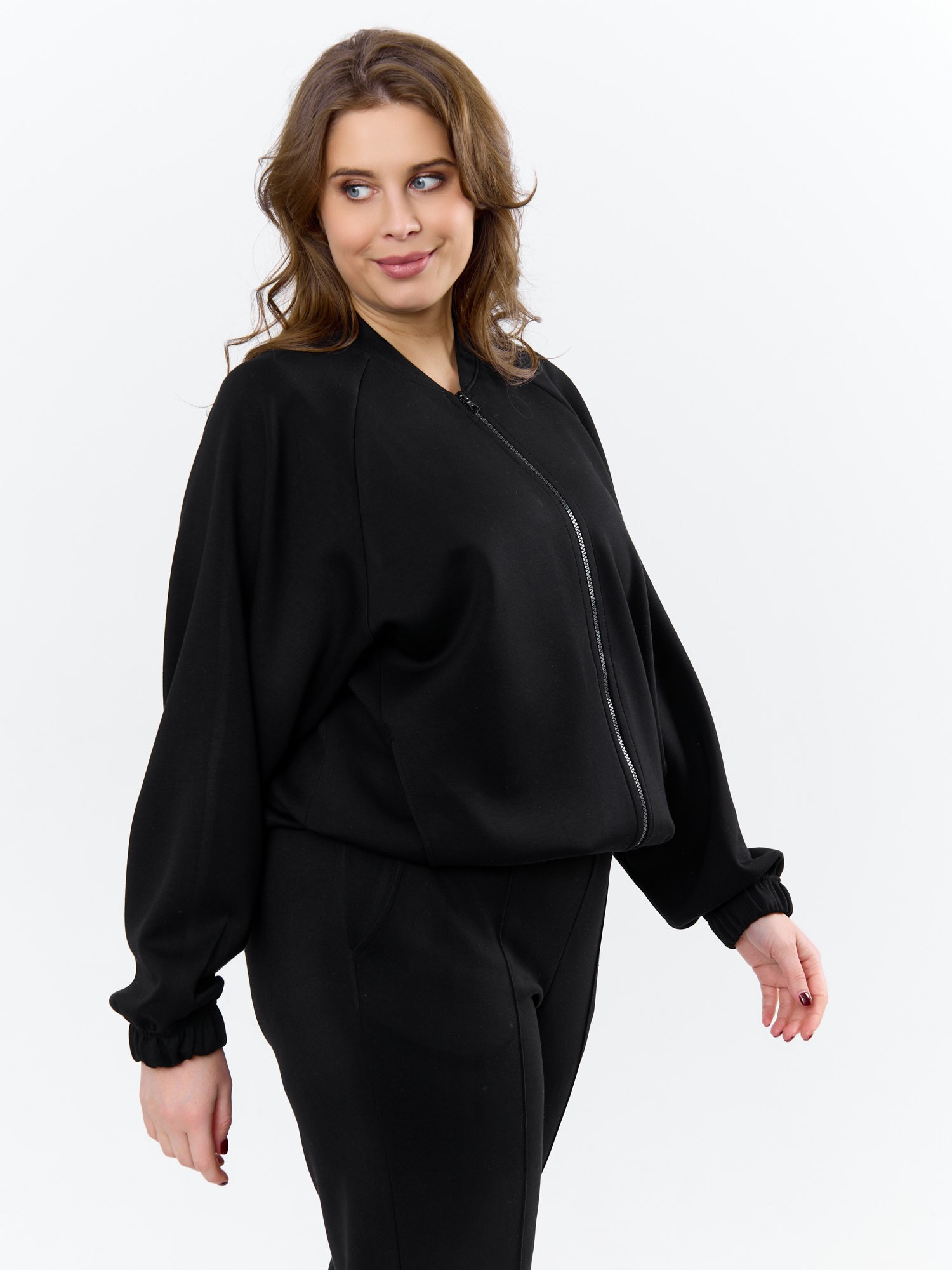 Куртка – бомбер женская из трикотажного гладкокрашеного полотна «скуба» свободная, с горловиной овальной формы обработанной втачной планкой, длинными рукавами кроя «реглан», обработанными подгибкой с эластичной тесьмой внутри, центральной бортовой застежкой на тесьму «молния». На полочке в рельефных швах выполнены карманы. Низ изделия обработан подгибкой с широкой эластичной тесьмой внутри.