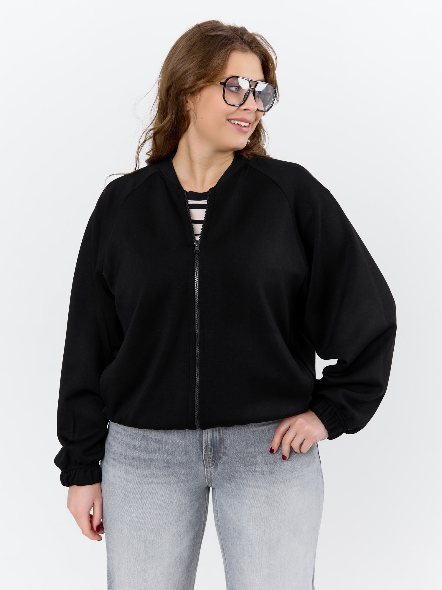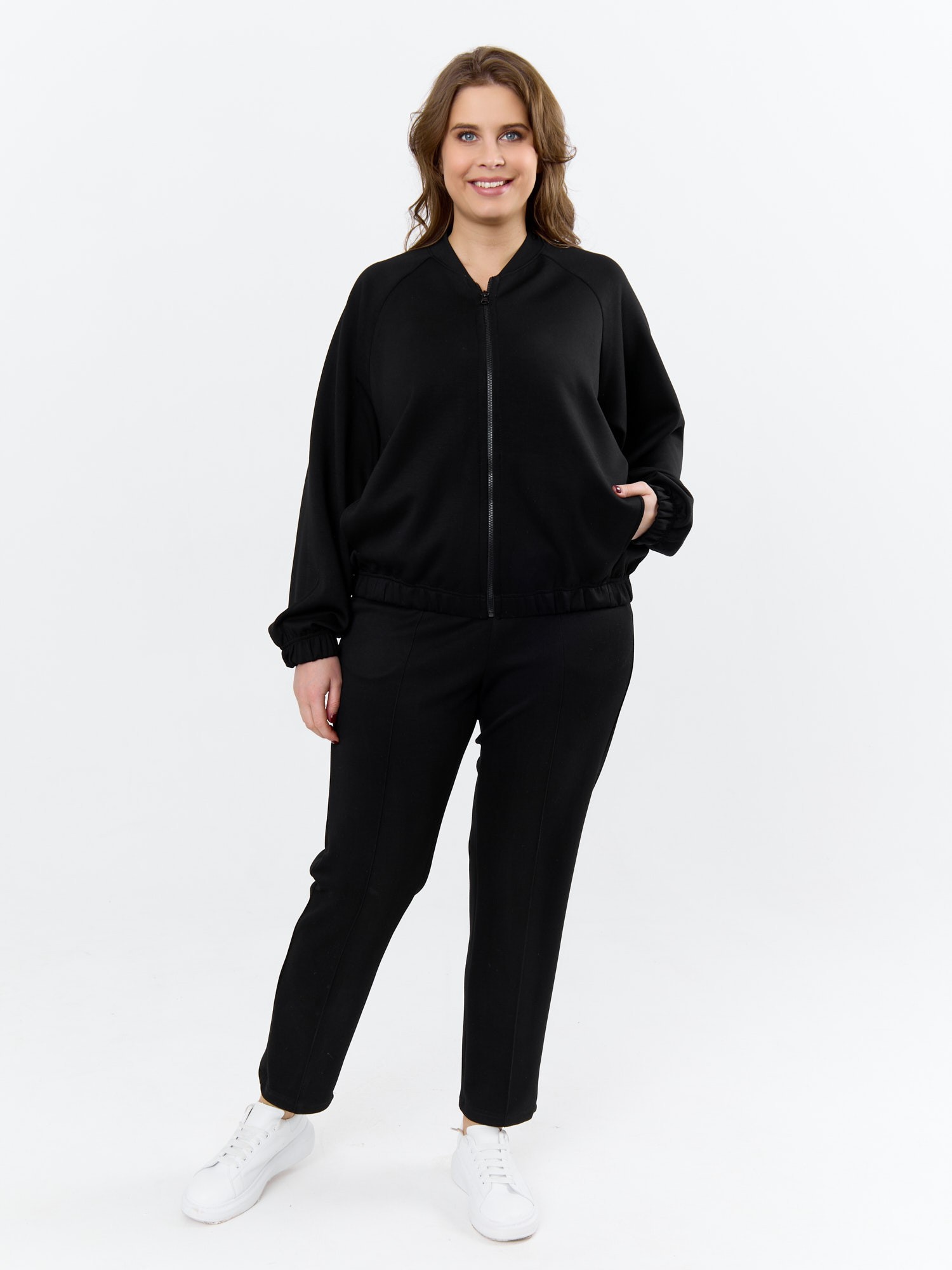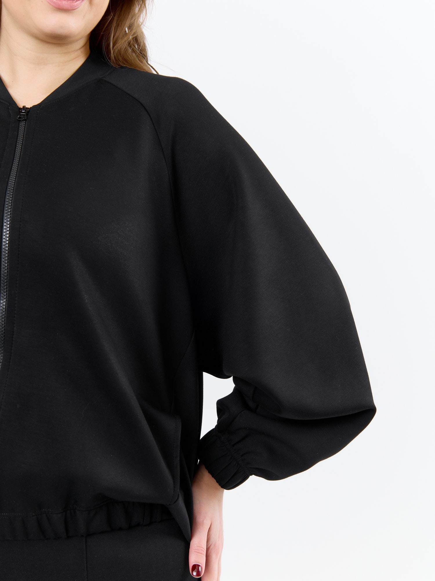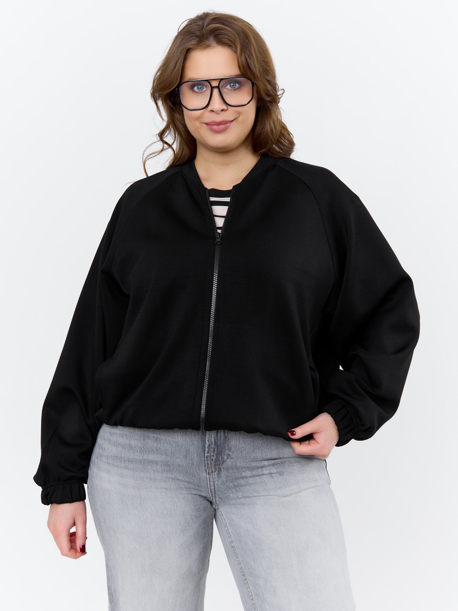 Куртка – бомбер женская из трикотажного гладкокрашеного полотна «скуба» свободная, с горловиной овальной формы обработанной втачной планкой, длинными рукавами кроя «реглан», обработанными подгибкой с эластичной тесьмой внутри, центральной бортовой застежкой на тесьму «молния». На полочке в рельефных швах выполнены карманы. Низ изделия обработан подгибкой с широкой эластичной тесьмой внутри.