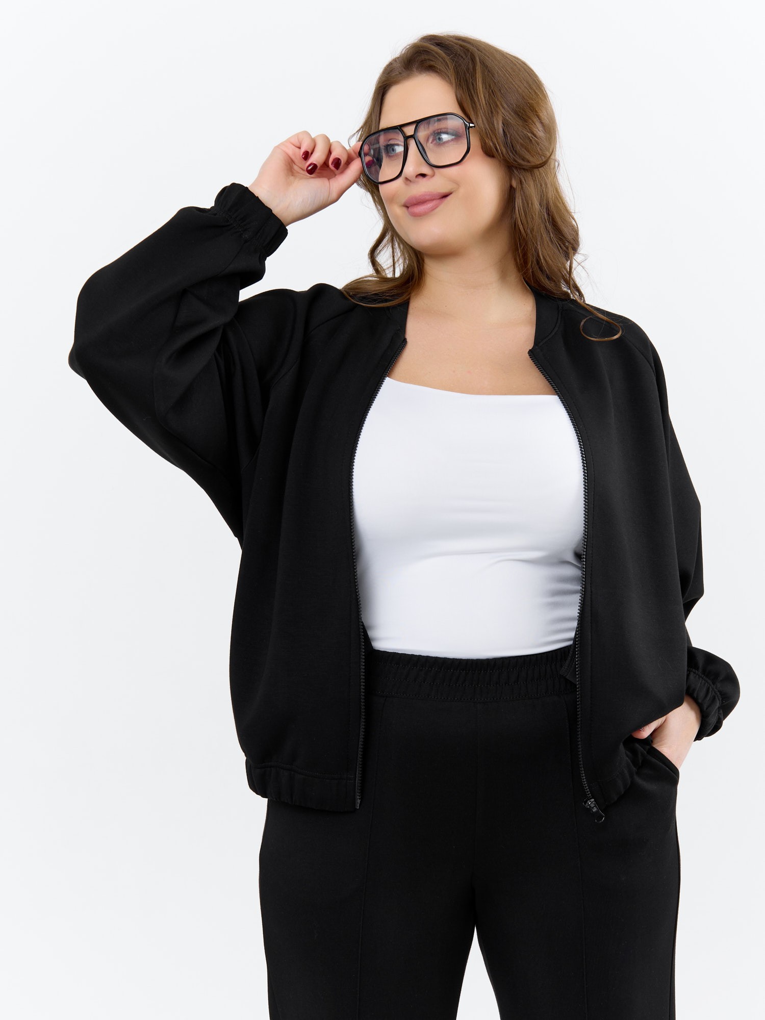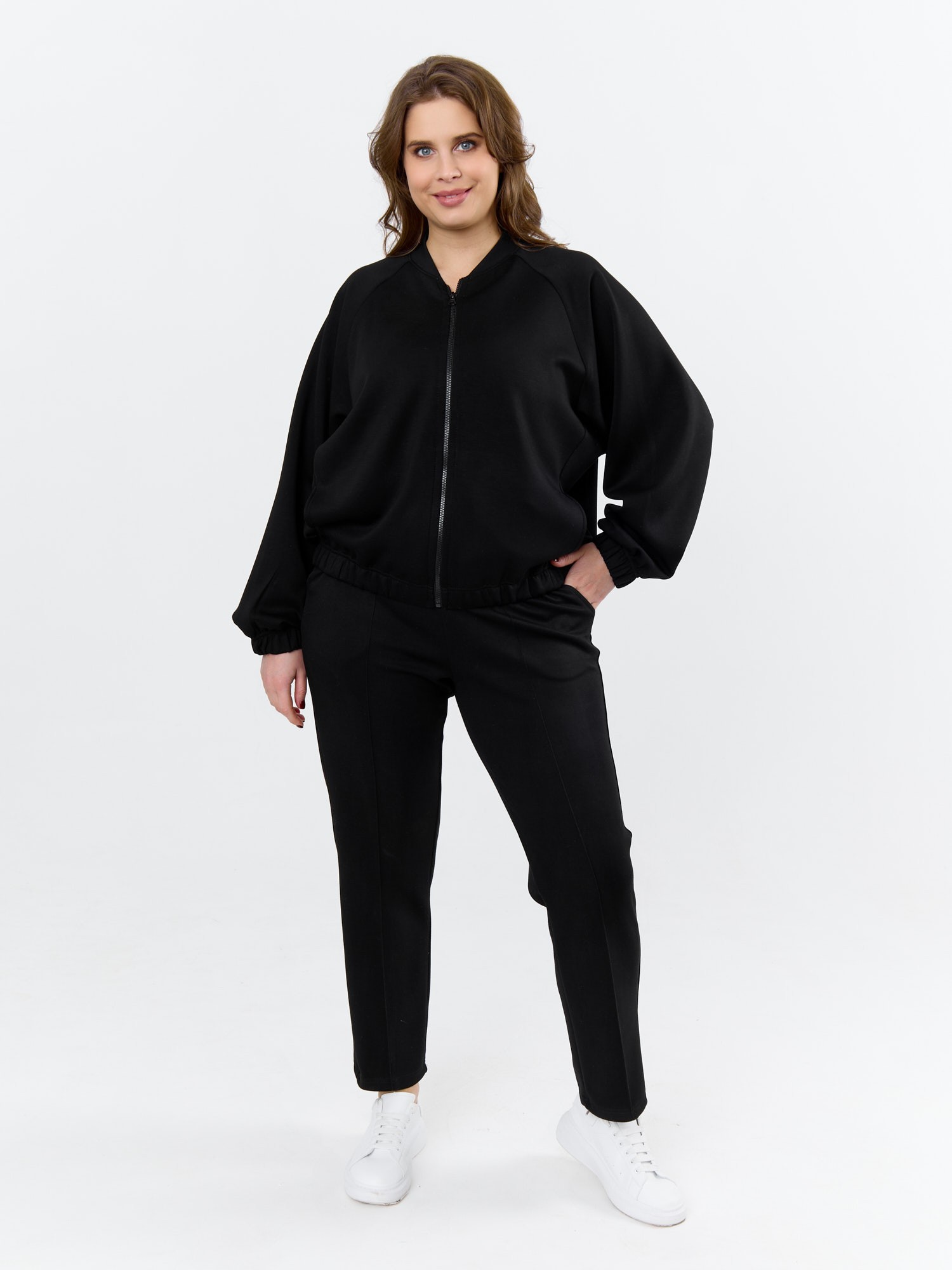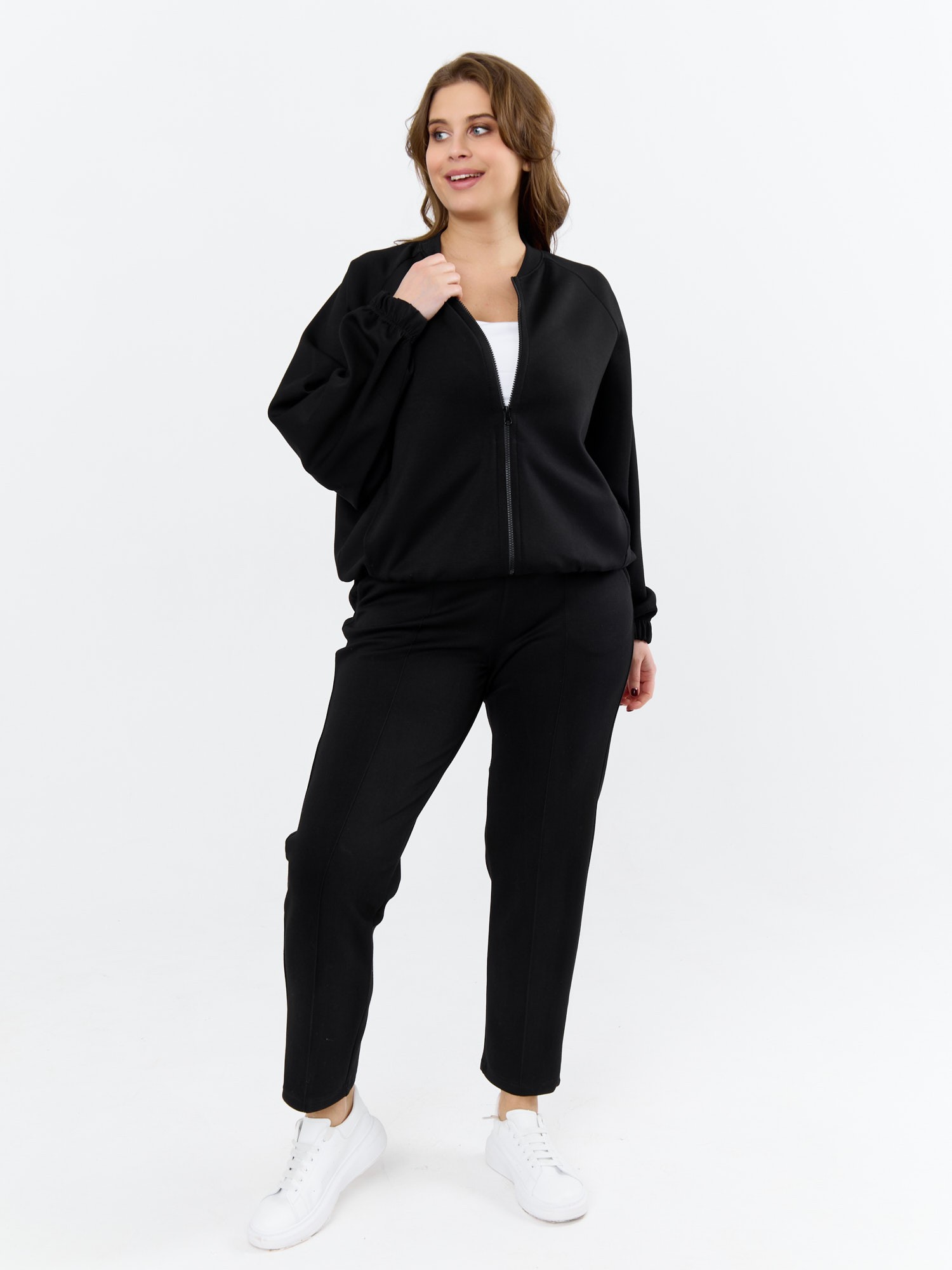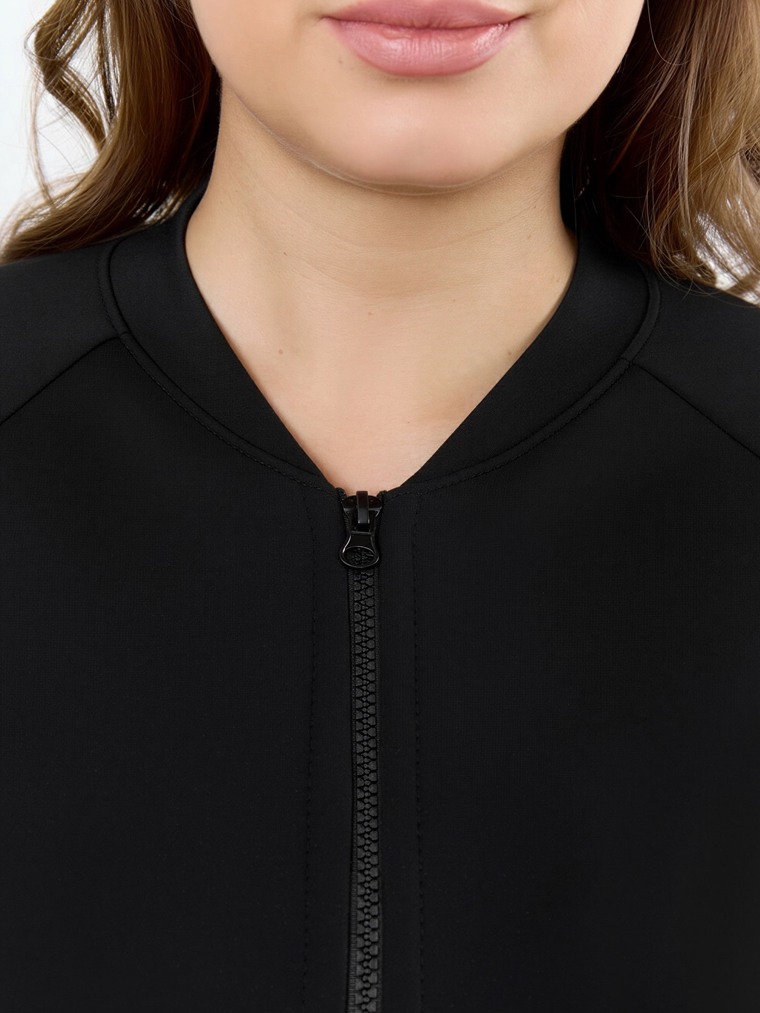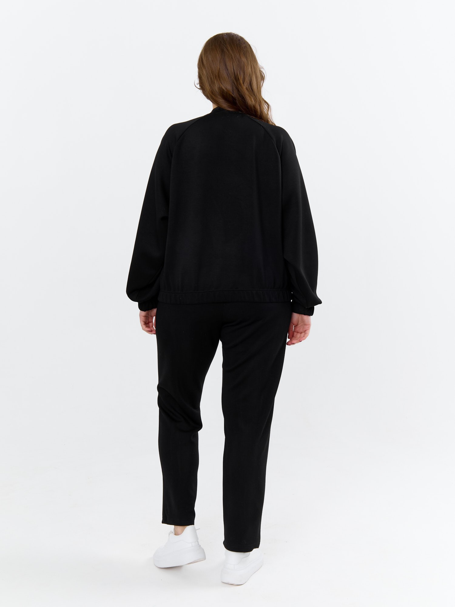 Куртка – бомбер женская из трикотажного гладкокрашеного полотна «скуба» свободная, с горловиной овальной формы обработанной втачной планкой, длинными рукавами кроя «реглан», обработанными подгибкой с эластичной тесьмой внутри, центральной бортовой застежкой на тесьму «молния». На полочке в рельефных швах выполнены карманы. Низ изделия обработан подгибкой с широкой эластичной тесьмой внутри.