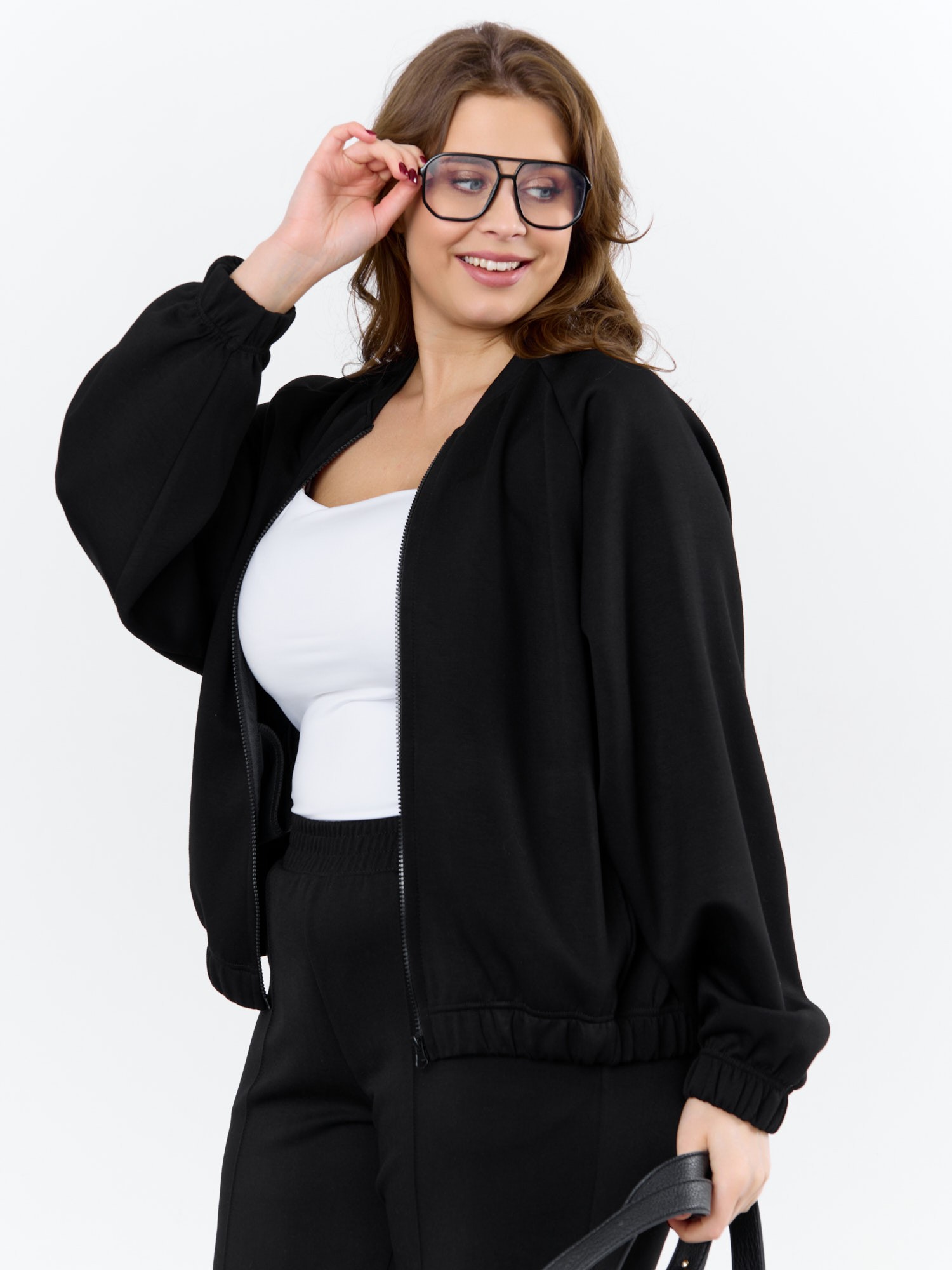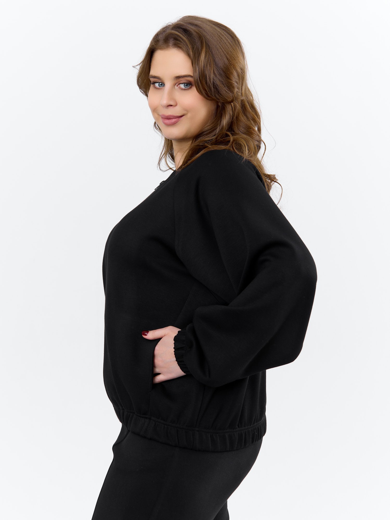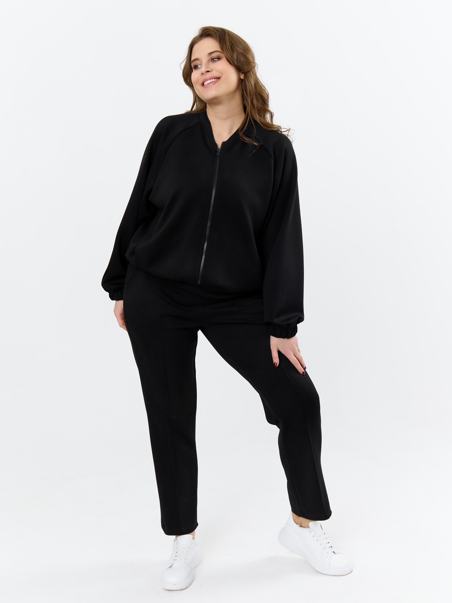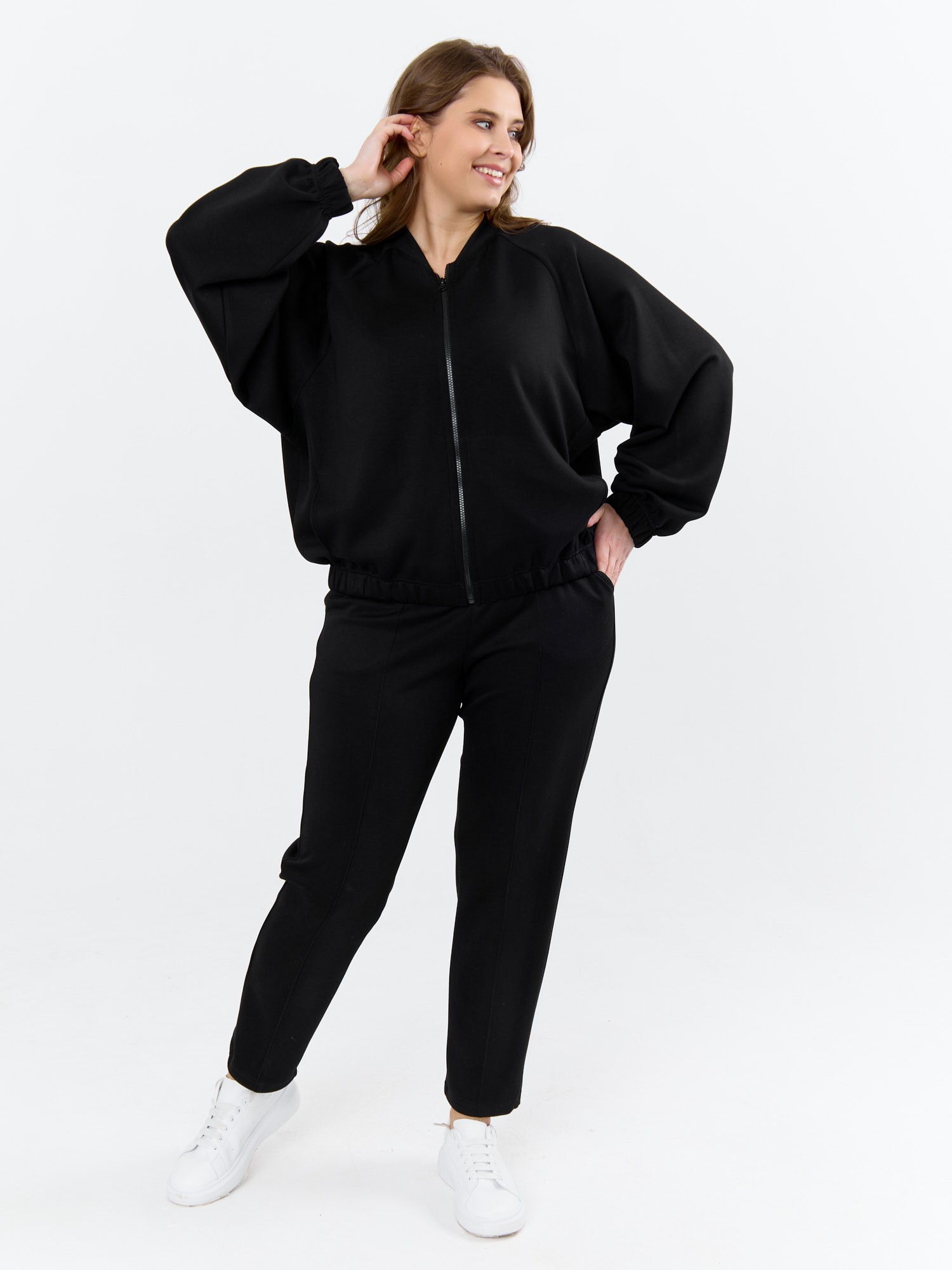 Куртка – бомбер женская из трикотажного гладкокрашеного полотна «скуба» свободная, с горловиной овальной формы обработанной втачной планкой, длинными рукавами кроя «реглан», обработанными подгибкой с эластичной тесьмой внутри, центральной бортовой застежкой на тесьму «молния». На полочке в рельефных швах выполнены карманы. Низ изделия обработан подгибкой с широкой эластичной тесьмой внутри.