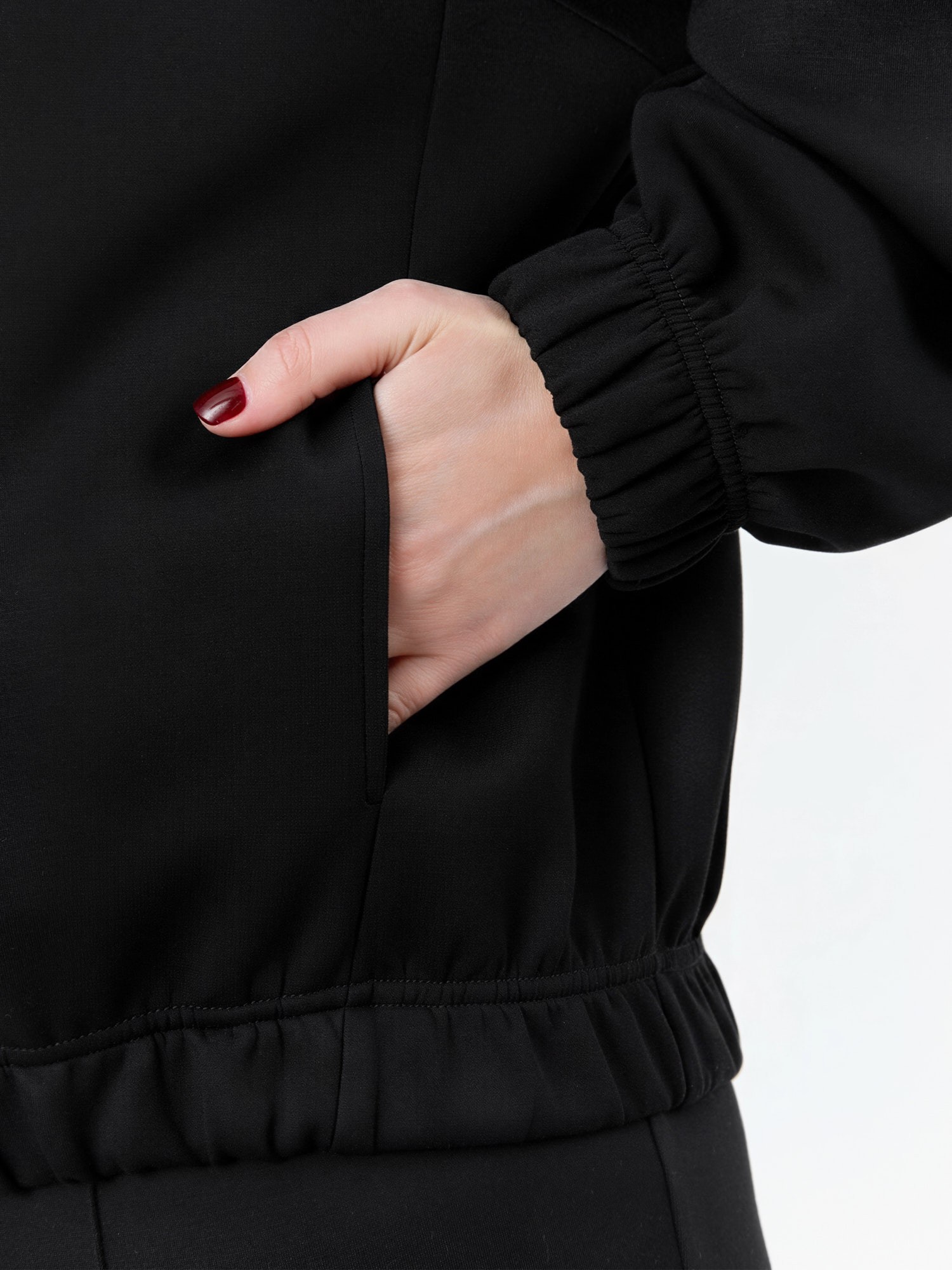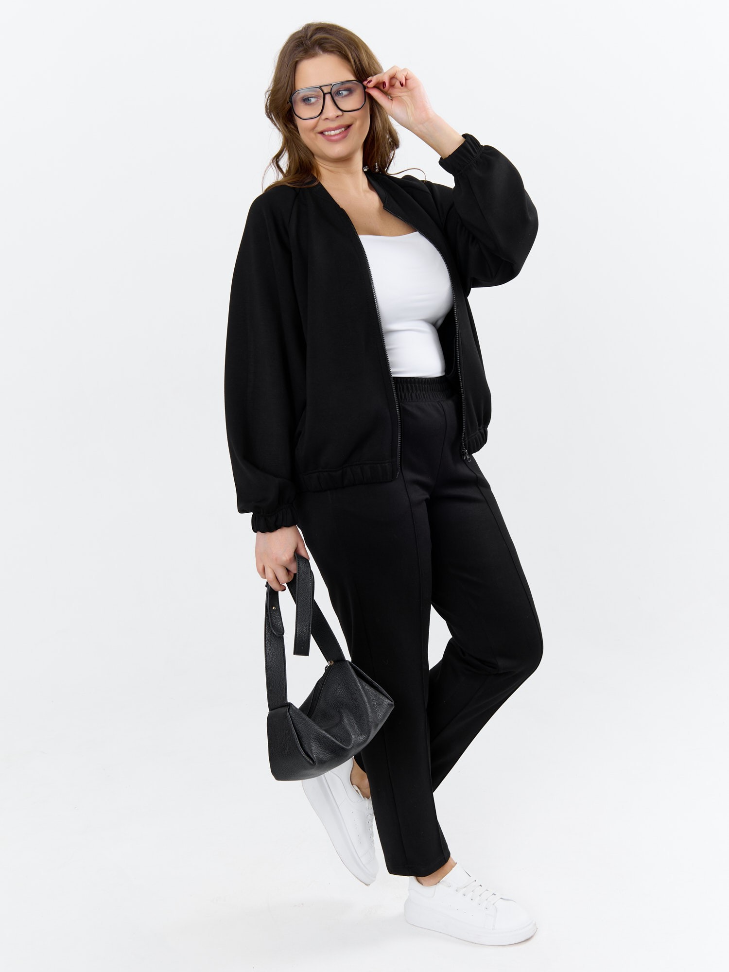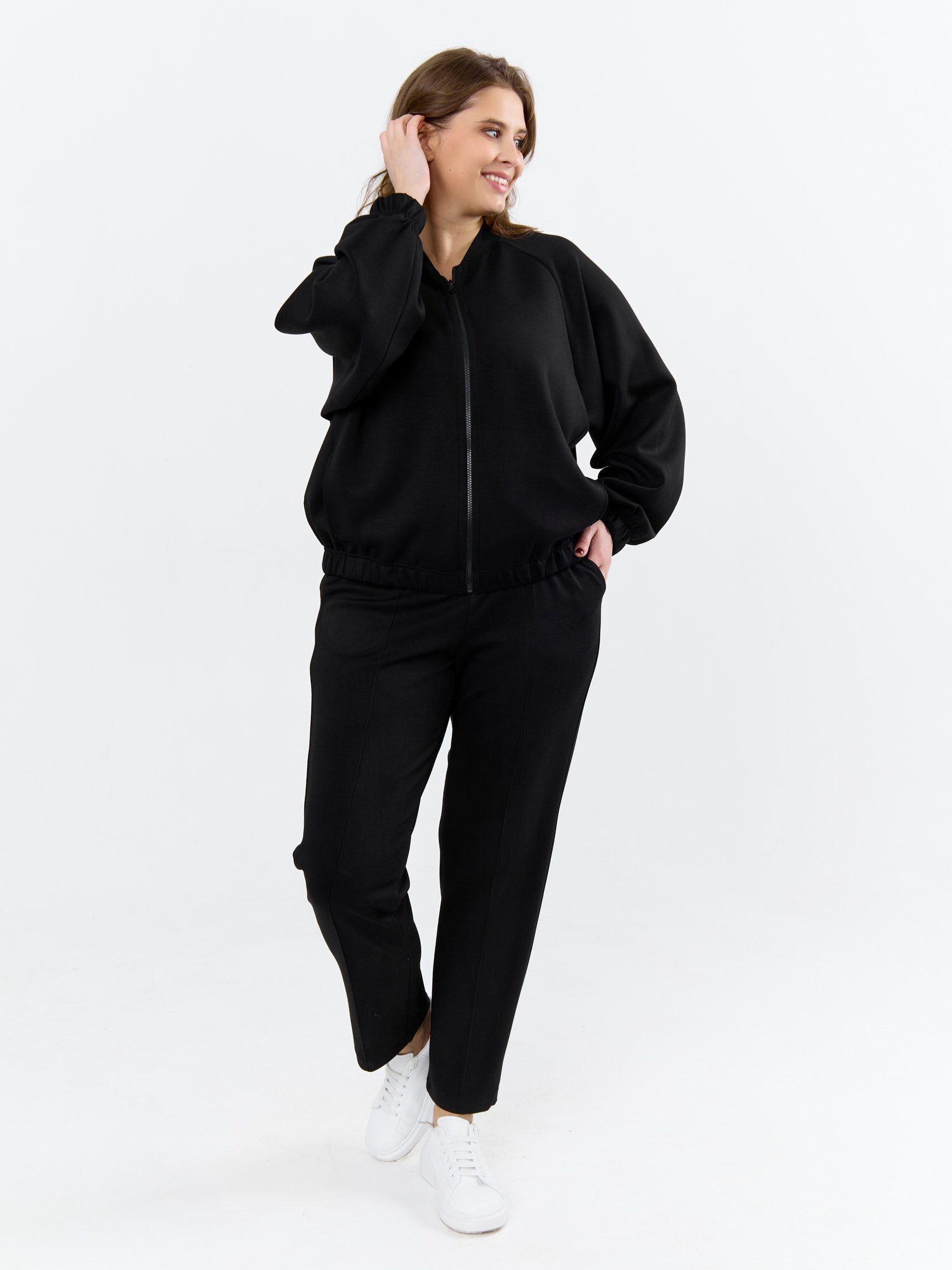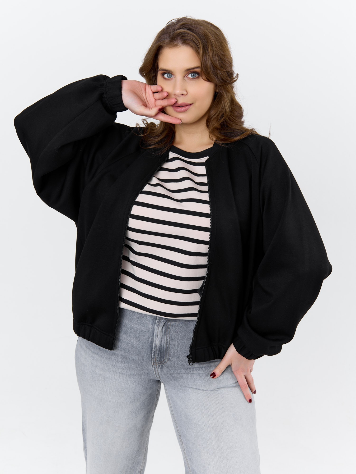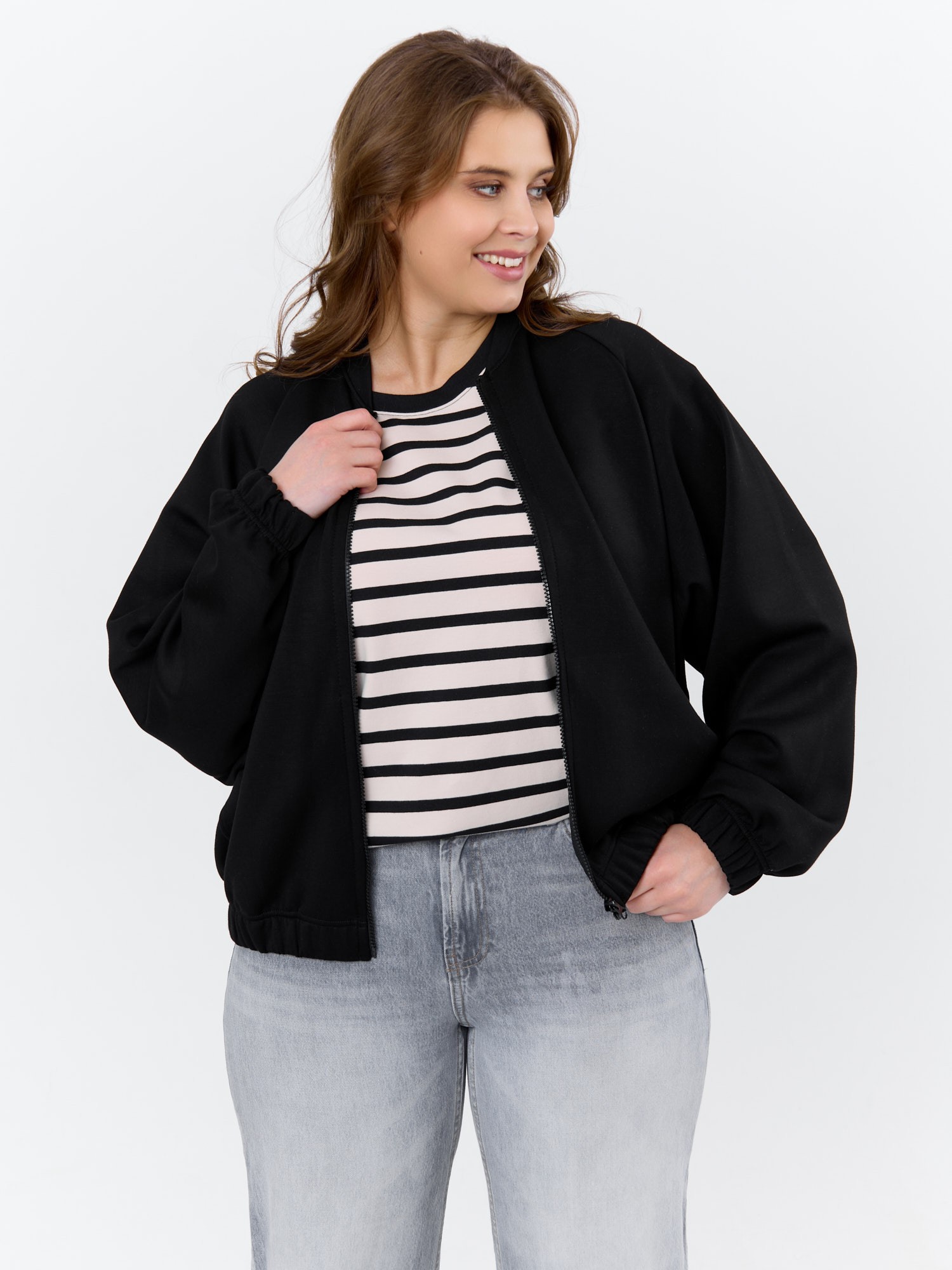 Куртка – бомбер женская из трикотажного гладкокрашеного полотна «скуба» свободная, с горловиной овальной формы обработанной втачной планкой, длинными рукавами кроя «реглан», обработанными подгибкой с эластичной тесьмой внутри, центральной бортовой застежкой на тесьму «молния». На полочке в рельефных швах выполнены карманы. Низ изделия обработан подгибкой с широкой эластичной тесьмой внутри.