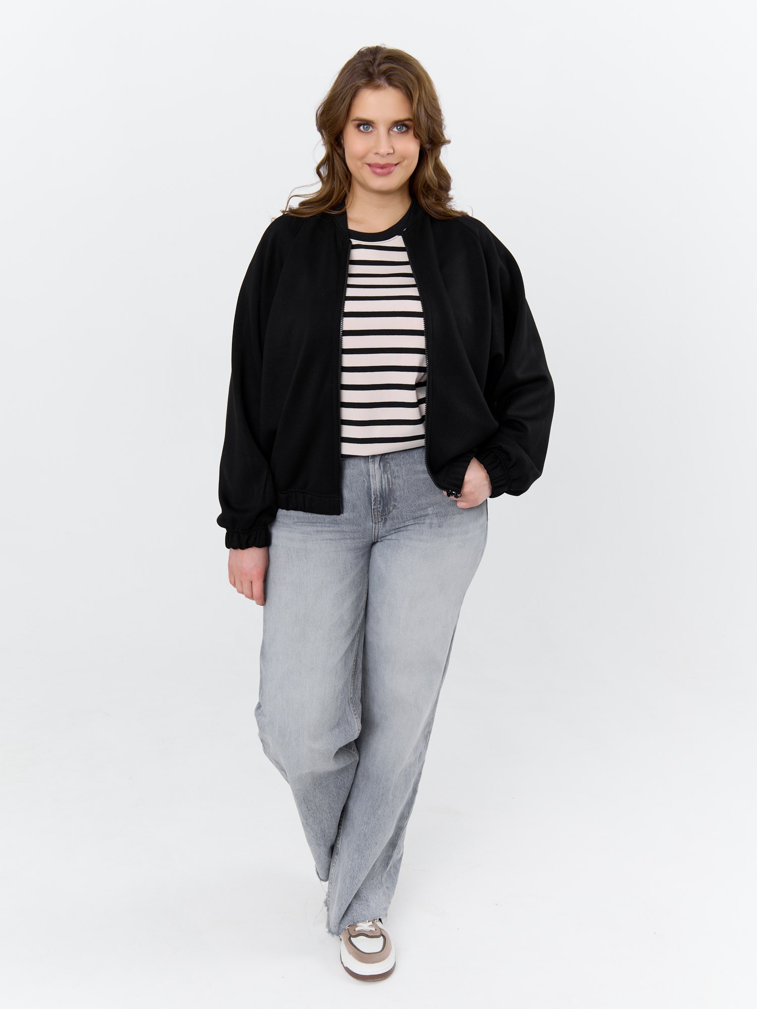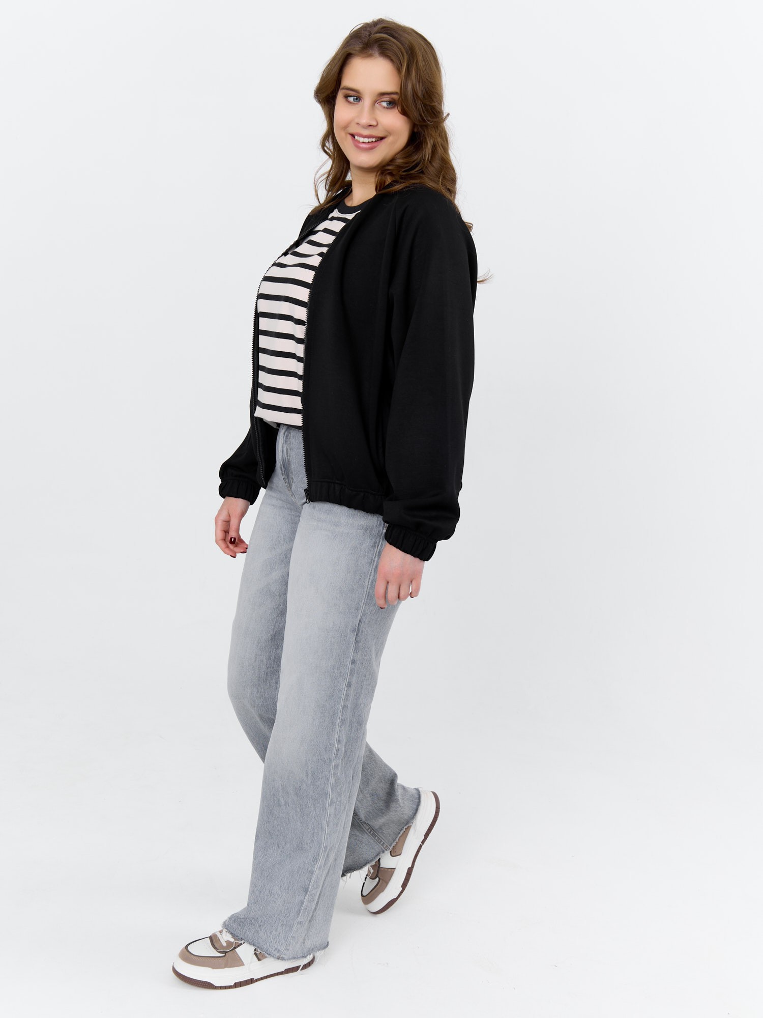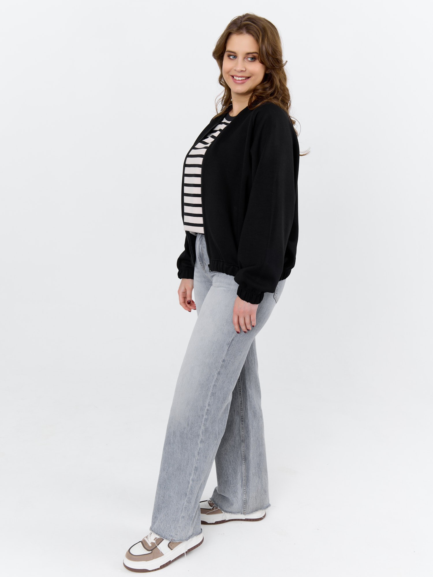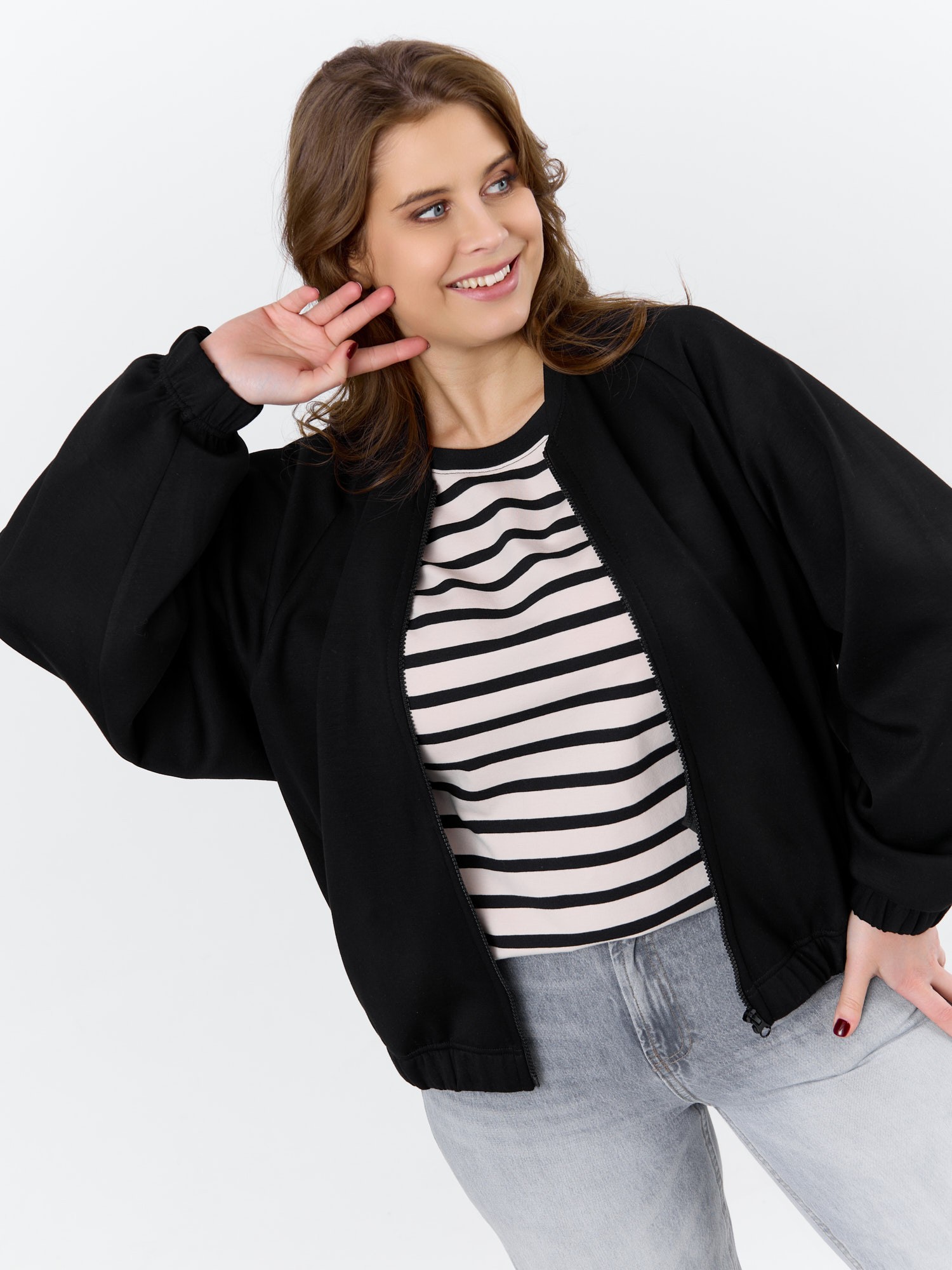 Куртка – бомбер женская из трикотажного гладкокрашеного полотна «скуба» свободная, с горловиной овальной формы обработанной втачной планкой, длинными рукавами кроя «реглан», обработанными подгибкой с эластичной тесьмой внутри, центральной бортовой застежкой на тесьму «молния». На полочке в рельефных швах выполнены карманы. Низ изделия обработан подгибкой с широкой эластичной тесьмой внутри.