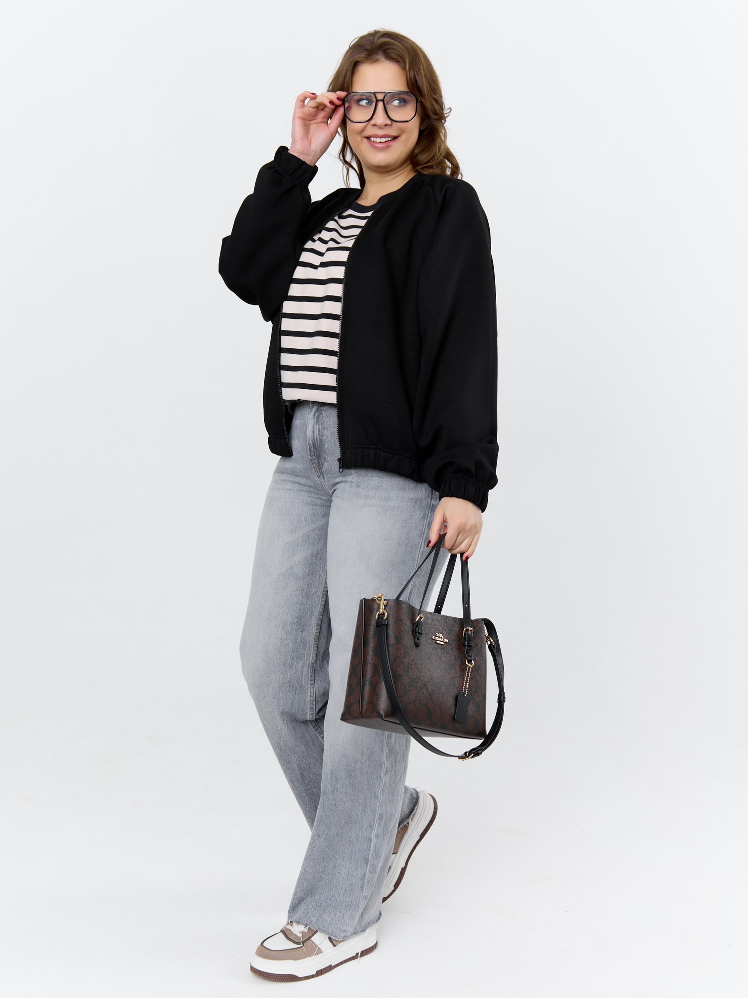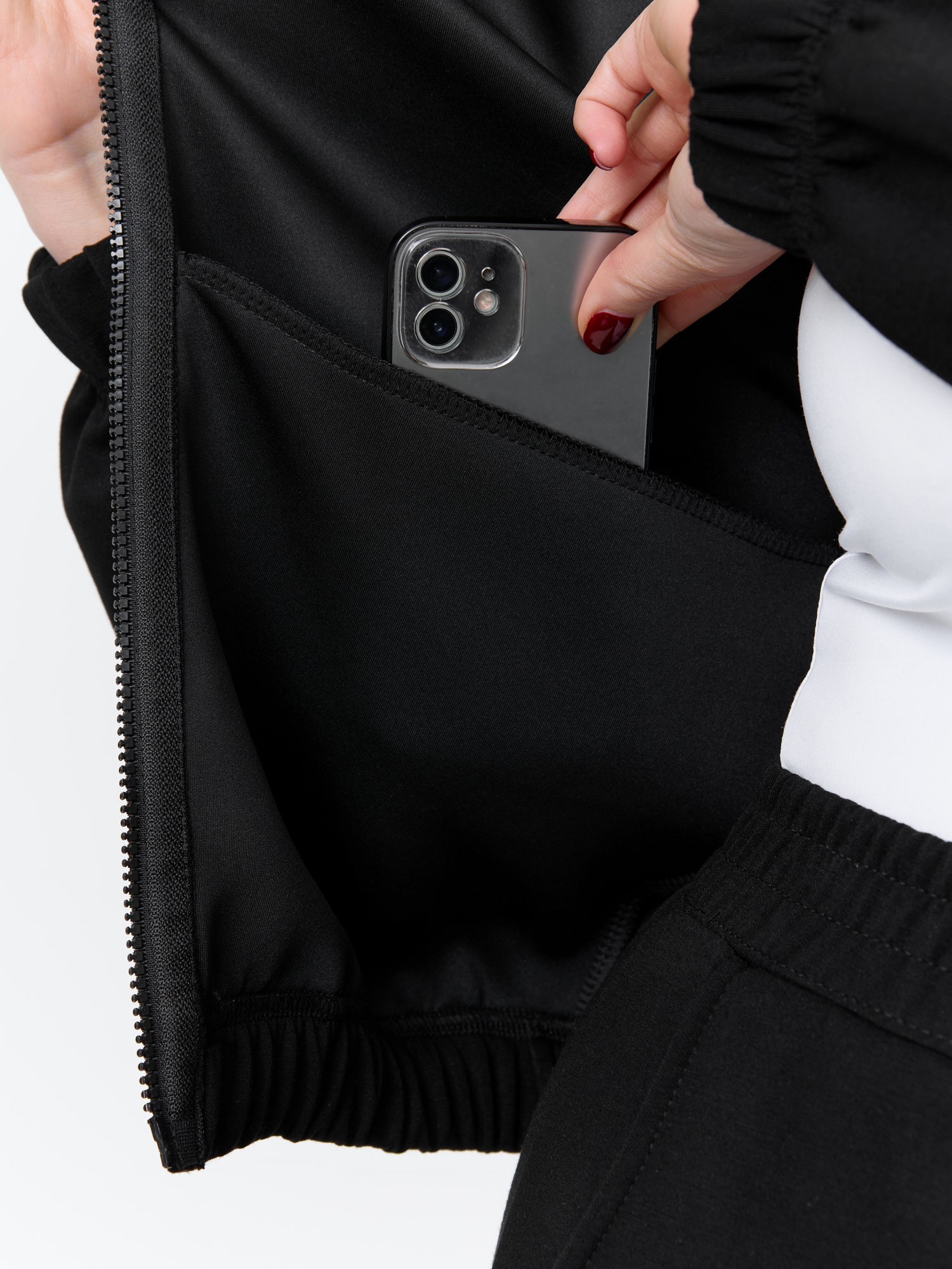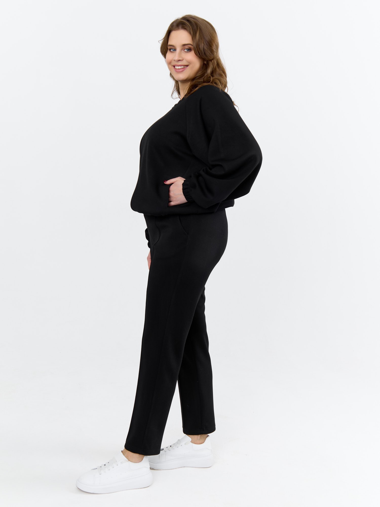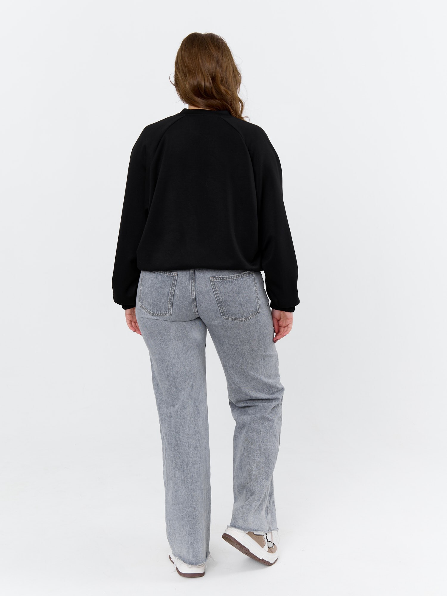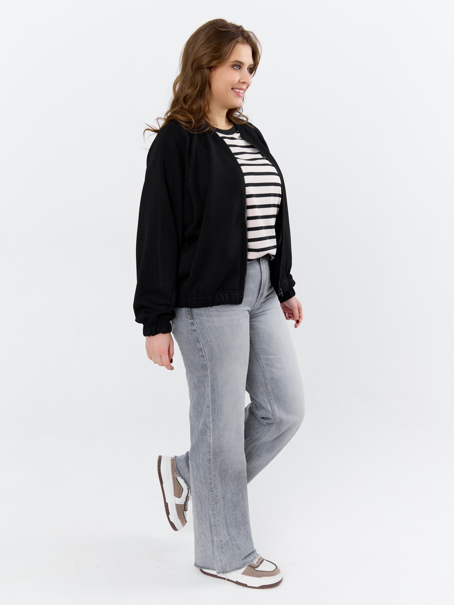 Куртка – бомбер женская из трикотажного гладкокрашеного полотна «скуба» свободная, с горловиной овальной формы обработанной втачной планкой, длинными рукавами кроя «реглан», обработанными подгибкой с эластичной тесьмой внутри, центральной бортовой застежкой на тесьму «молния». На полочке в рельефных швах выполнены карманы. Низ изделия обработан подгибкой с широкой эластичной тесьмой внутри.