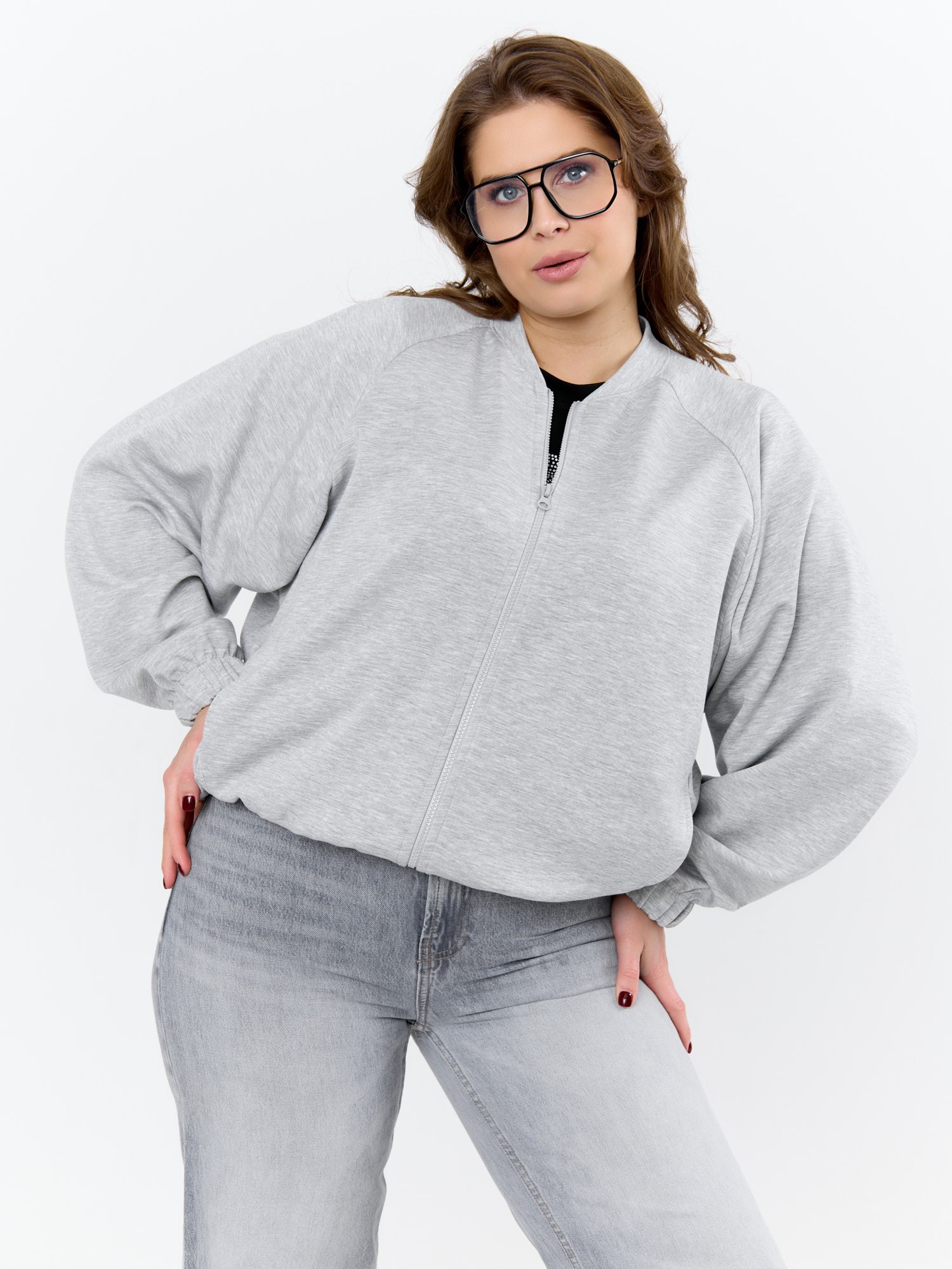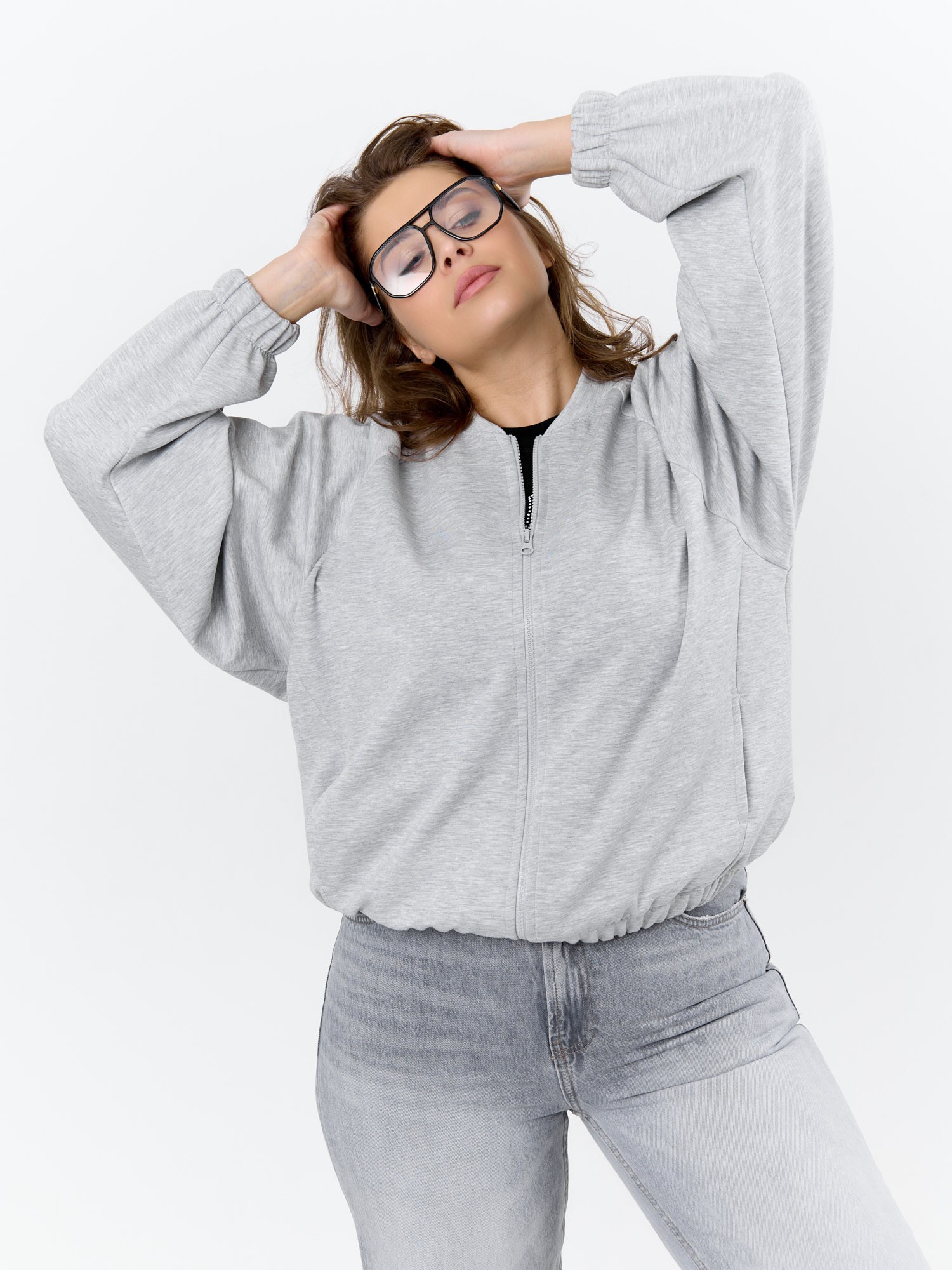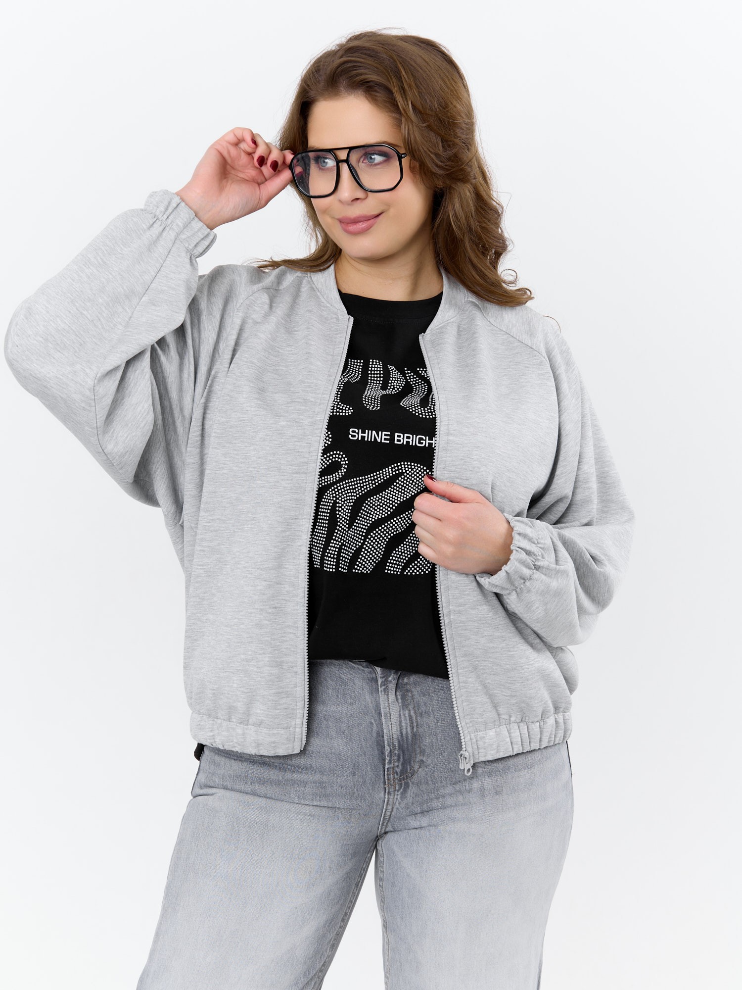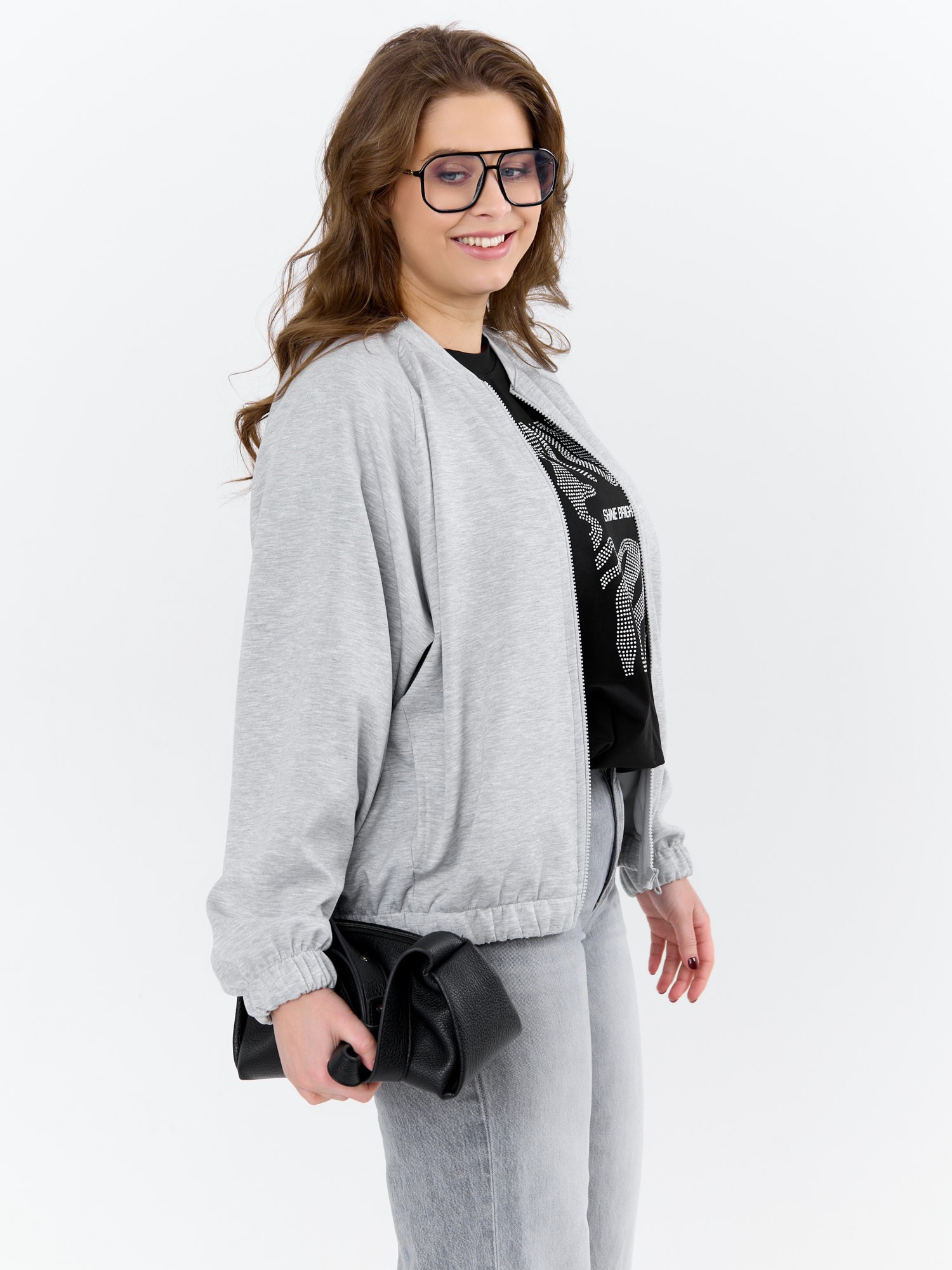 Куртка – бомбер женская из трикотажного гладкокрашеного полотна «скуба» свободная, с горловиной овальной формы обработанной втачной планкой, длинными рукавами кроя «реглан», обработанными подгибкой с эластичной тесьмой внутри, центральной бортовой застежкой на тесьму «молния». На полочке в рельефных швах выполнены карманы. Низ изделия обработан подгибкой с широкой эластичной тесьмой внутри.