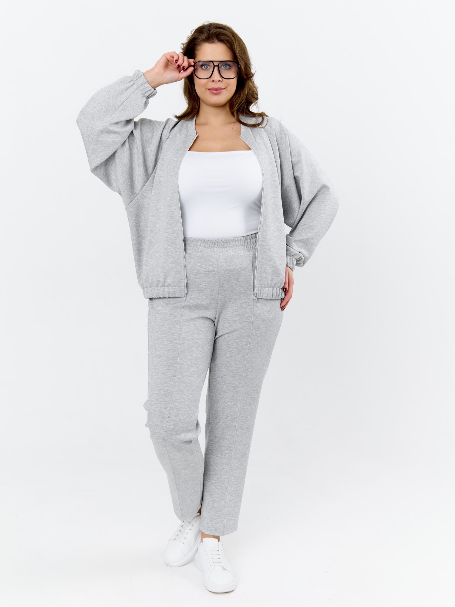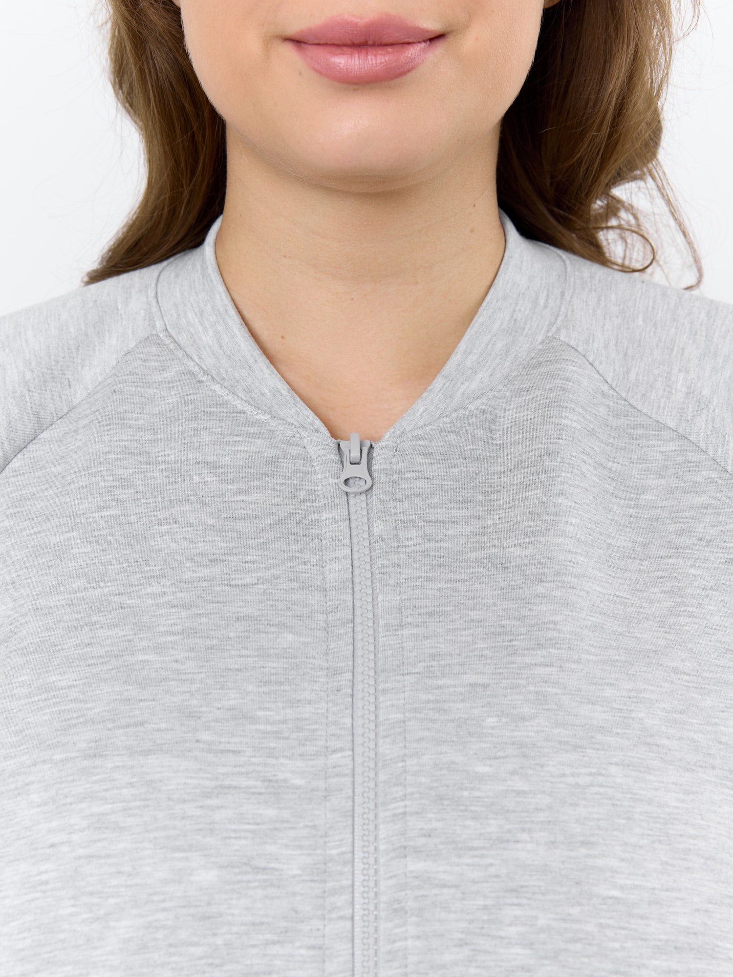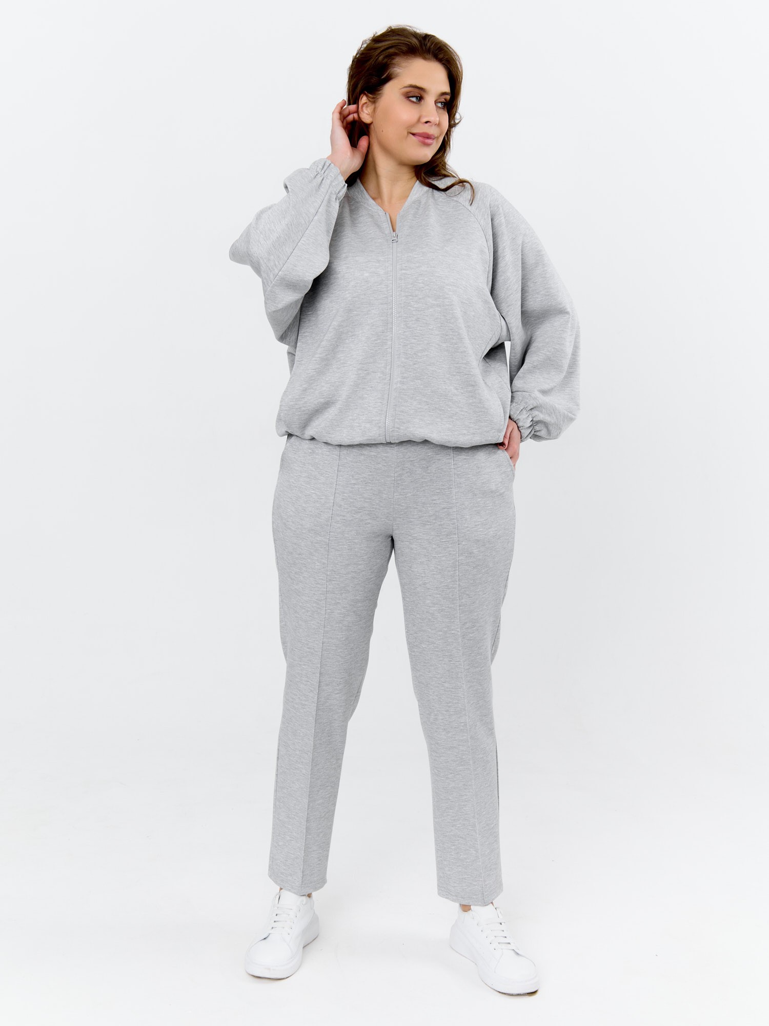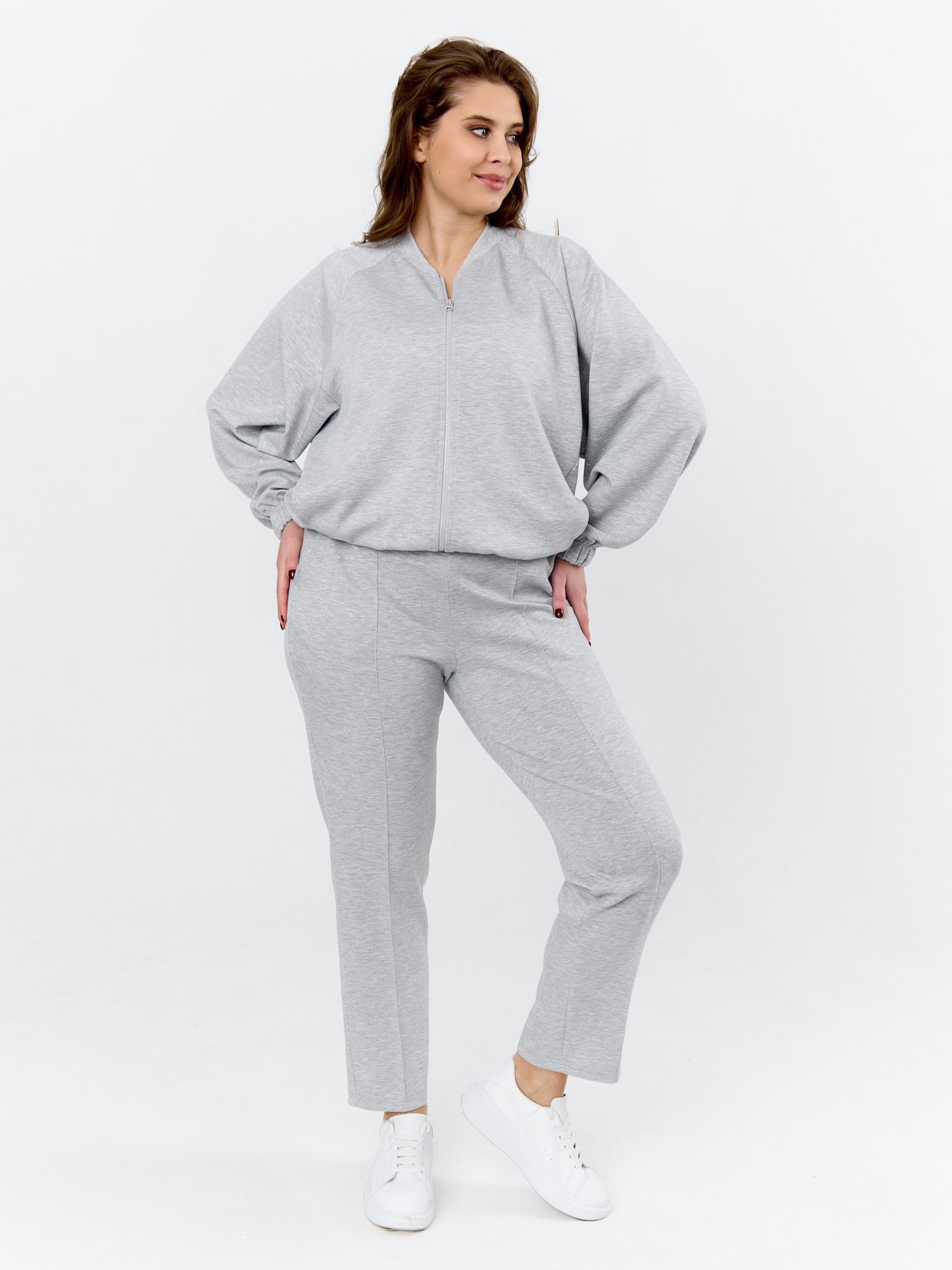 Куртка – бомбер женская из трикотажного гладкокрашеного полотна «скуба» свободная, с горловиной овальной формы обработанной втачной планкой, длинными рукавами кроя «реглан», обработанными подгибкой с эластичной тесьмой внутри, центральной бортовой застежкой на тесьму «молния». На полочке в рельефных швах выполнены карманы. Низ изделия обработан подгибкой с широкой эластичной тесьмой внутри.