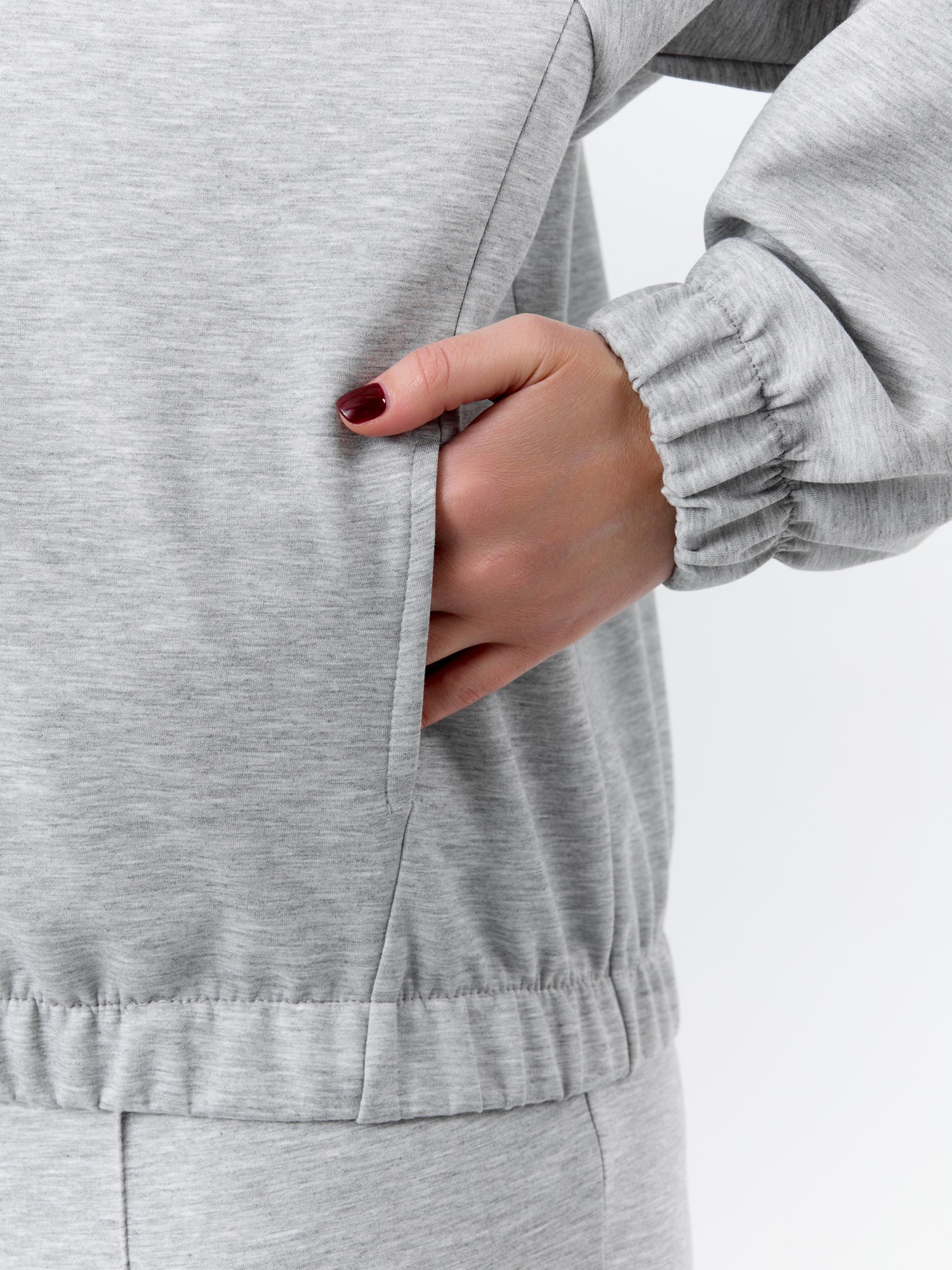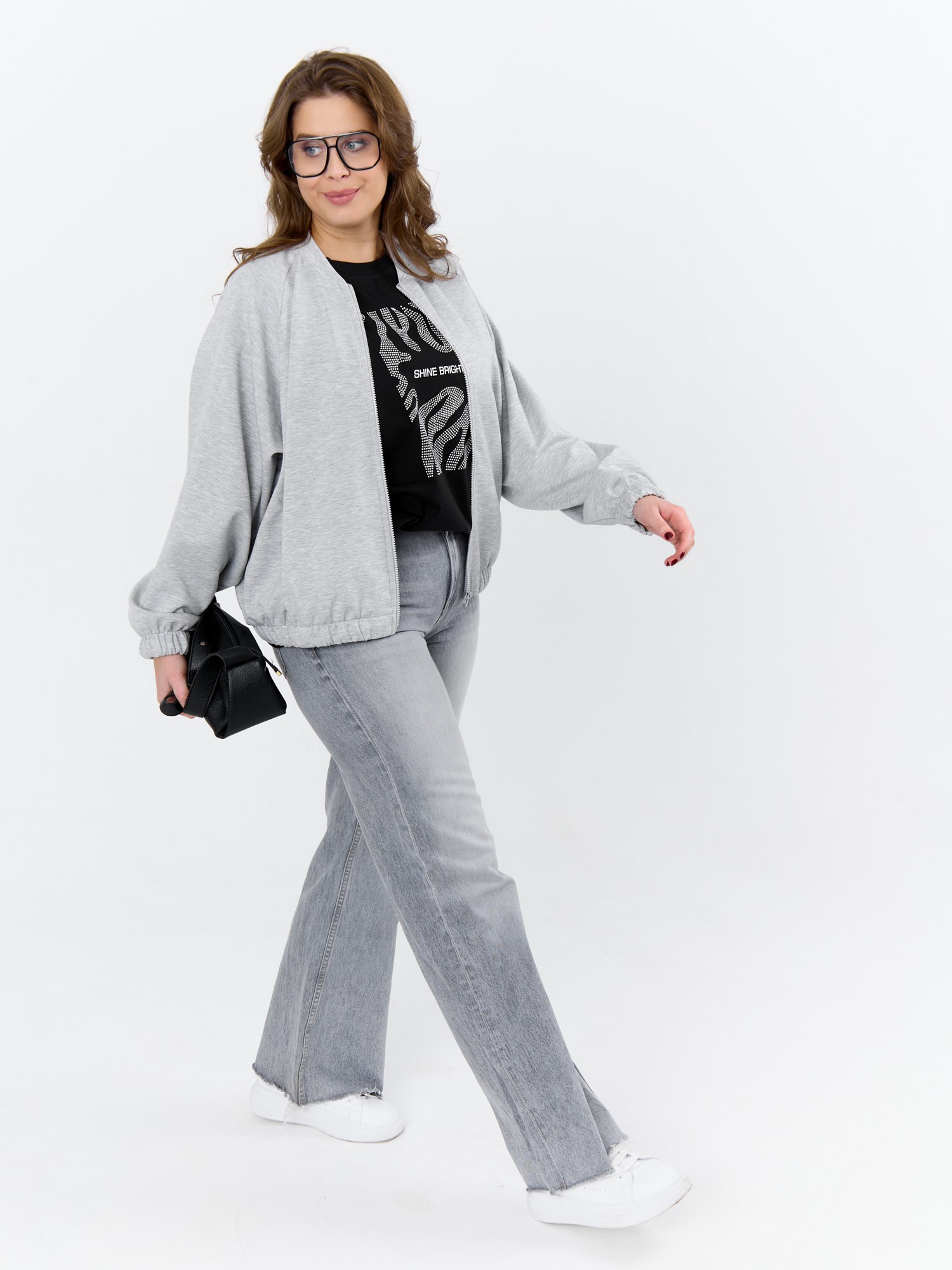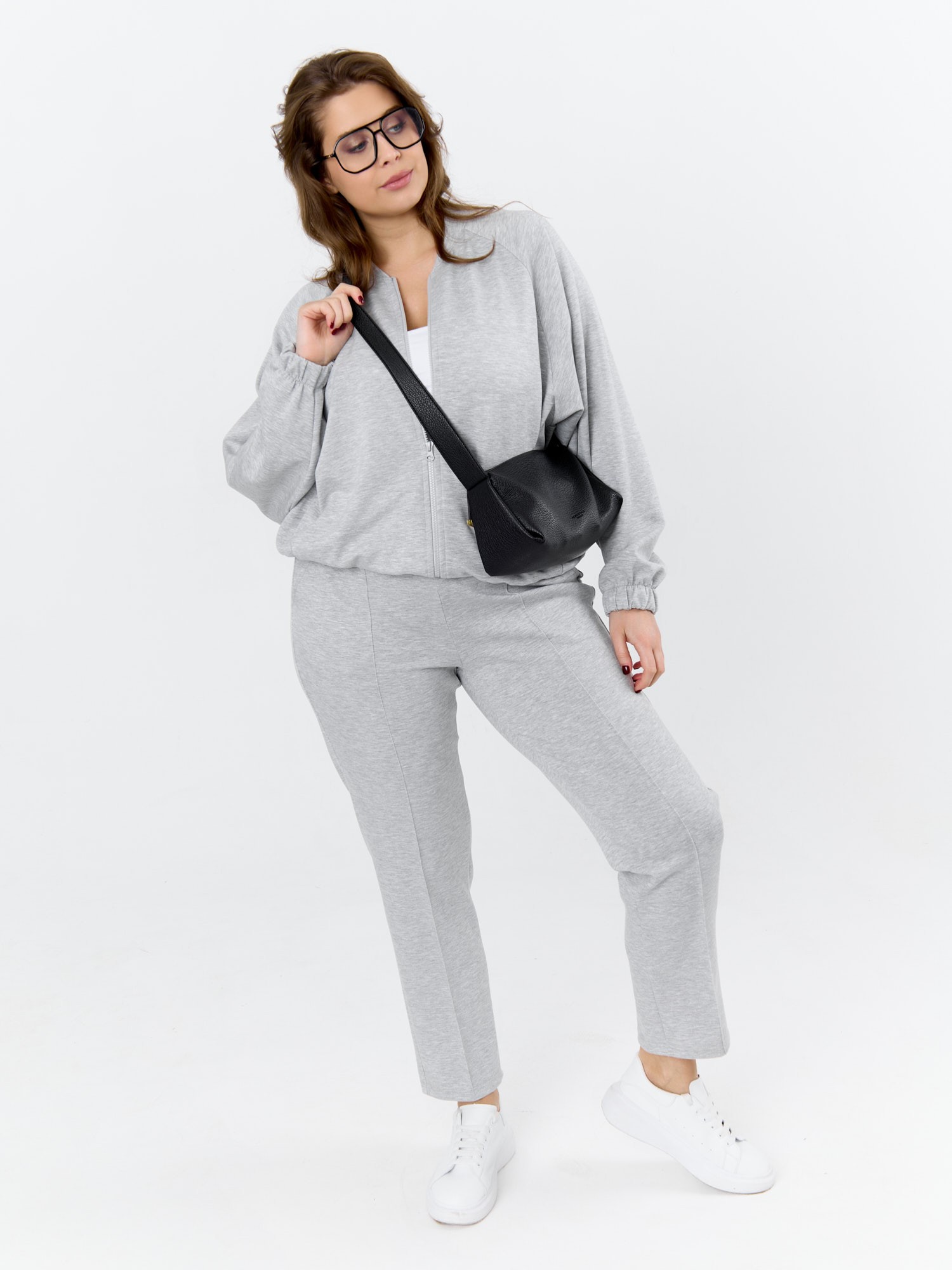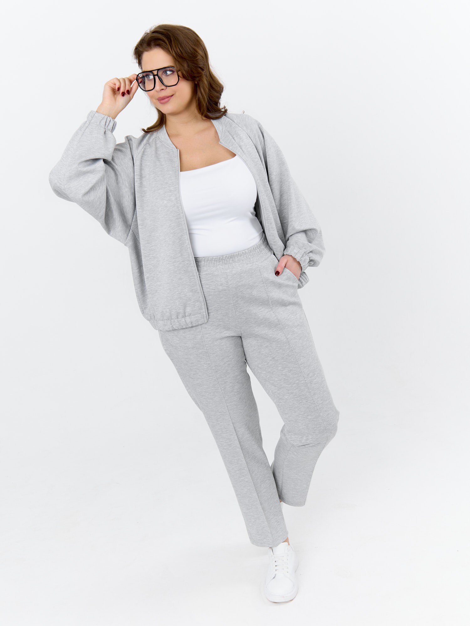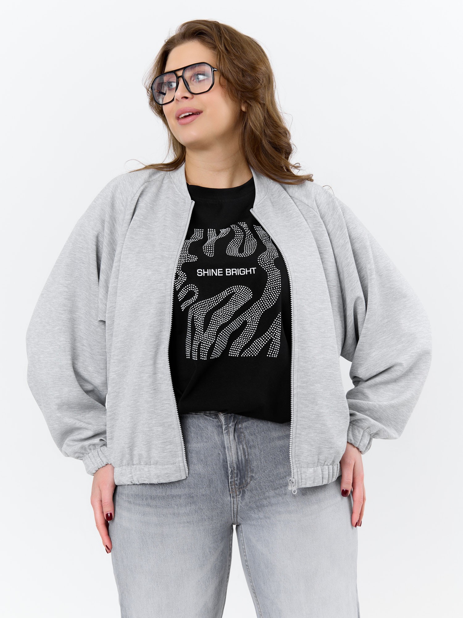 Куртка – бомбер женская из трикотажного гладкокрашеного полотна «скуба» свободная, с горловиной овальной формы обработанной втачной планкой, длинными рукавами кроя «реглан», обработанными подгибкой с эластичной тесьмой внутри, центральной бортовой застежкой на тесьму «молния». На полочке в рельефных швах выполнены карманы. Низ изделия обработан подгибкой с широкой эластичной тесьмой внутри.