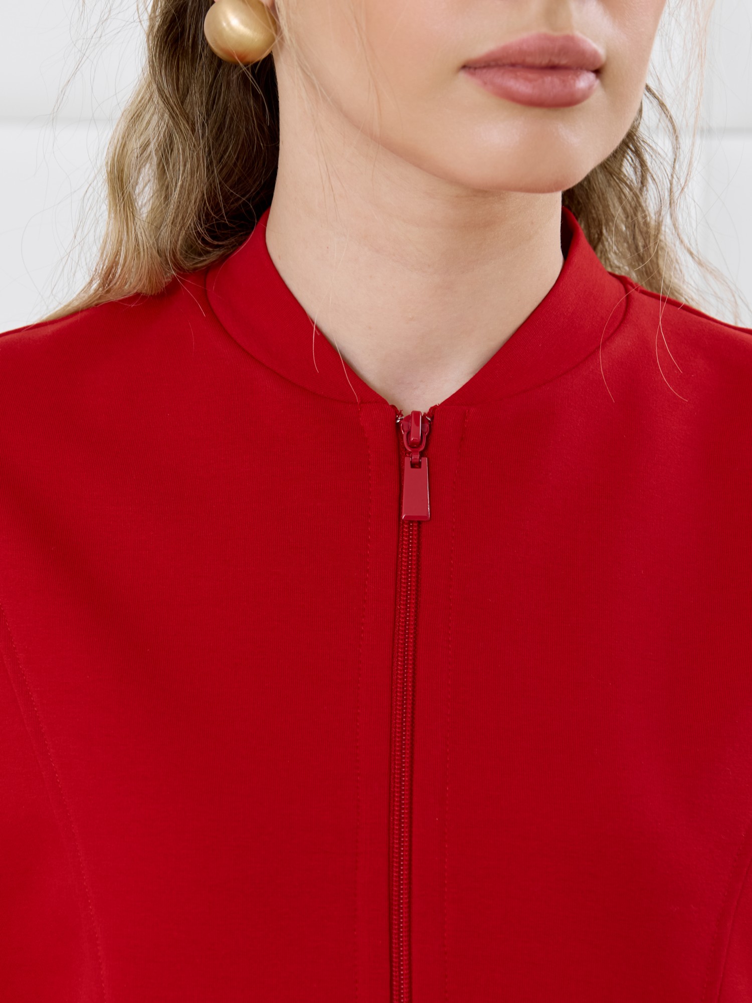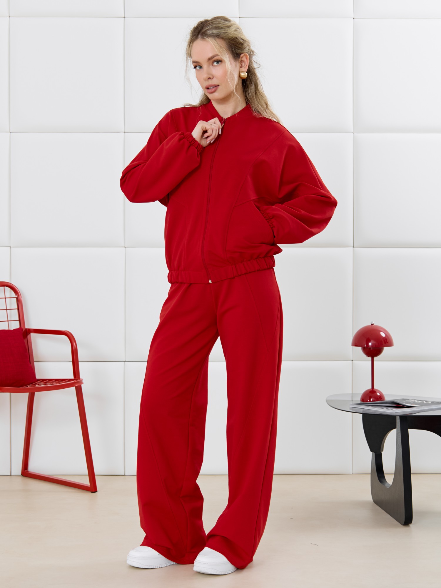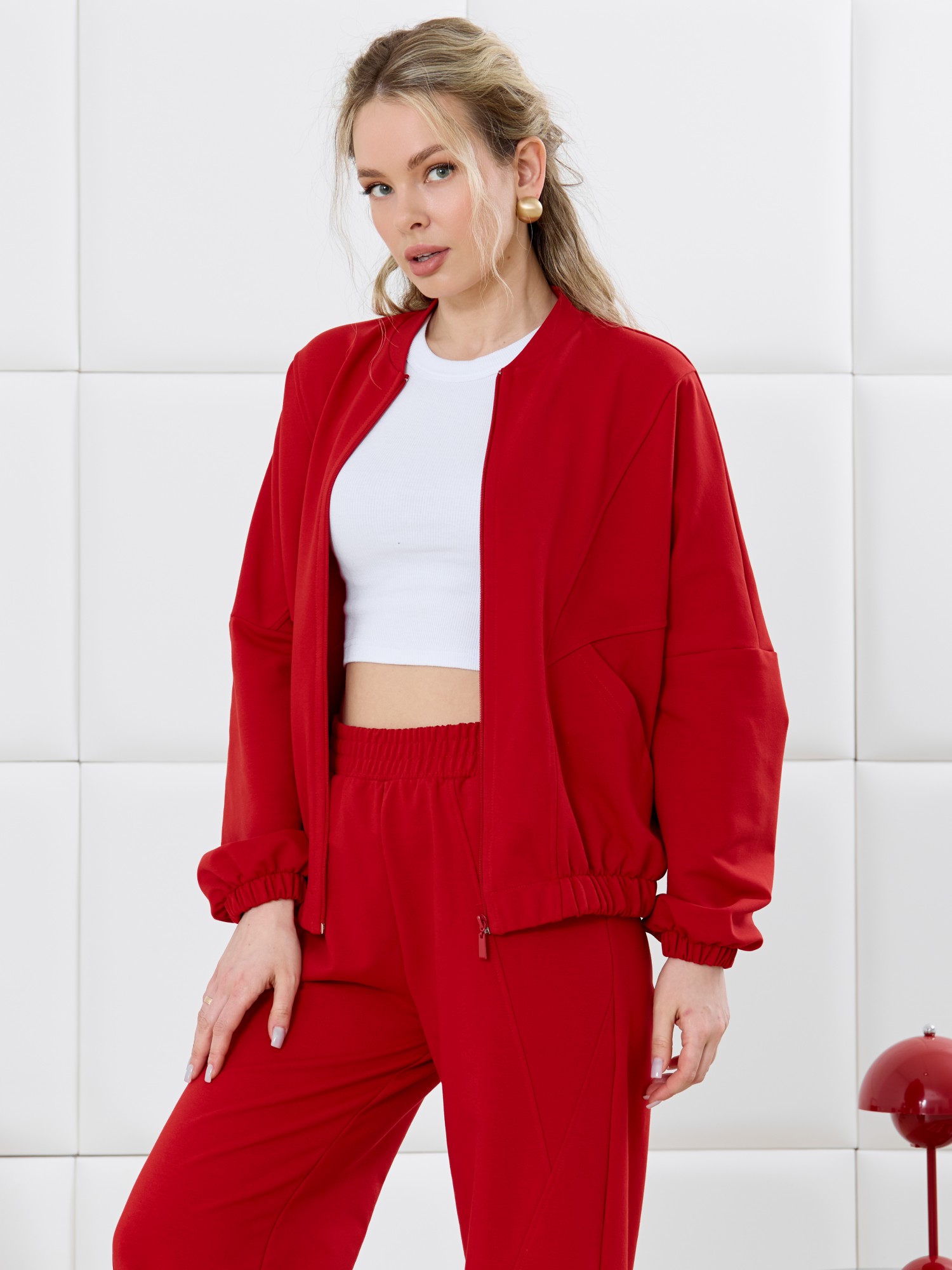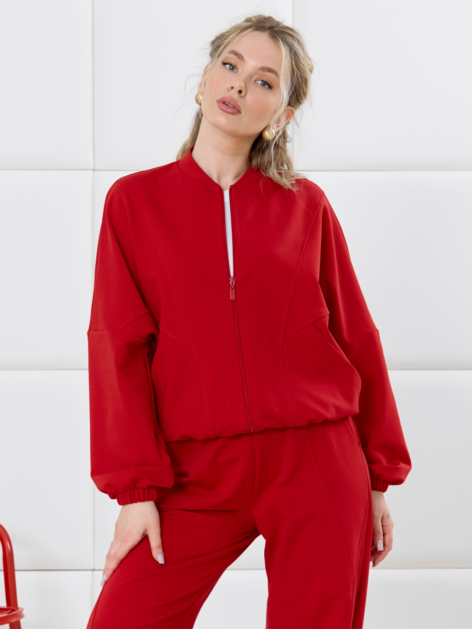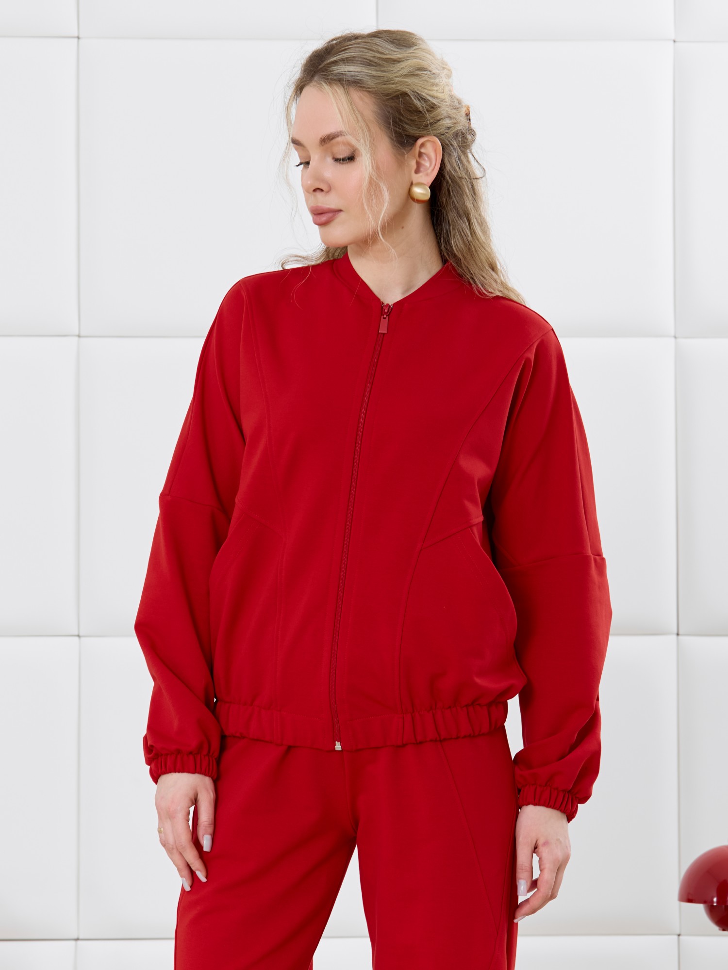 Куртка – бомбер молодежная из гладкокрашенного трикотажного полотна «футер» прямого силуэта, свободная, со спущенной линией плеча, длинными втачными рукавами и накладными карманами. Горловина овальной формы, обработана втачной планкой. Центральная бортовая застежка на тесьму «молния». Полочка состоит из трех деталей, две из которых скроены по косой, с отделочными строчками по шву стачивания. Низ изделия и нижние срезы рукавов обработаны подгибкой с эластичной тесьмой внутри.