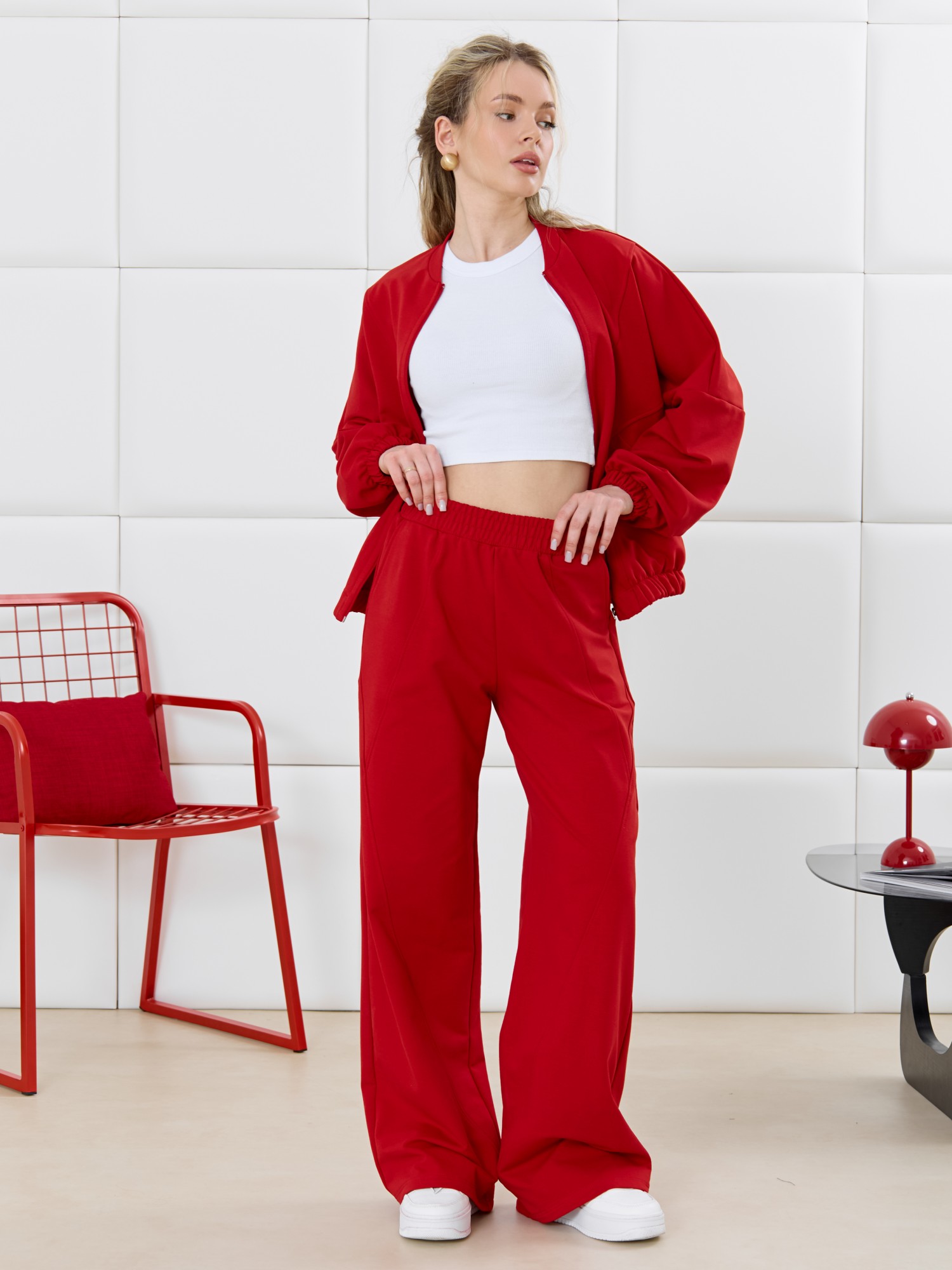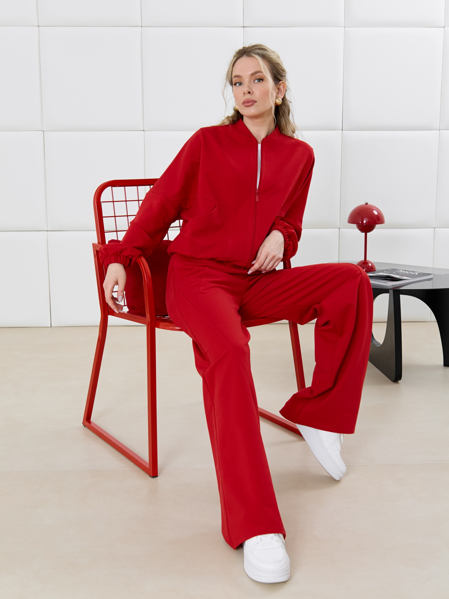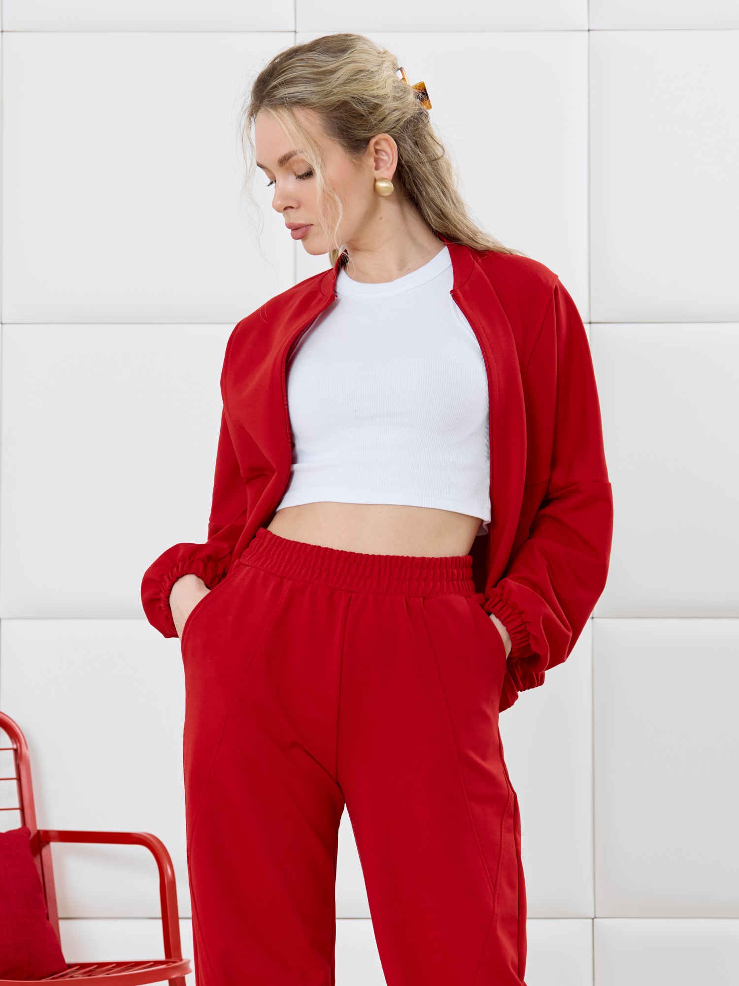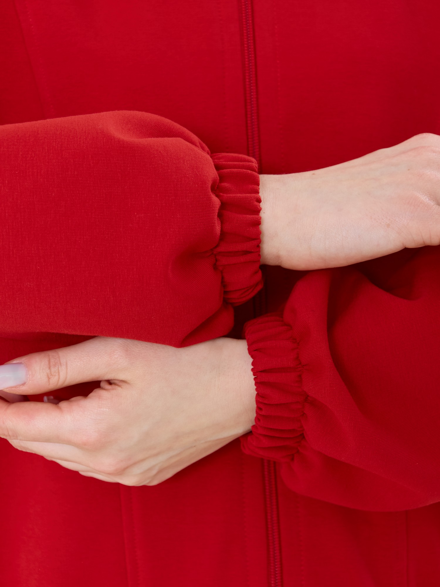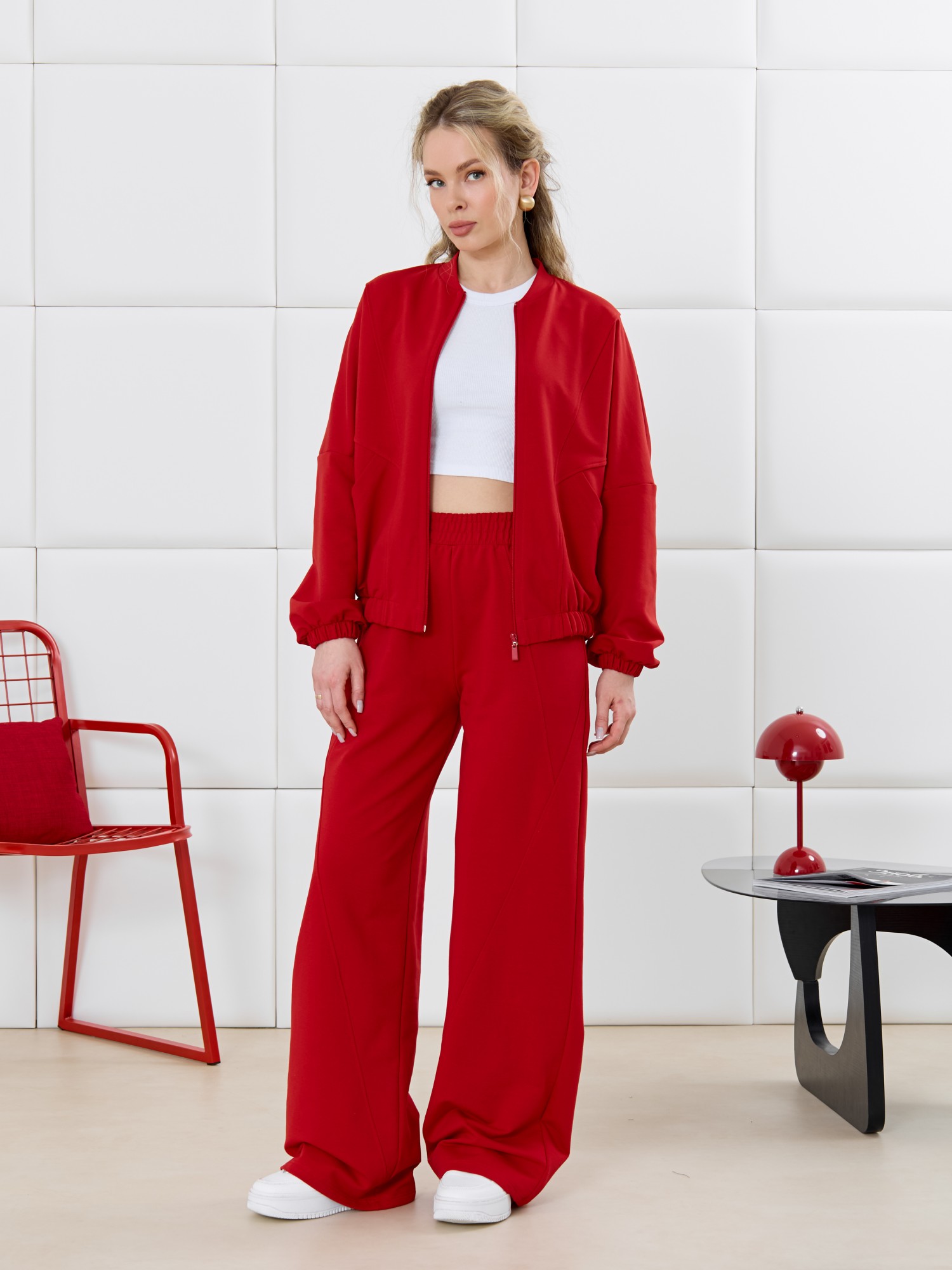 Куртка – бомбер молодежная из гладкокрашенного трикотажного полотна «футер» прямого силуэта, свободная, со спущенной линией плеча, длинными втачными рукавами и накладными карманами. Горловина овальной формы, обработана втачной планкой. Центральная бортовая застежка на тесьму «молния». Полочка состоит из трех деталей, две из которых скроены по косой, с отделочными строчками по шву стачивания. Низ изделия и нижние срезы рукавов обработаны подгибкой с эластичной тесьмой внутри.