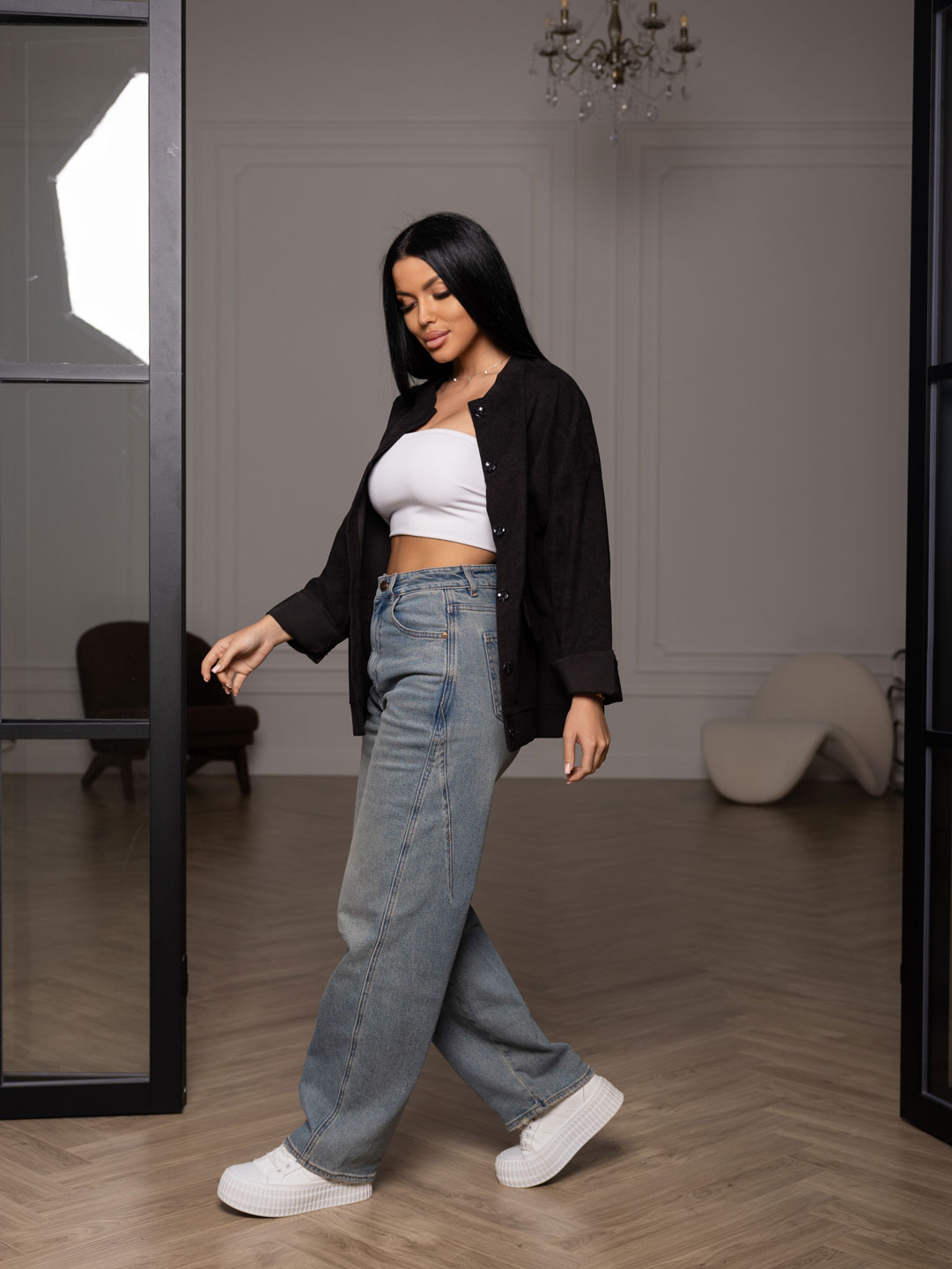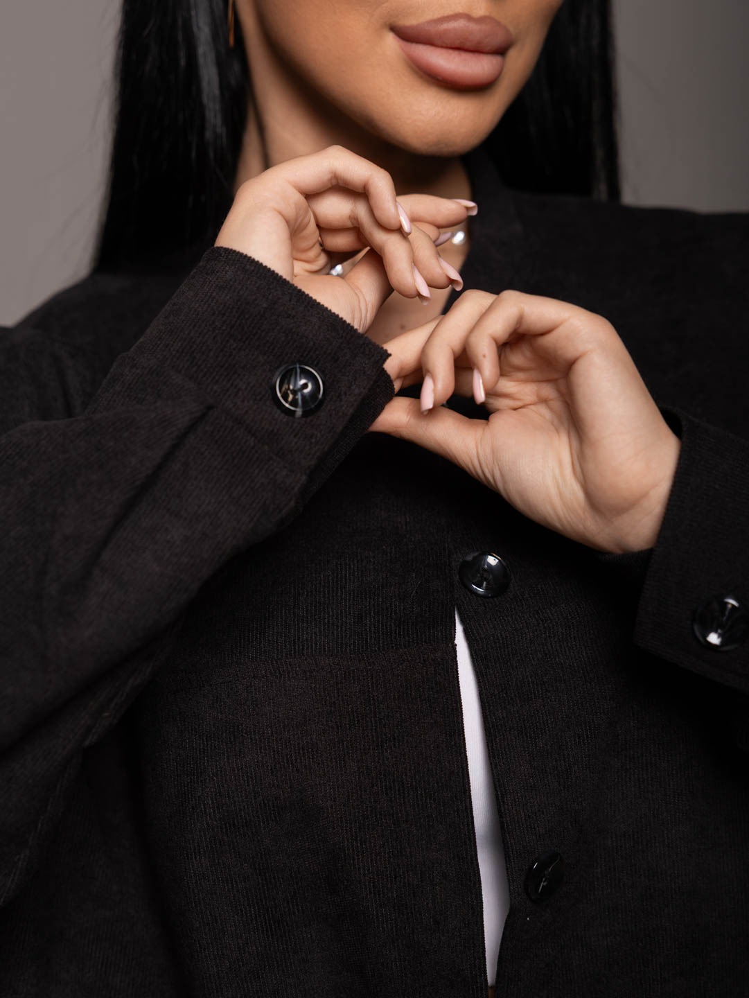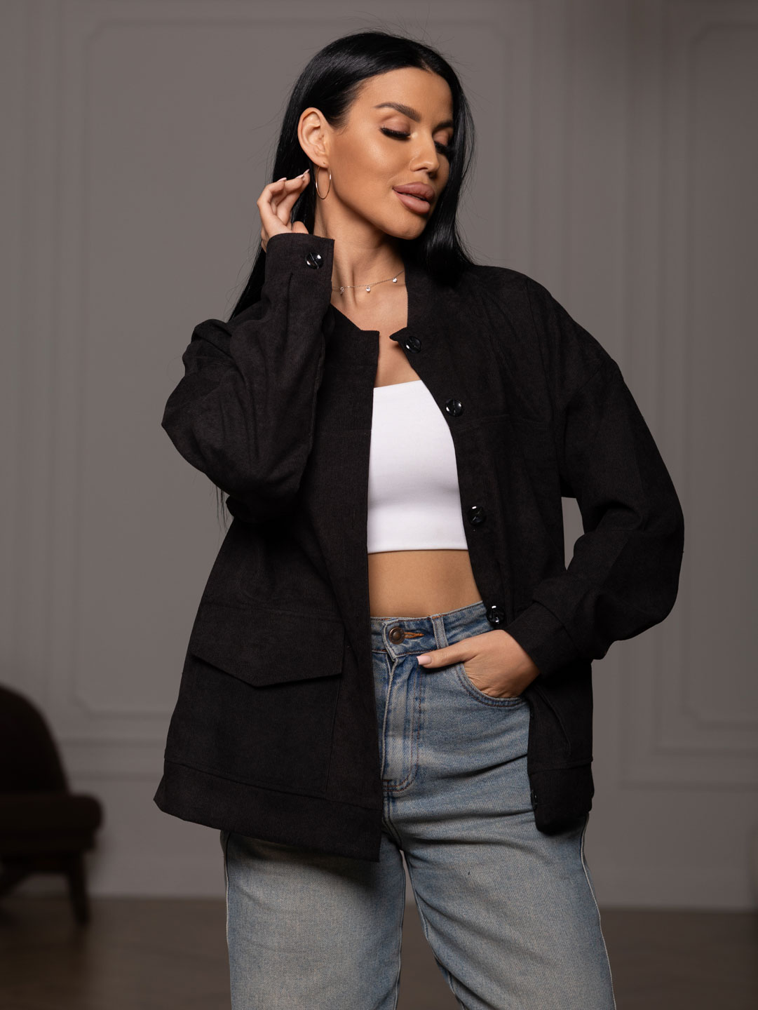 Бомбер из микровельвета, на пуговицах с большими накладными карманами, длинным рукавом и манжетой. Рост модели 165см.