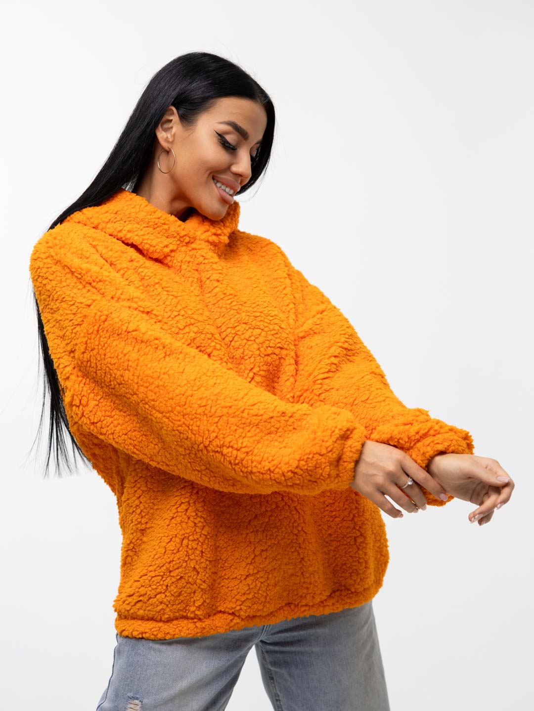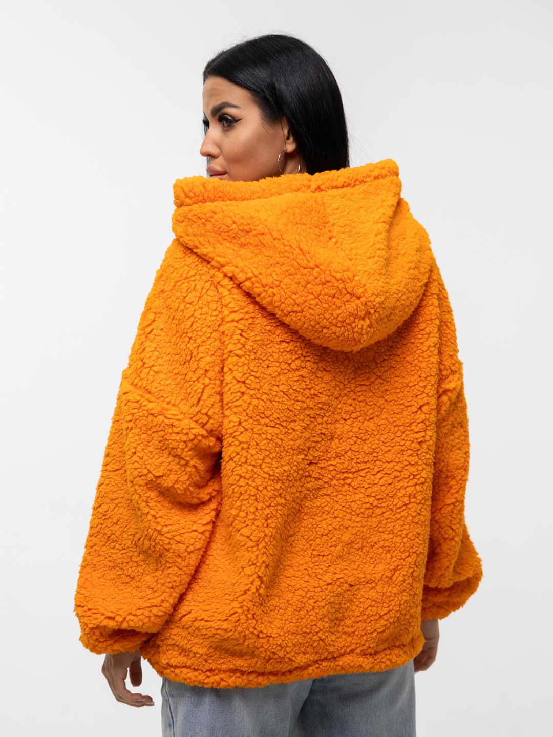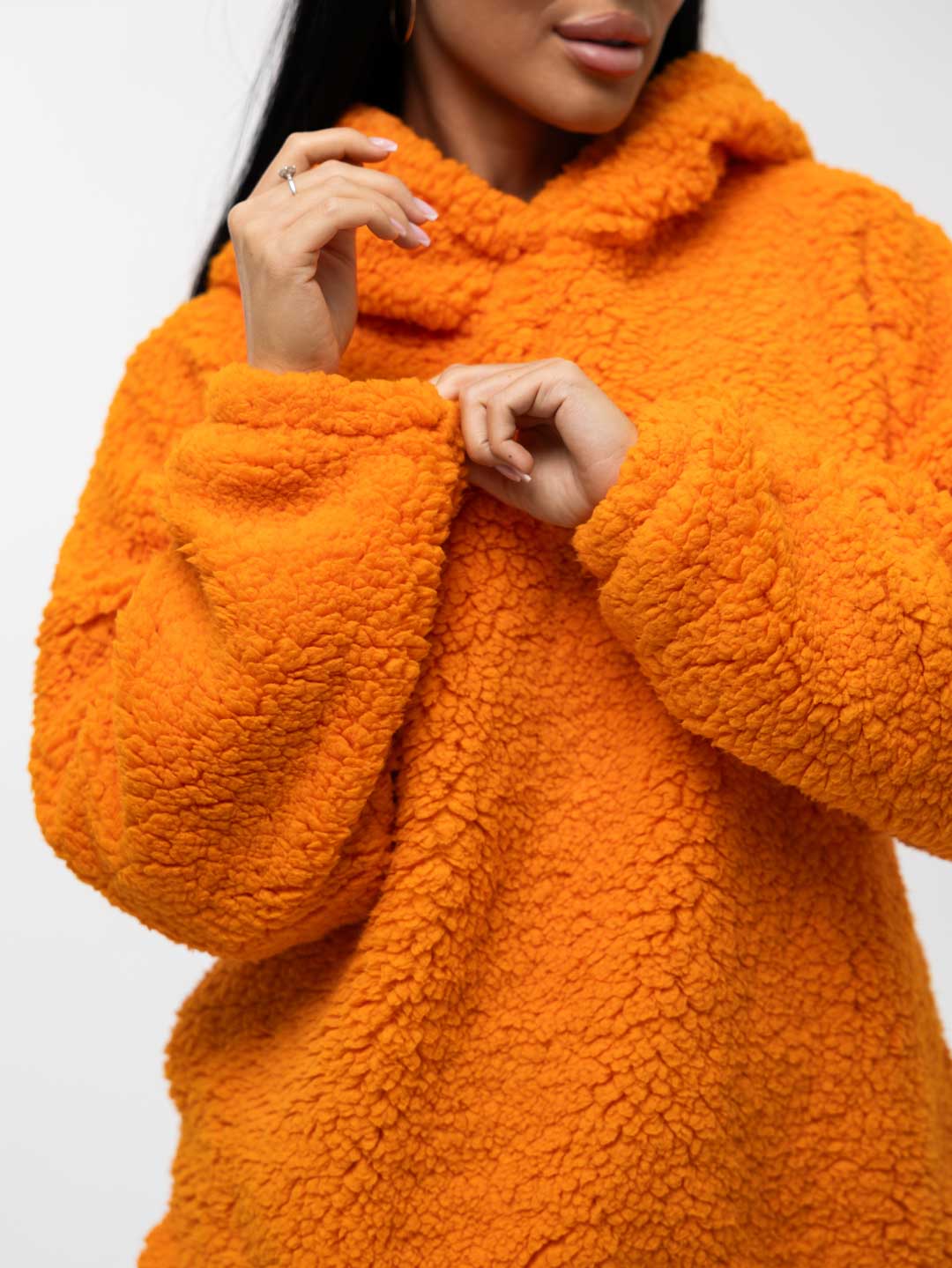 Толстовка оверсайз станет прекрасным подарком на любой праздник! Шерпа – синтетическое полотно с имитацией меха на лицевой поверхности. На ощупь материал плотный, приятный, мягкий. Хорошо согревает. Изнаночная сторона – текстильное полотно трикотажного переплетения. Фактура ткани хорошо видна на фото. Идеально подойдет для прохладного времени года. Толстовка идеально сочетается с любыми вещами в гардеробе с джинсами, юбкой, можно надеть поверх платья холодным вечером. Она непременно понравится взрослым женщинам и девочкам - подросткам.