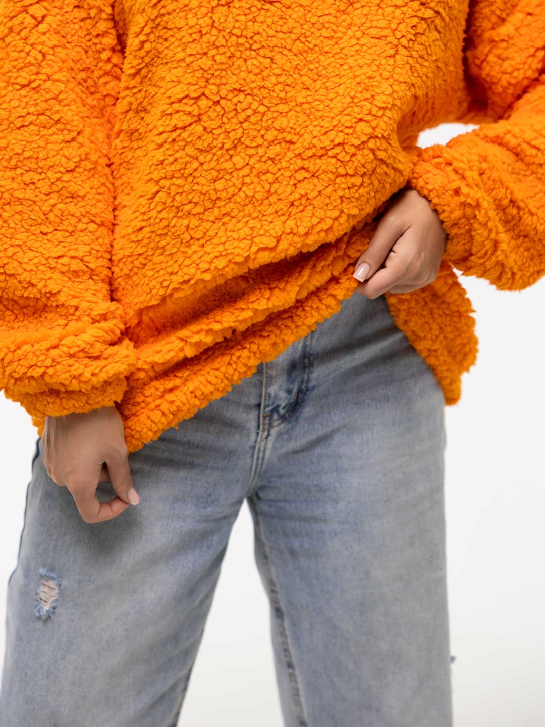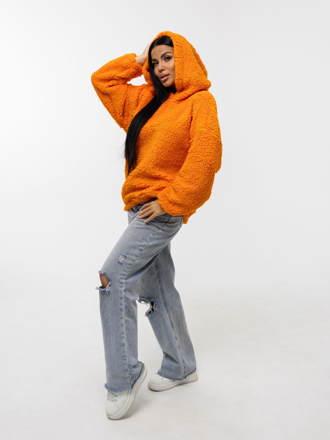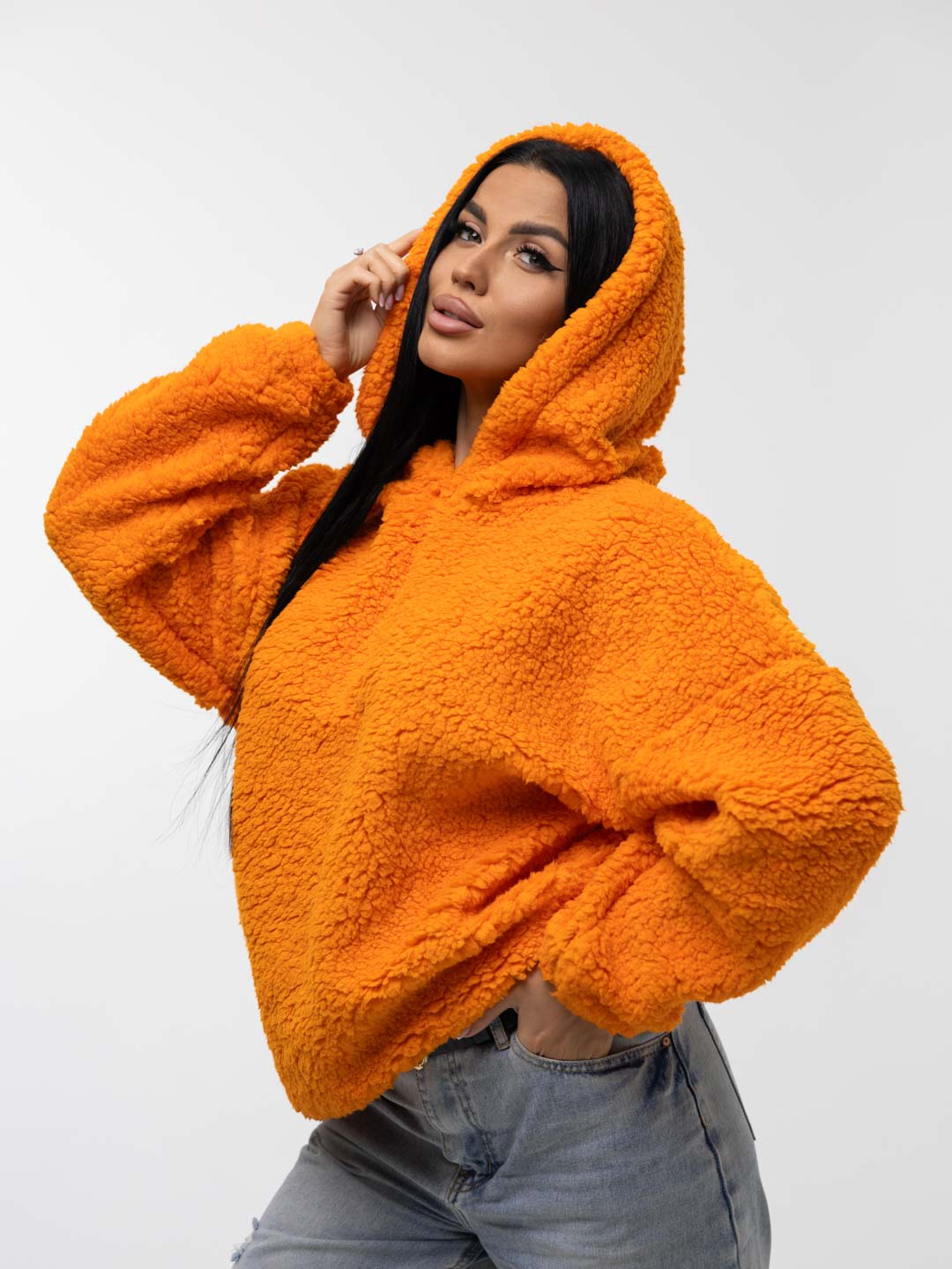 Толстовка оверсайз станет прекрасным подарком на любой праздник! Шерпа – синтетическое полотно с имитацией меха на лицевой поверхности. На ощупь материал плотный, приятный, мягкий. Хорошо согревает. Изнаночная сторона – текстильное полотно трикотажного переплетения. Фактура ткани хорошо видна на фото. Идеально подойдет для прохладного времени года. Толстовка идеально сочетается с любыми вещами в гардеробе с джинсами, юбкой, можно надеть поверх платья холодным вечером. Она непременно понравится взрослым женщинам и девочкам - подросткам.