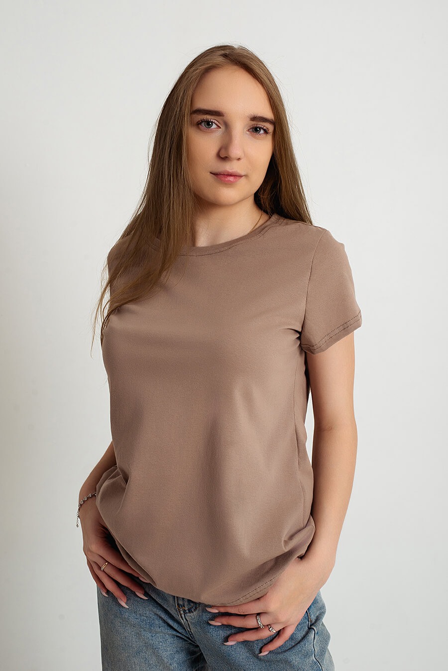 Базовая бежевая приталенная футболка кроя с округлым вырезом горловины, незаменимая часть гардероба и необходимая каждому.