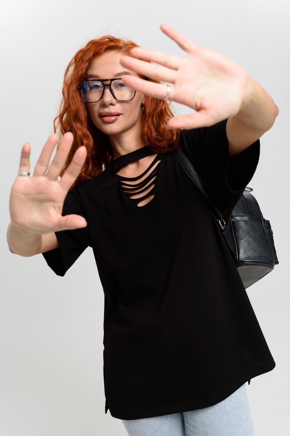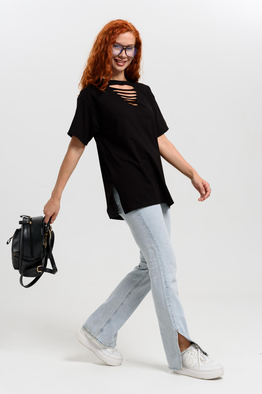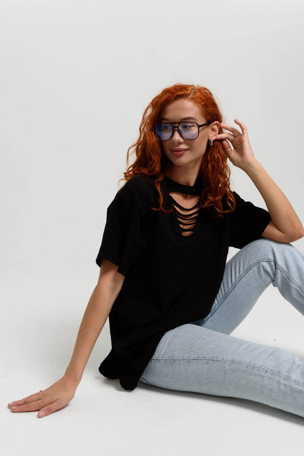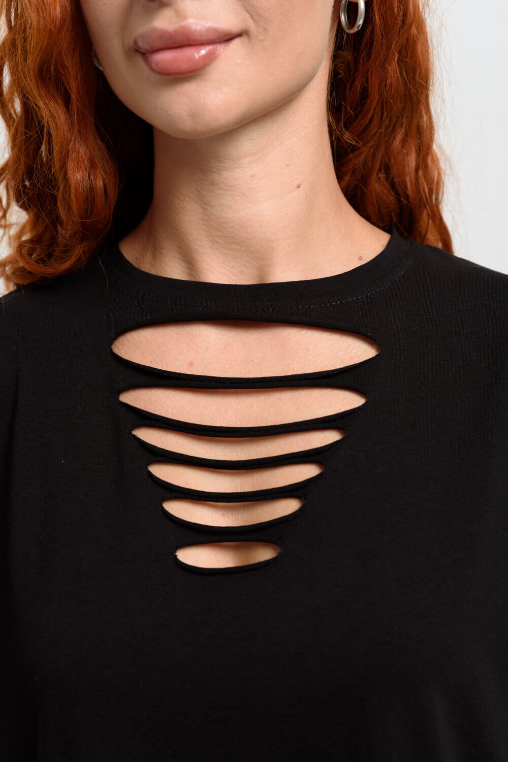 Футболка в стиле oversize, со спущенным плечом и стильными разрезами на груди. Невероятно комфортная, приятная к телу, футболка универсальной длины.