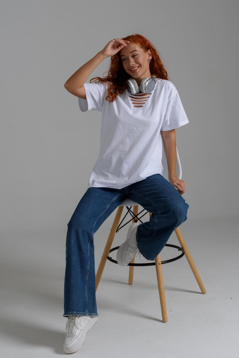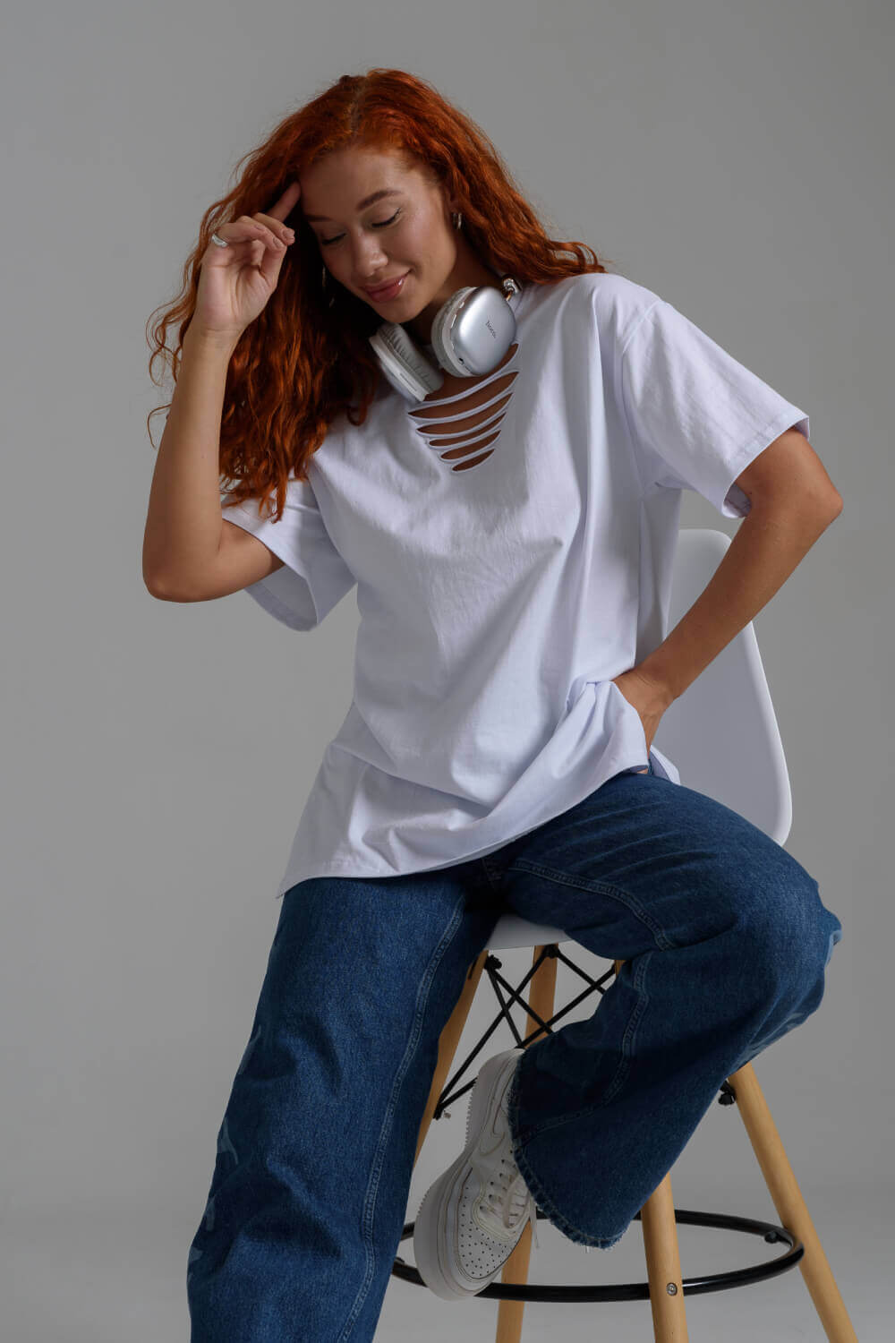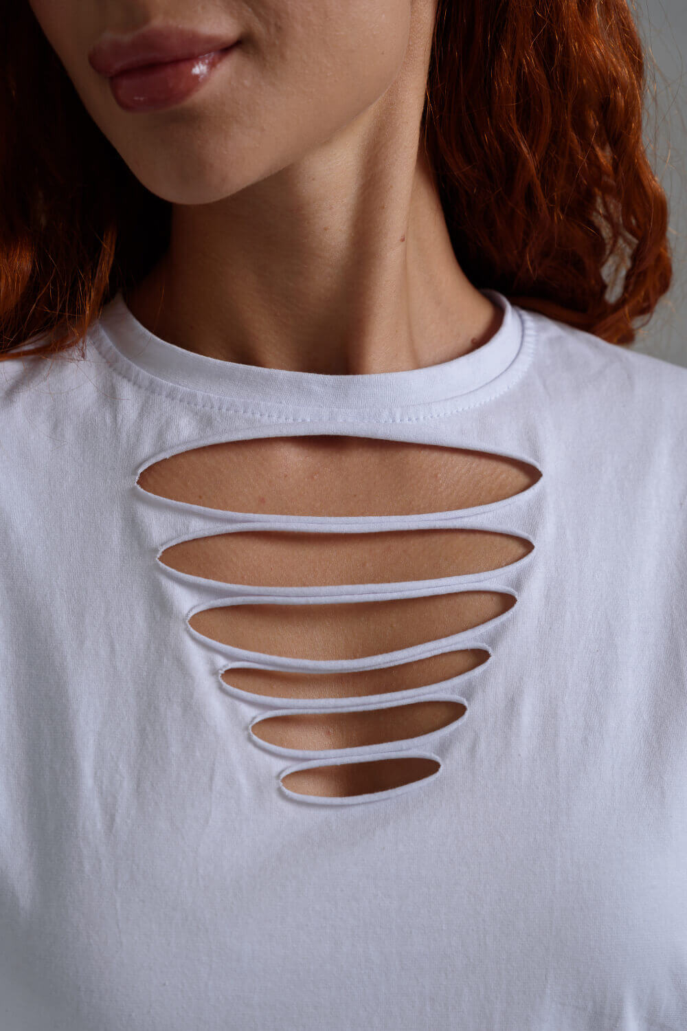 Футболка в стиле oversize, со спущенным плечом и стильными разрезами на груди. Невероятно комфортная, приятная к телу, футболка универсальной длины.