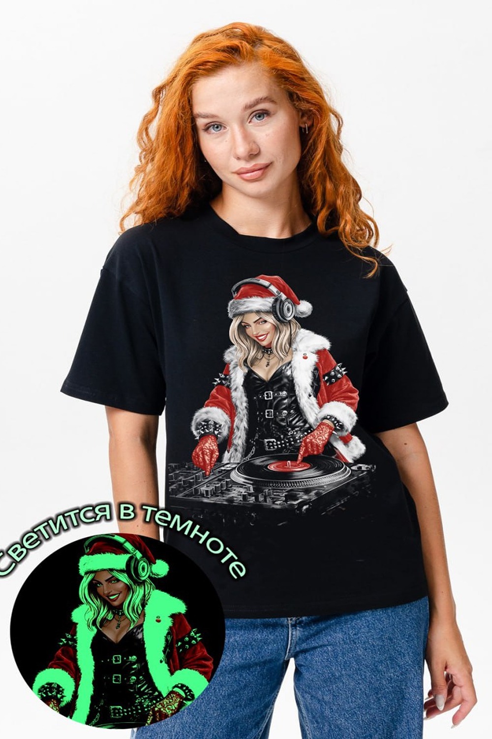 Черная футболка с ярким принтом DJ в стиле новогодней вечеринки идеальный выбор для тех, кто любит быть в центре внимания! Необычный дизайн с изображением девушки-диджея в Санта-костюме дополнен эффектом светящегося рисунка в темноте, который создаёт вау-эффект на любой вечеринке или ночной прогулке. Удобный свободный крой и мягкий хлопковый материал обеспечивают комфорт в течение всего дня. Стильно, креативно, незабываемо!