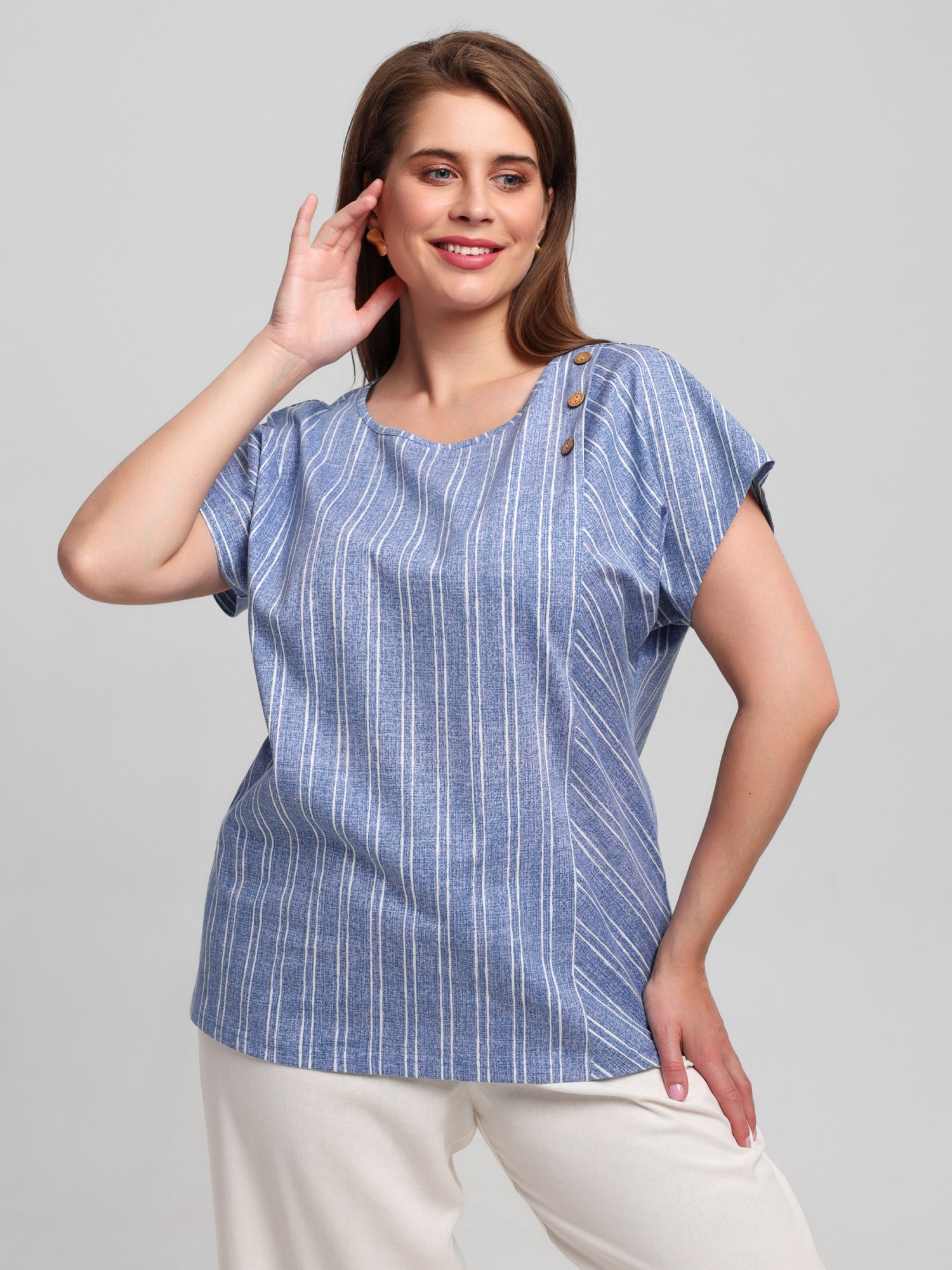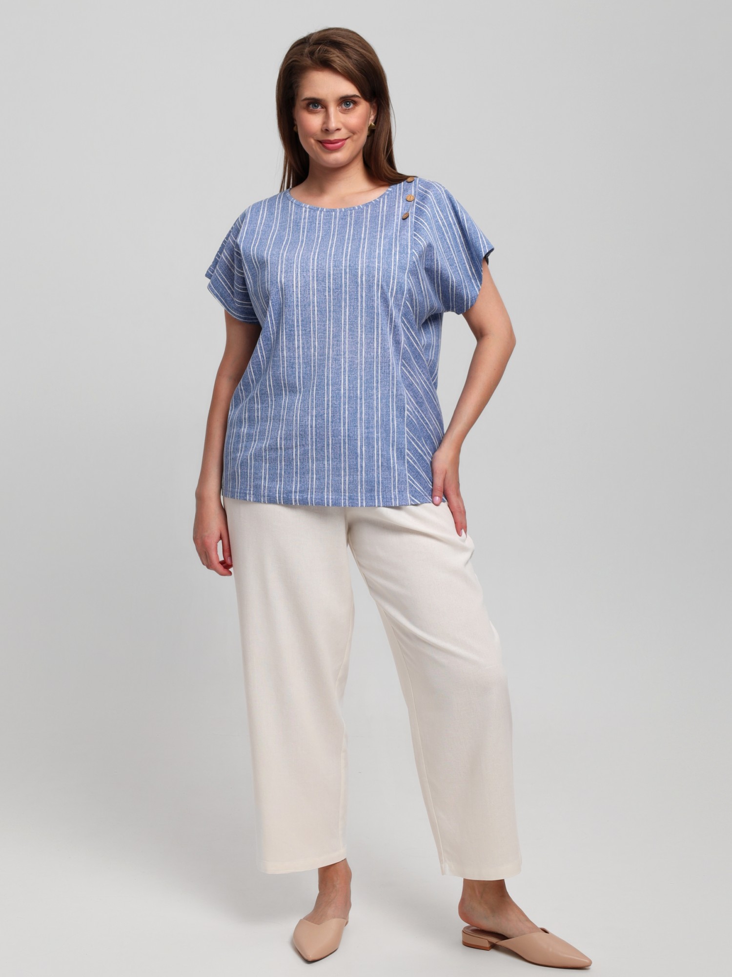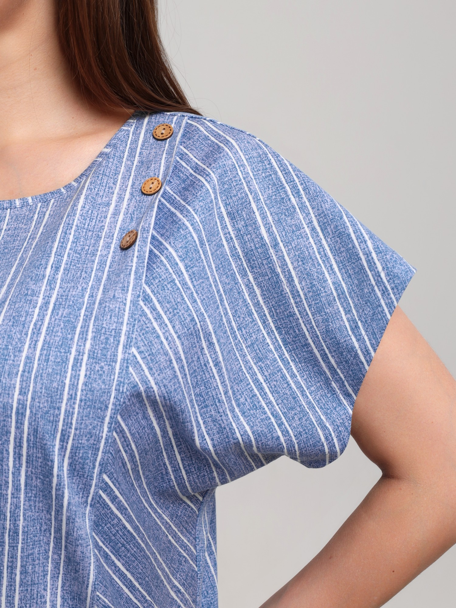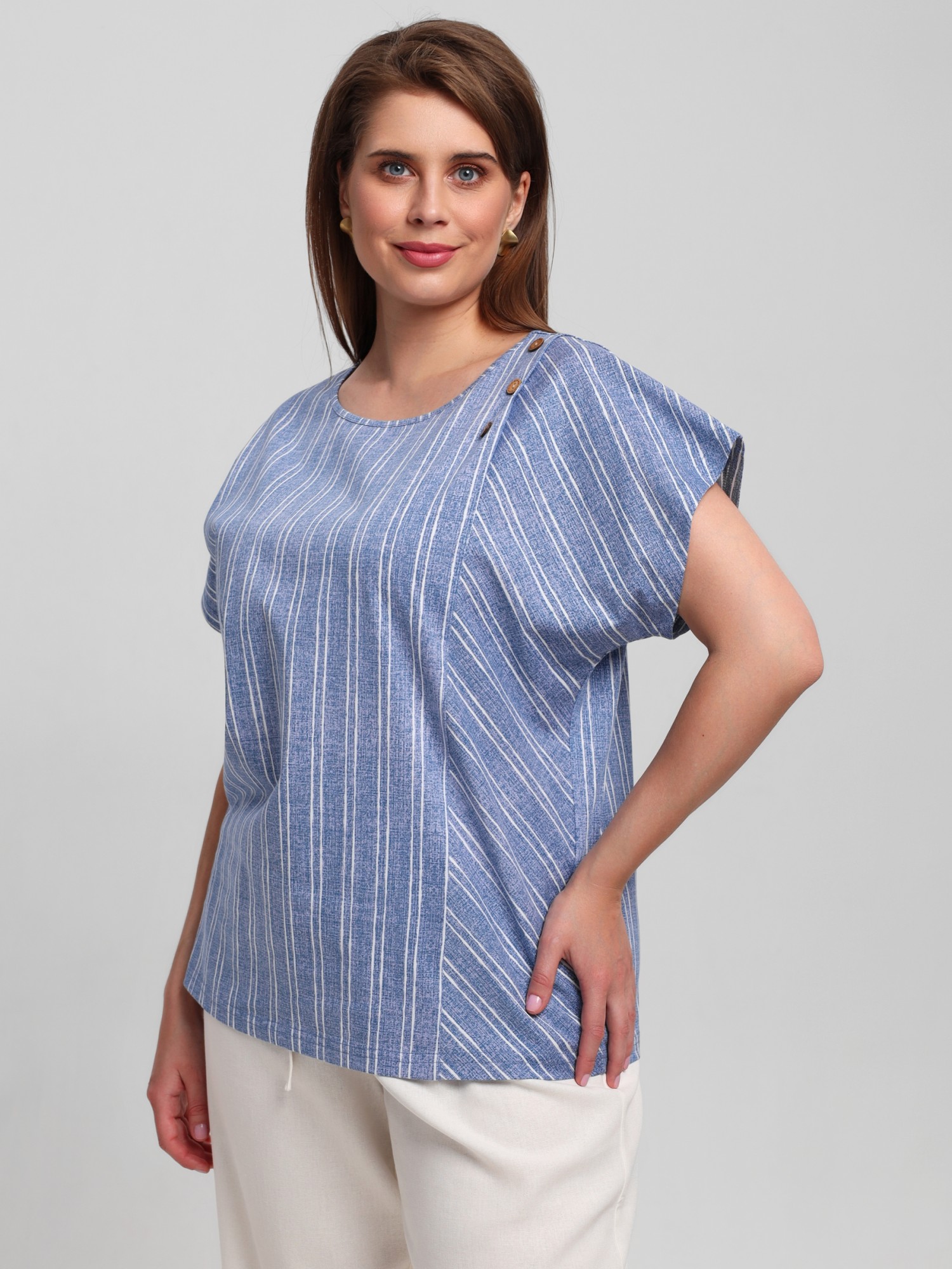 Футболка - женская из трикотажного полотна «кулирка» с набивным рисунком в полоску, с цельнокроеными рукавами, горловиной овальной формы, окантованной основным материалом. Деталь полочки состоит из двух частей, одна из которых с ассиметричным направлением рисунка. В плечевом шве заложена складка, дополненная декоративными пуговицами.