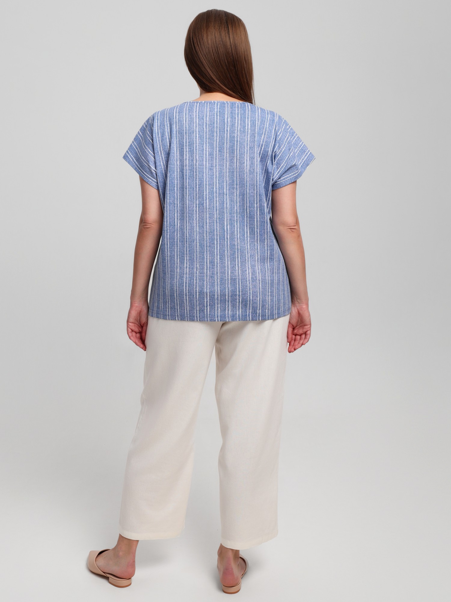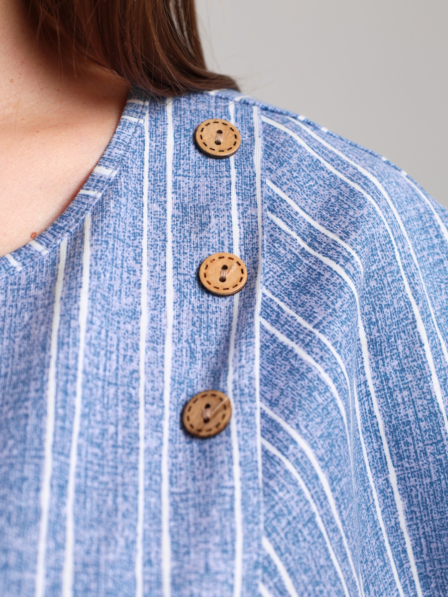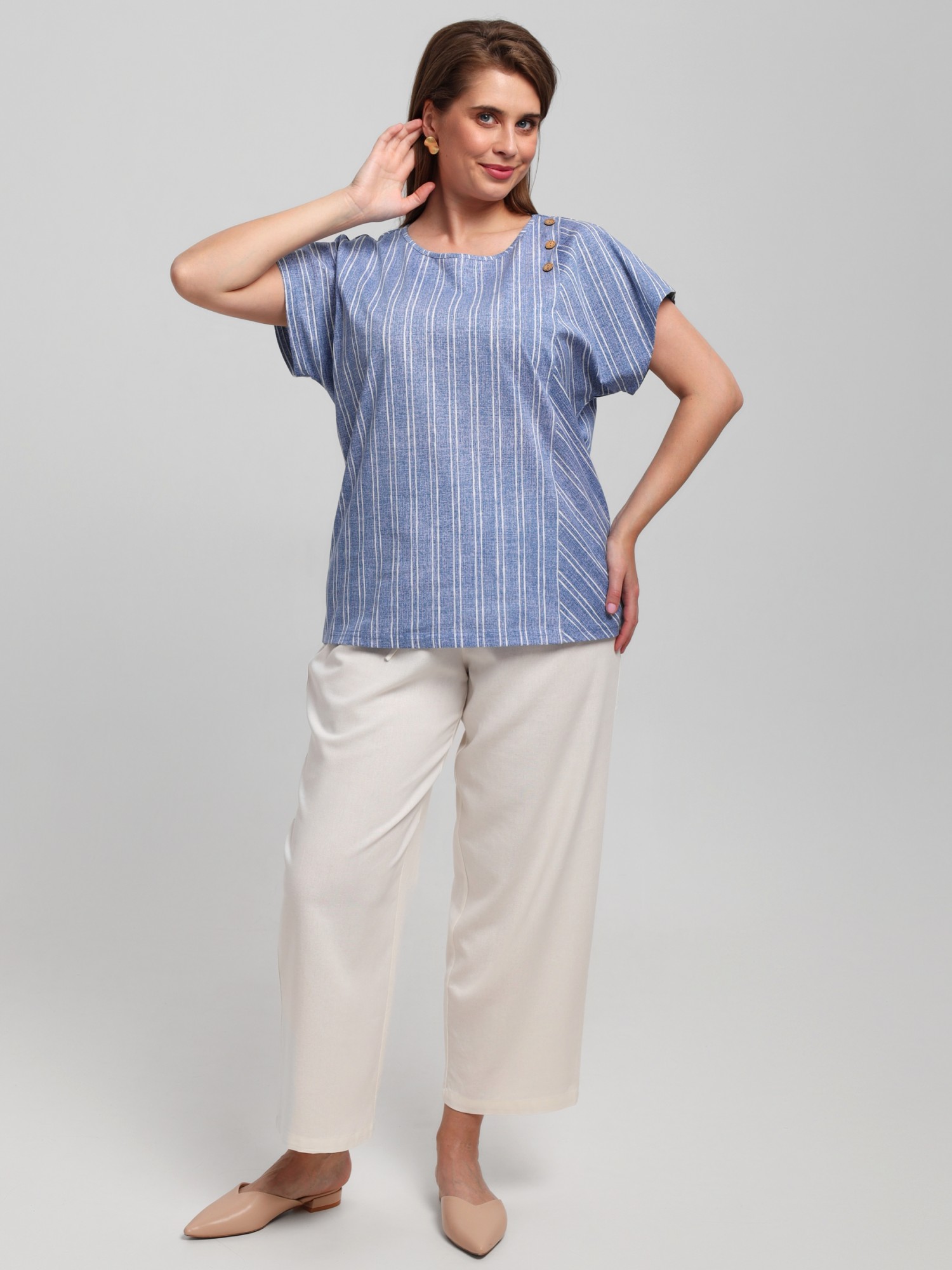 Футболка - женская из трикотажного полотна «кулирка» с набивным рисунком в полоску, с цельнокроеными рукавами, горловиной овальной формы, окантованной основным материалом. Деталь полочки состоит из двух частей, одна из которых с ассиметричным направлением рисунка. В плечевом шве заложена складка, дополненная декоративными пуговицами.
