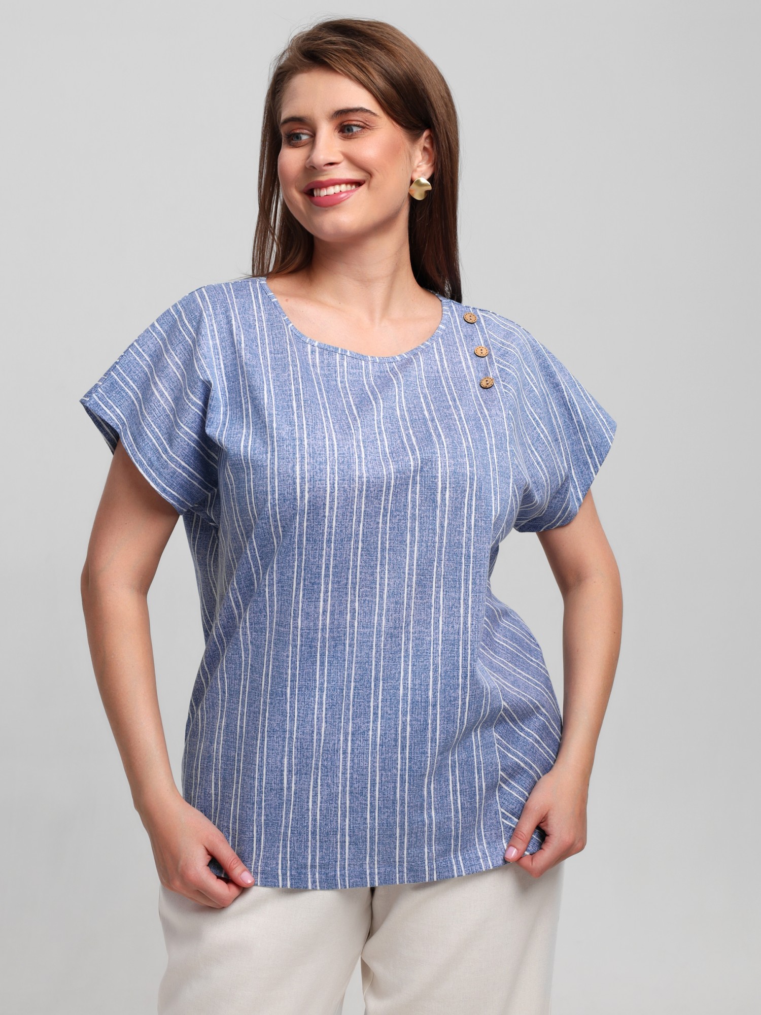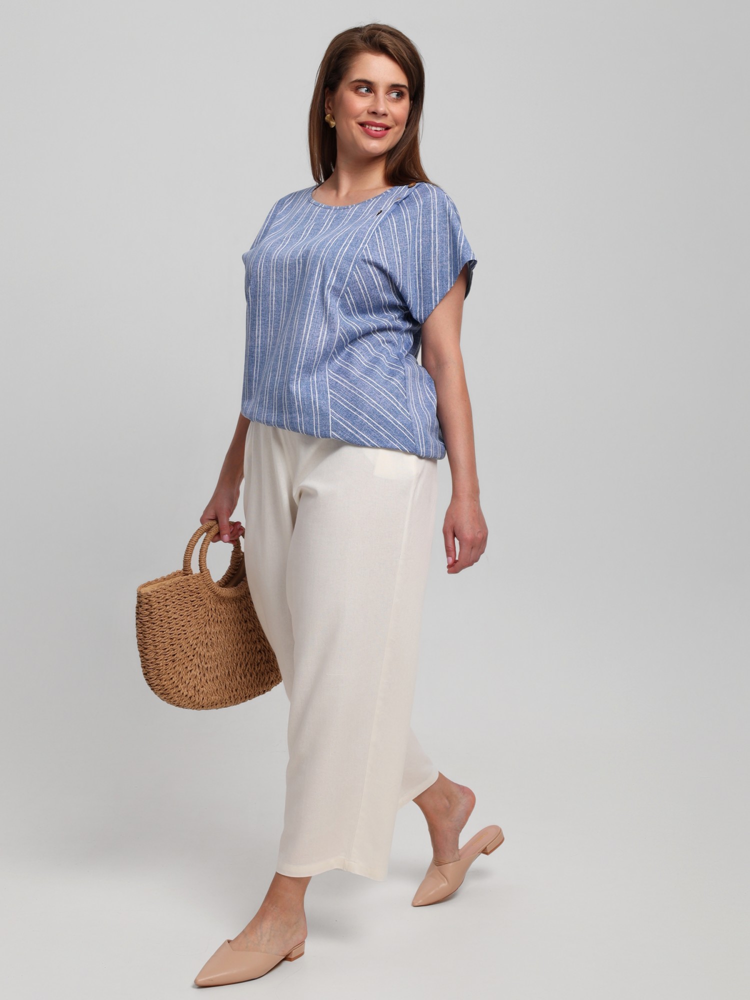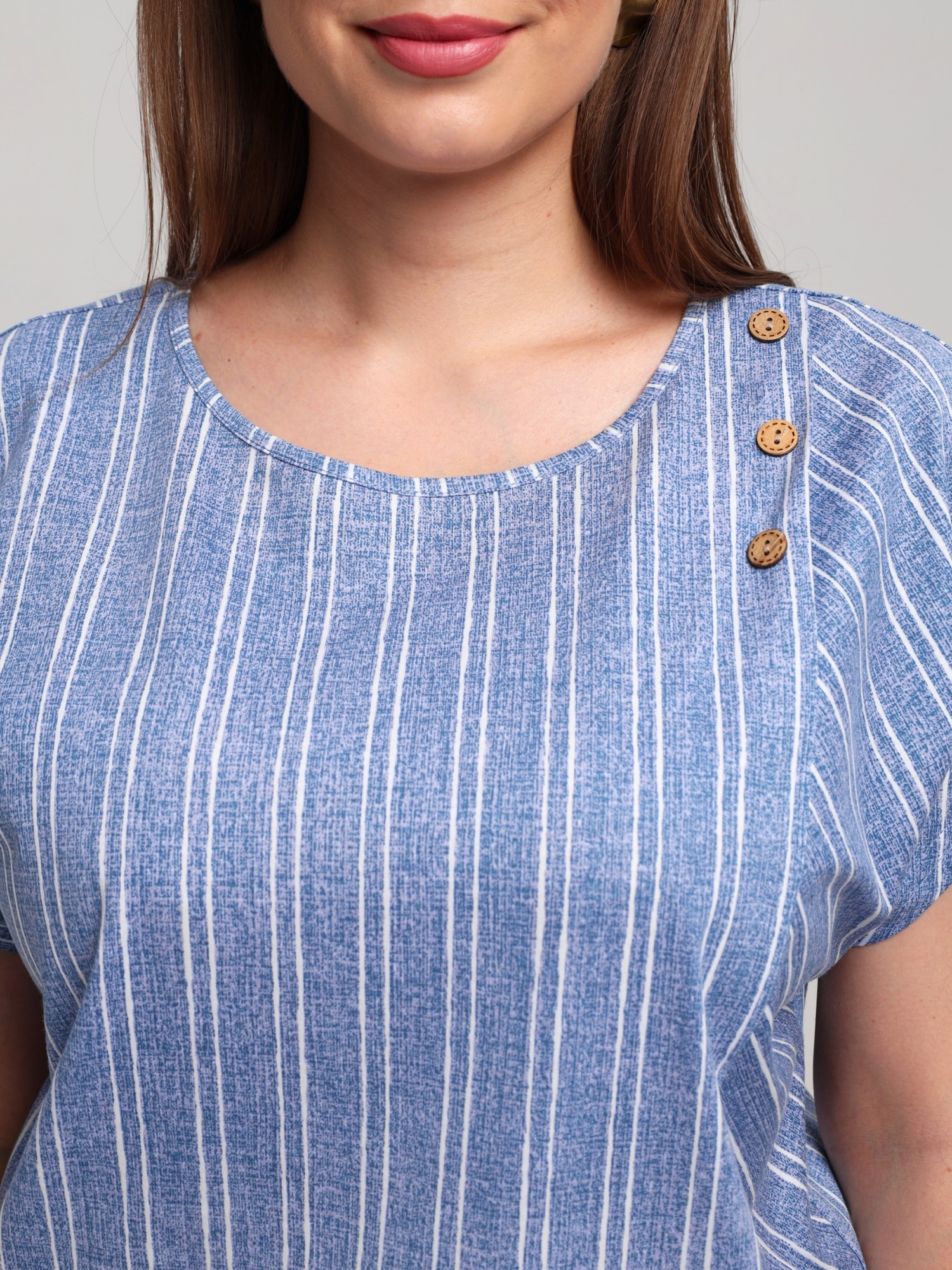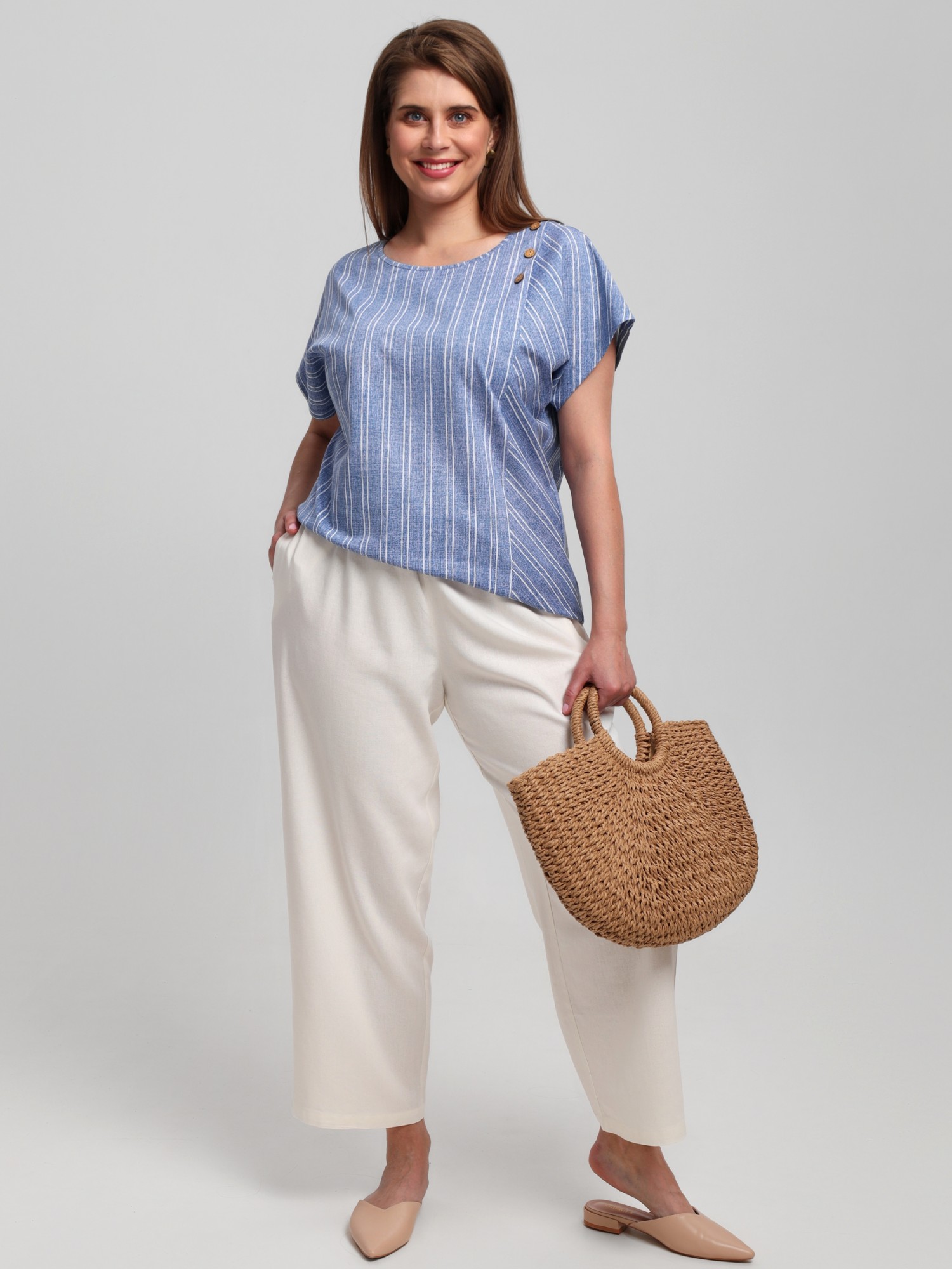 Футболка - женская из трикотажного полотна «кулирка» с набивным рисунком в полоску, с цельнокроеными рукавами, горловиной овальной формы, окантованной основным материалом. Деталь полочки состоит из двух частей, одна из которых с ассиметричным направлением рисунка. В плечевом шве заложена складка, дополненная декоративными пуговицами.