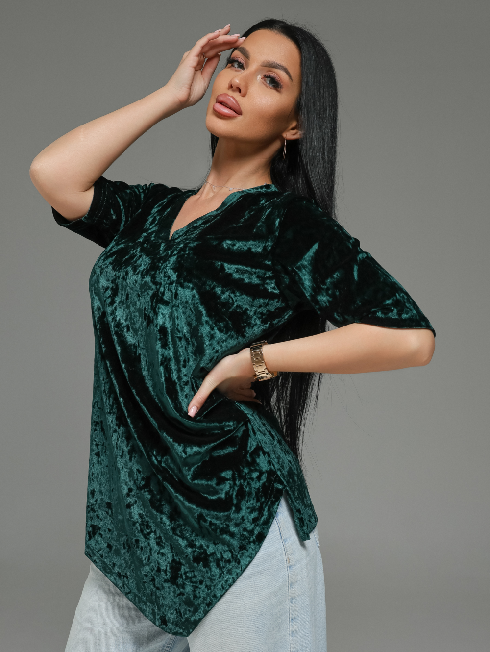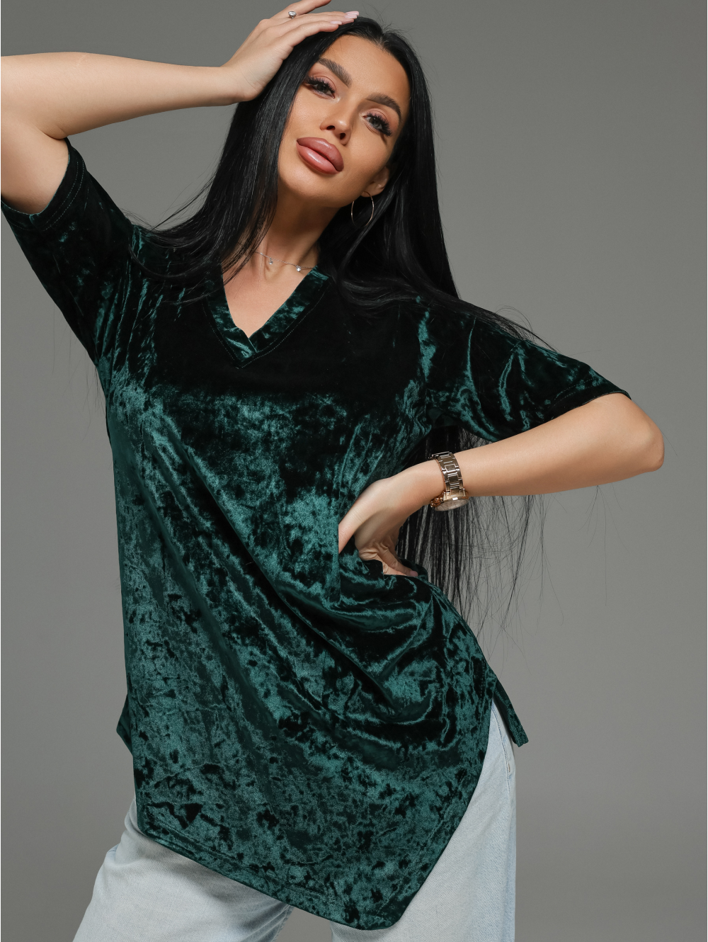 Горловина: V-образный вырез — классика, которая визуально вытягивает шею и добавляет образу лёгкую элегантность.