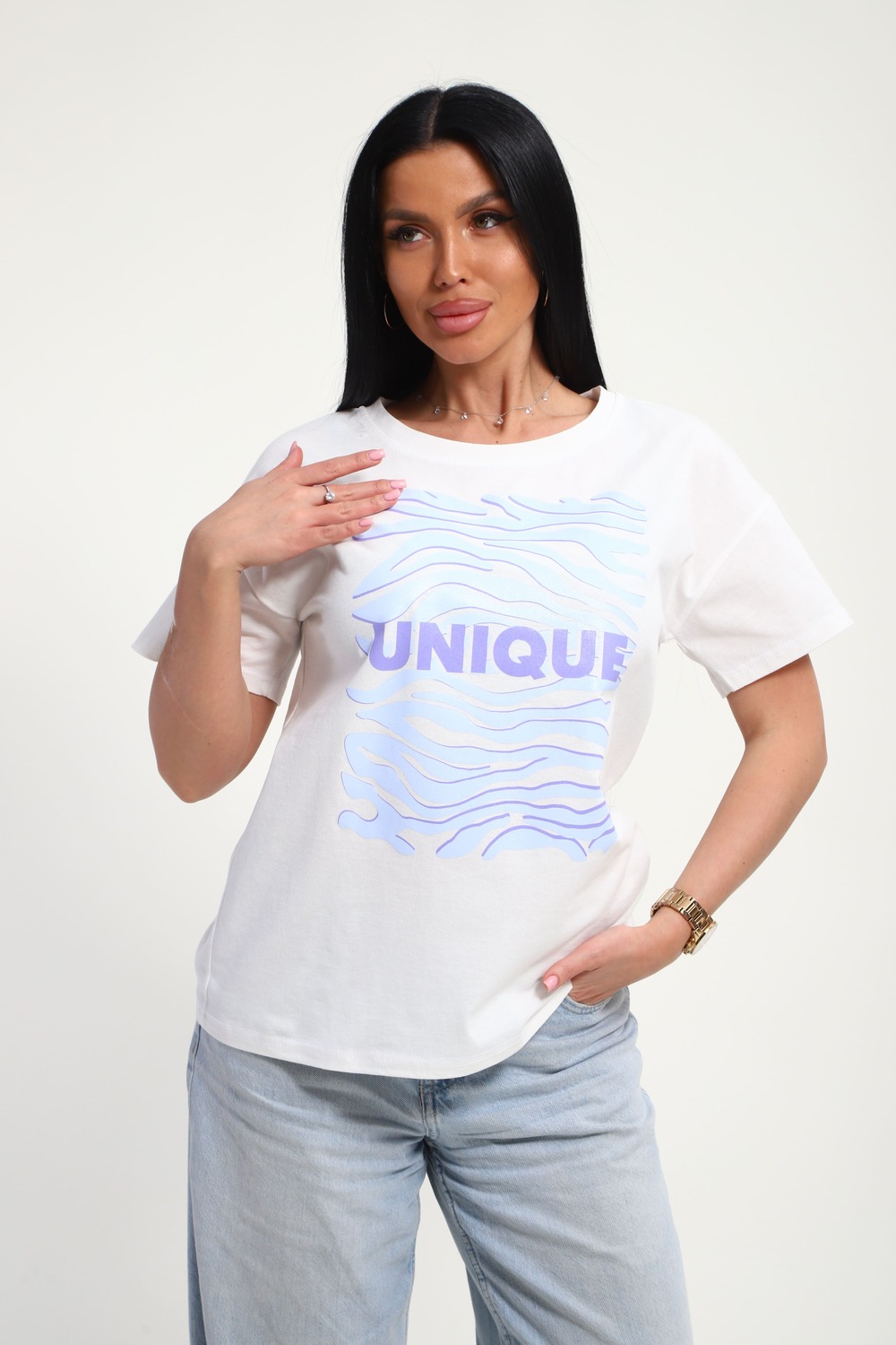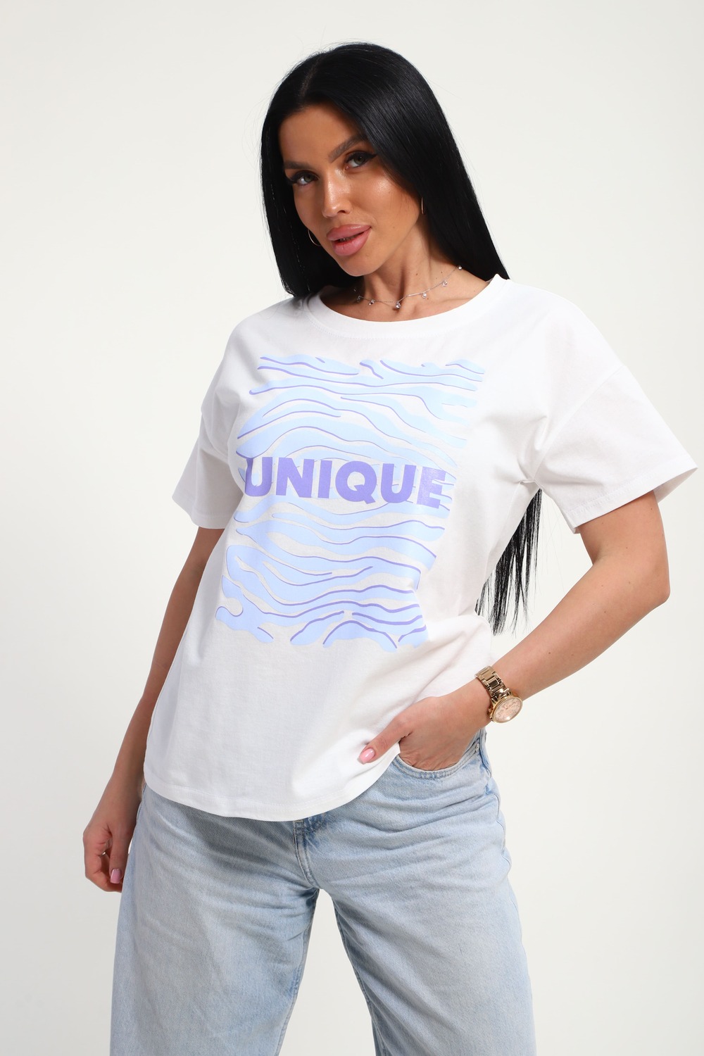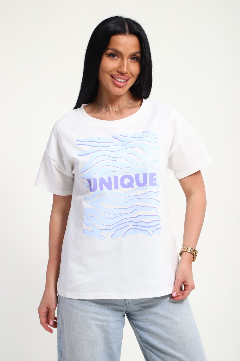 Футболка женская из гладкокрашеного трикотажа, хлопок 100%. Прямого силуэта, свободного облегания. горловина круглой формы. Рукав короткий. Низ изделия прямой. На полочке принт, шелкография.