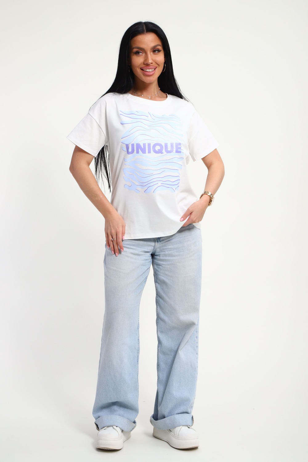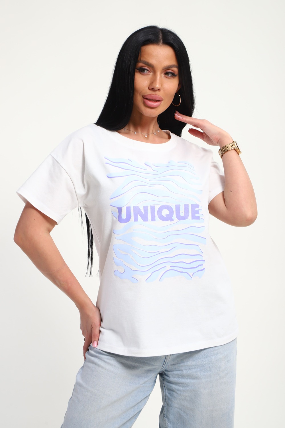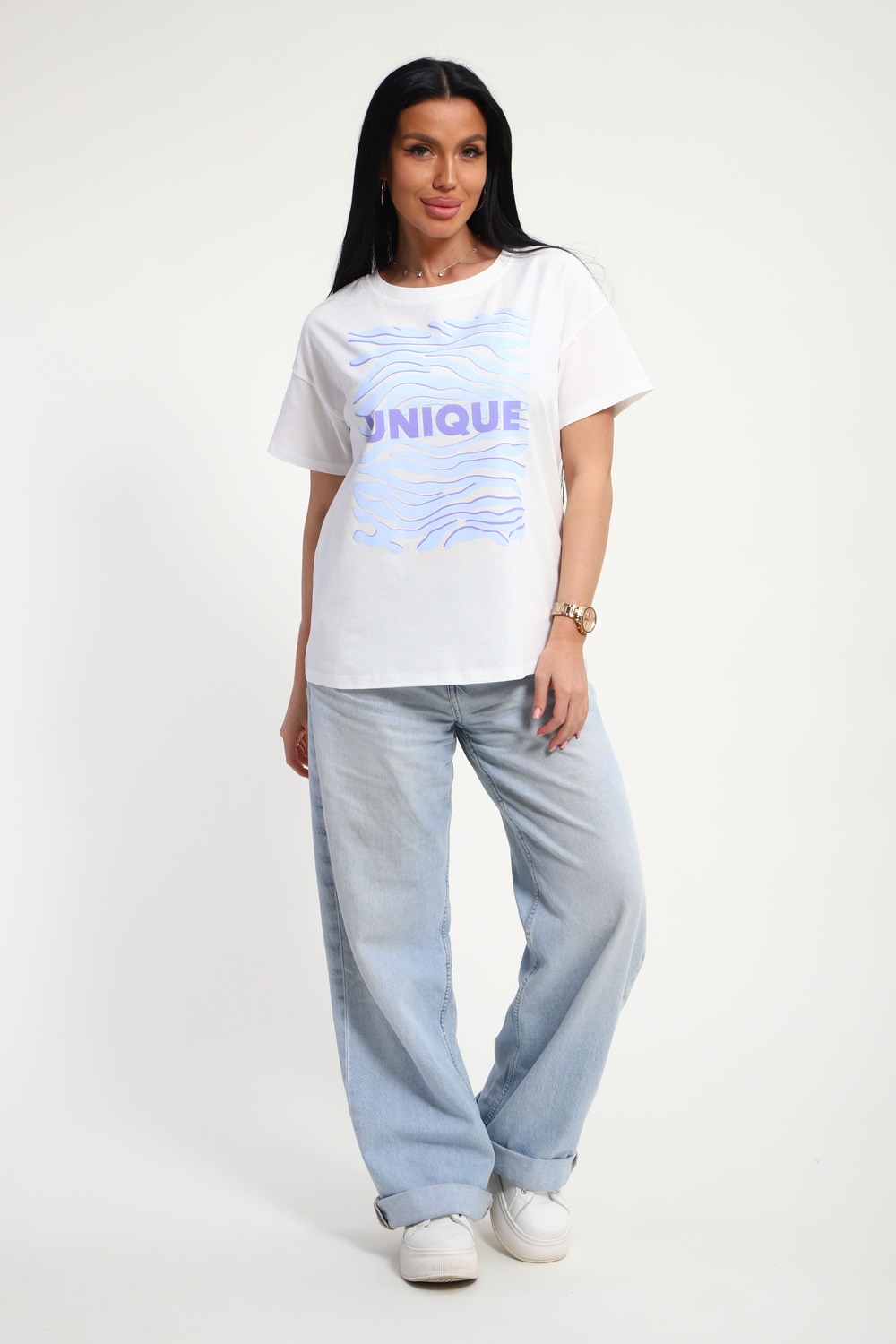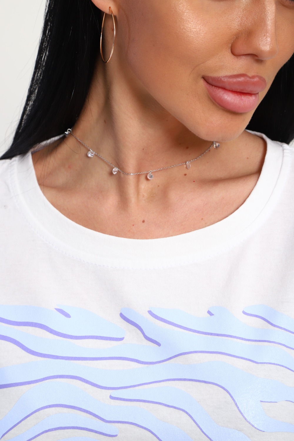 Футболка женская из гладкокрашеного трикотажа, хлопок 100%. Прямого силуэта, свободного облегания. горловина круглой формы. Рукав короткий. Низ изделия прямой. На полочке принт, шелкография.
