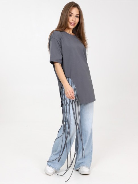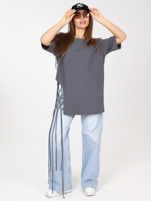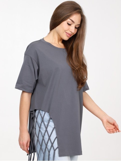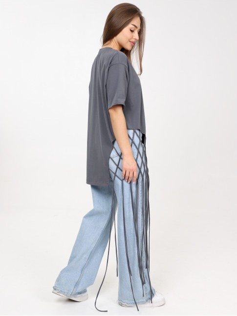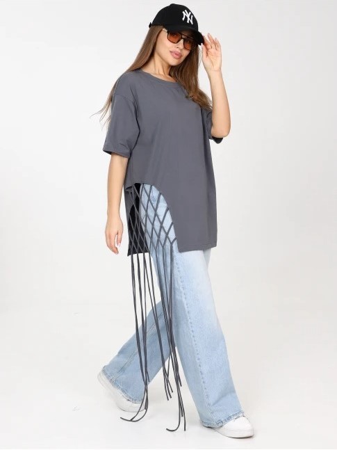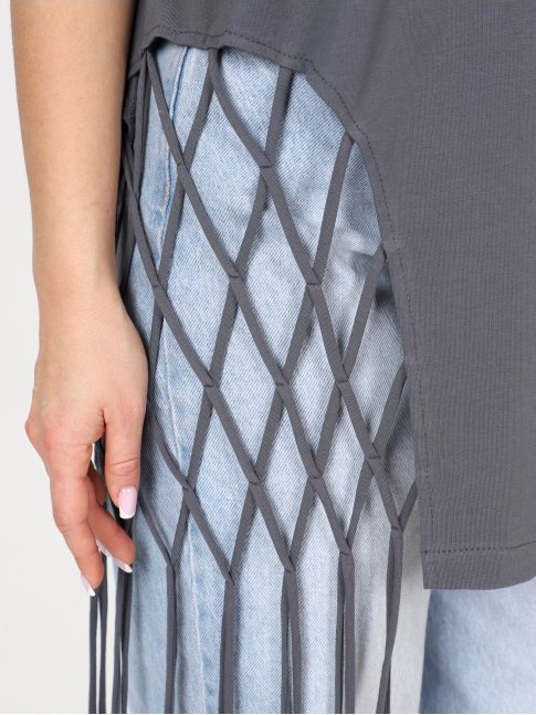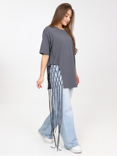 Яркая удлиненная футболка с декоративным плетением. Выполнена из 100% хлопка.