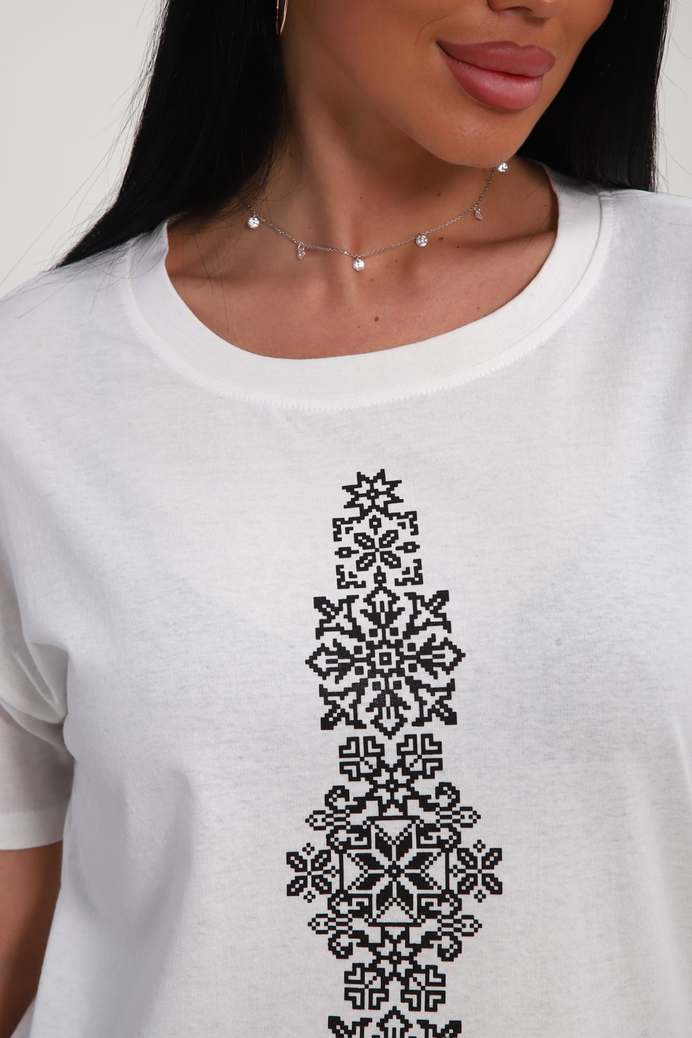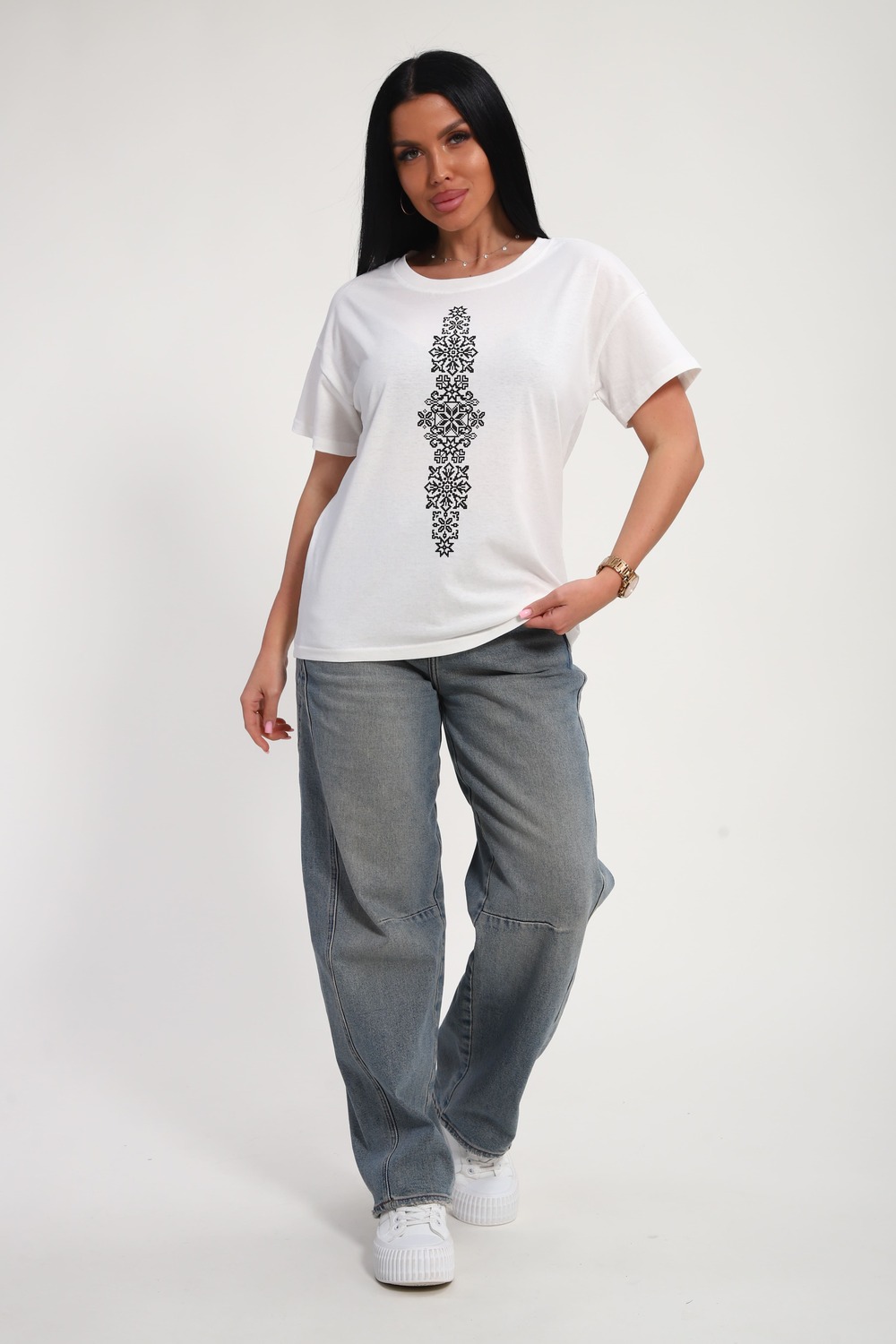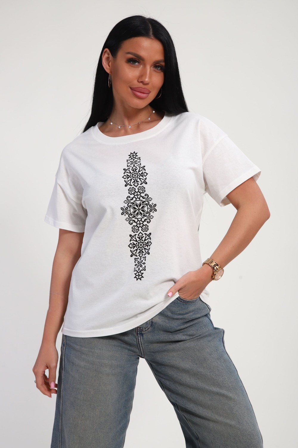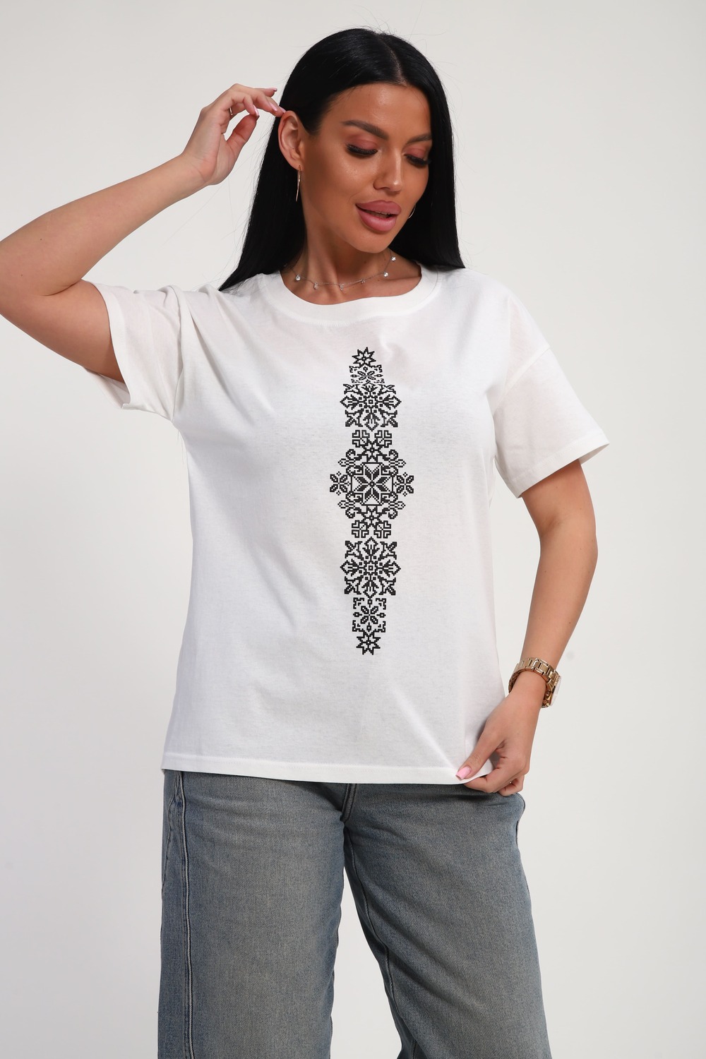 Футболка женская из гладкокрашеного трикотажа, хлопок 100%. Прямого силуэта, свободного облегания, горловина круглой формы. Рукав короткий. Низ изделия прямой. На полочке принт, шелкография.