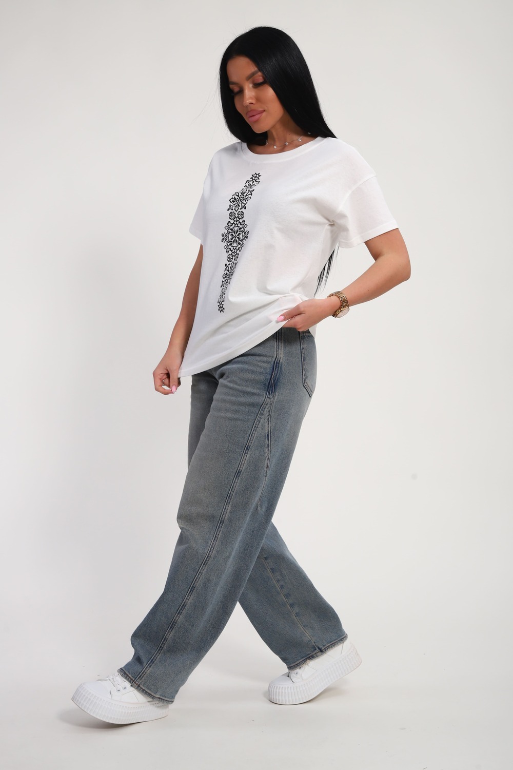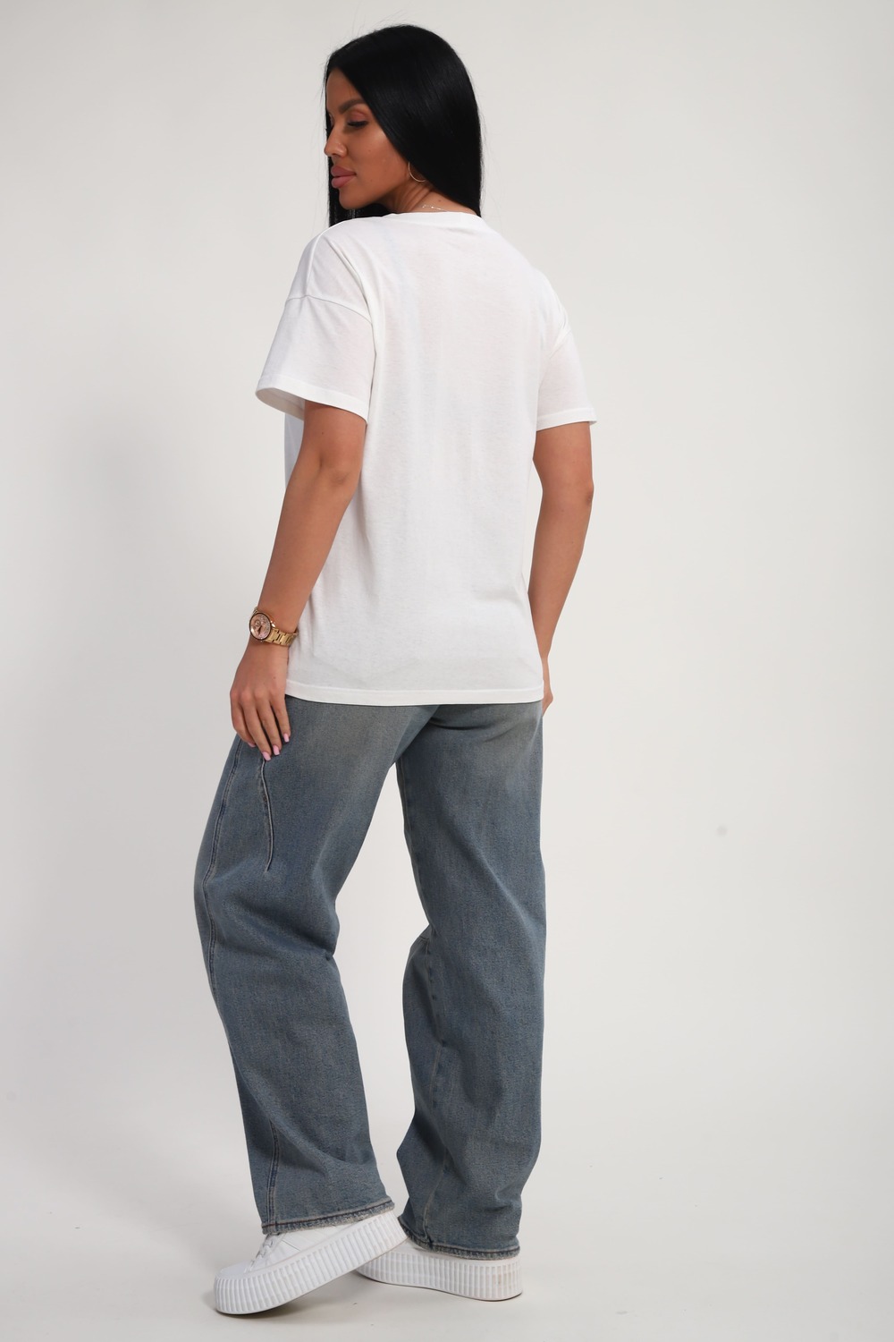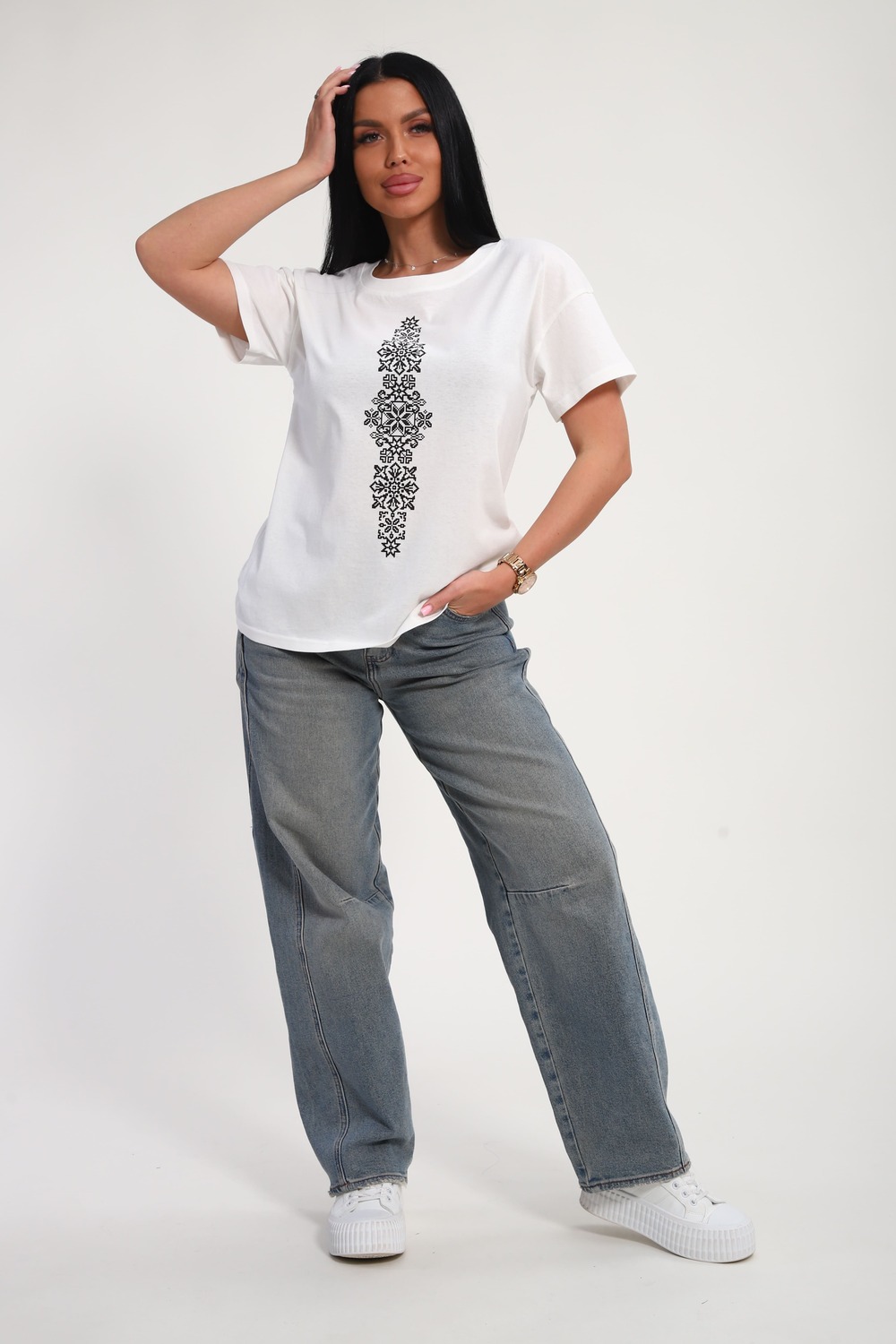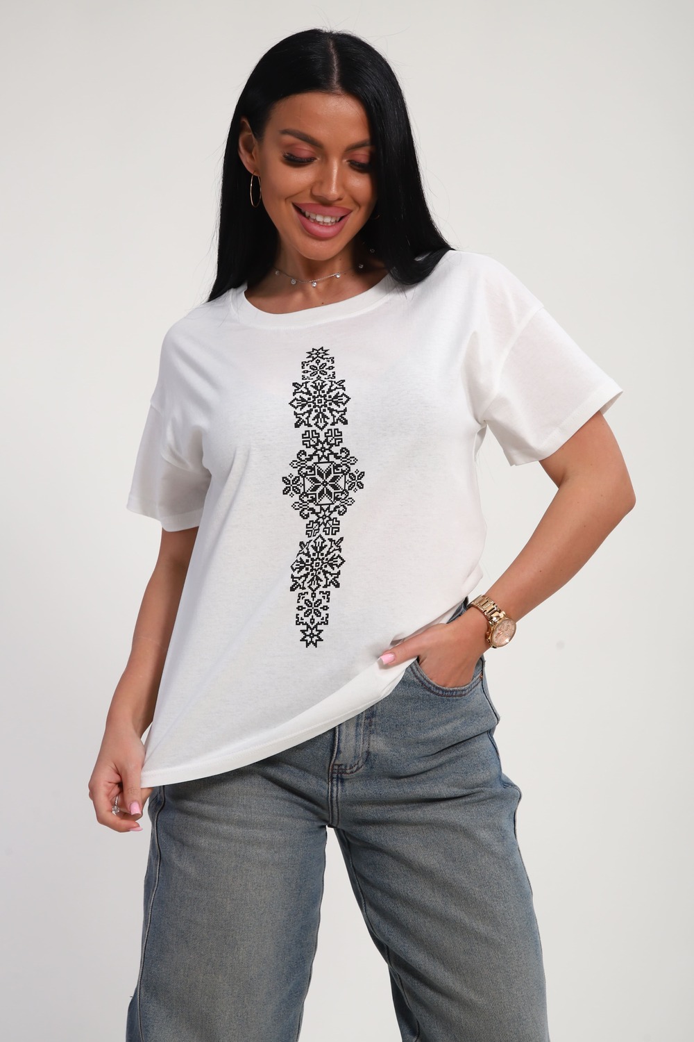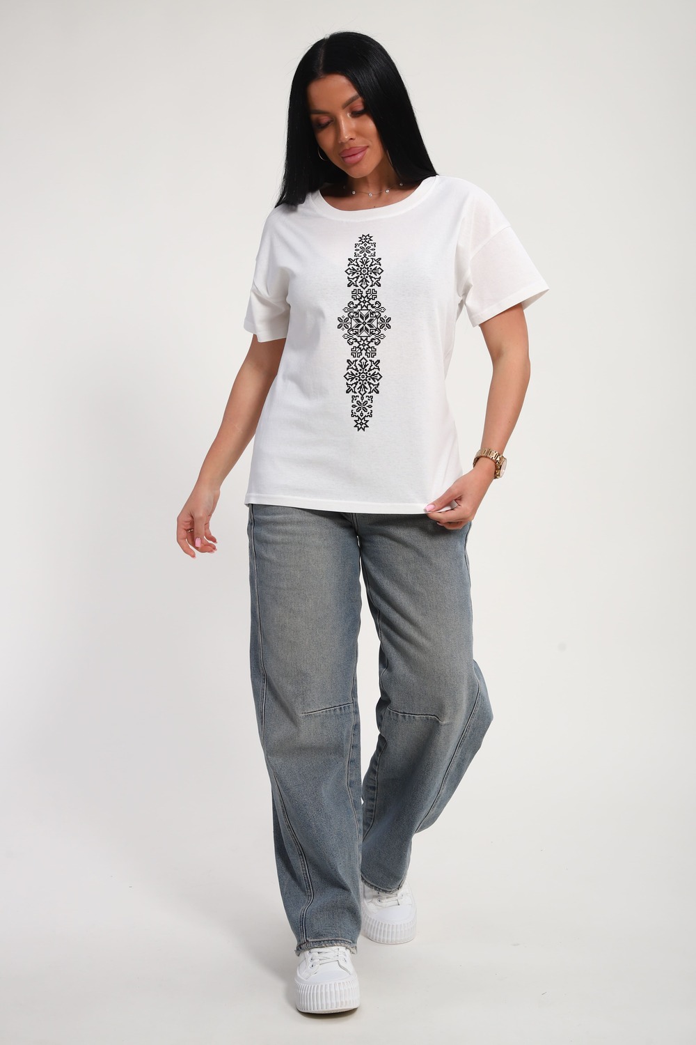Футболка женская из гладкокрашеного трикотажа, хлопок 100%. Прямого силуэта, свободного облегания, горловина круглой формы. Рукав короткий. Низ изделия прямой. На полочке принт, шелкография.