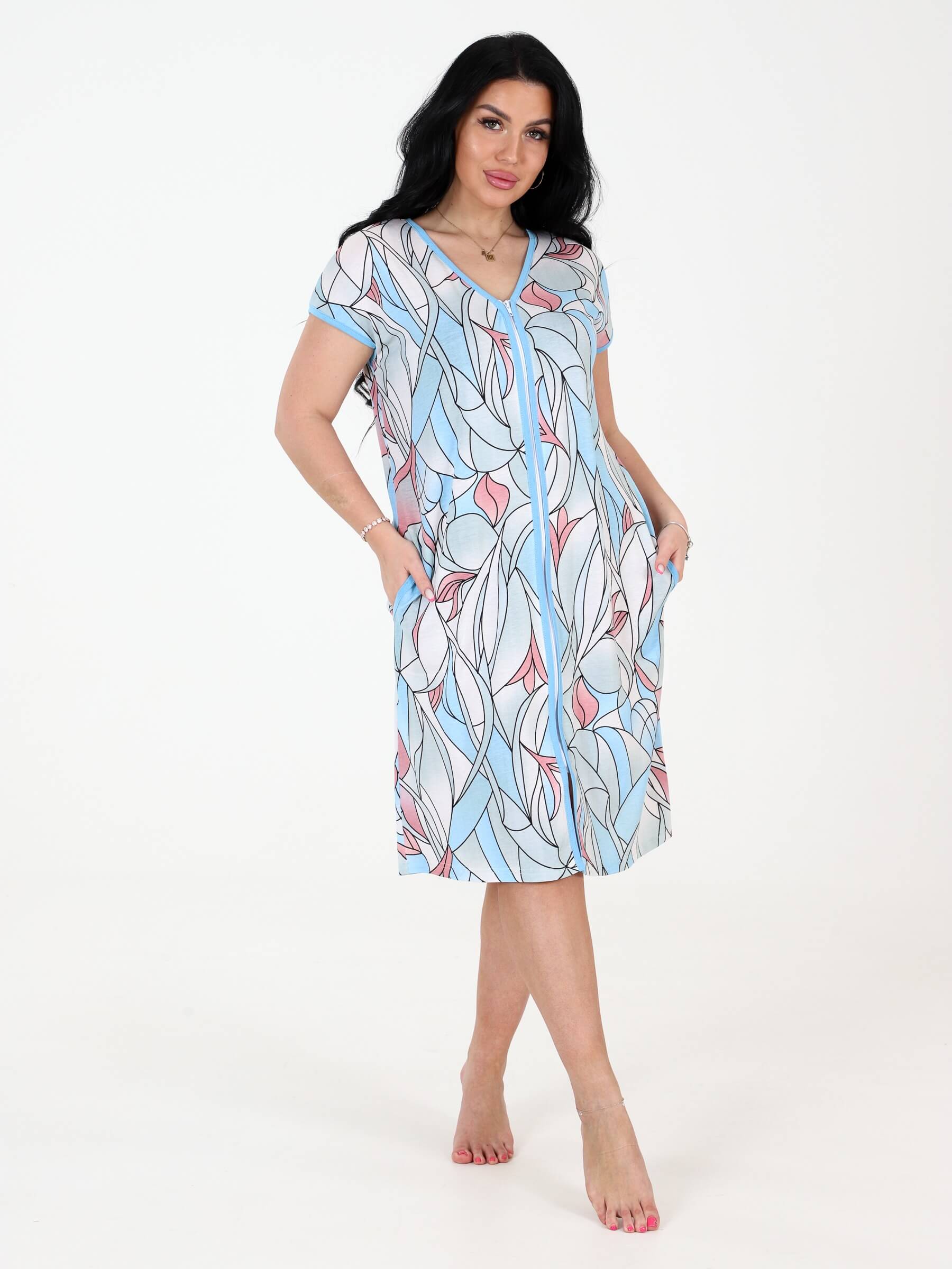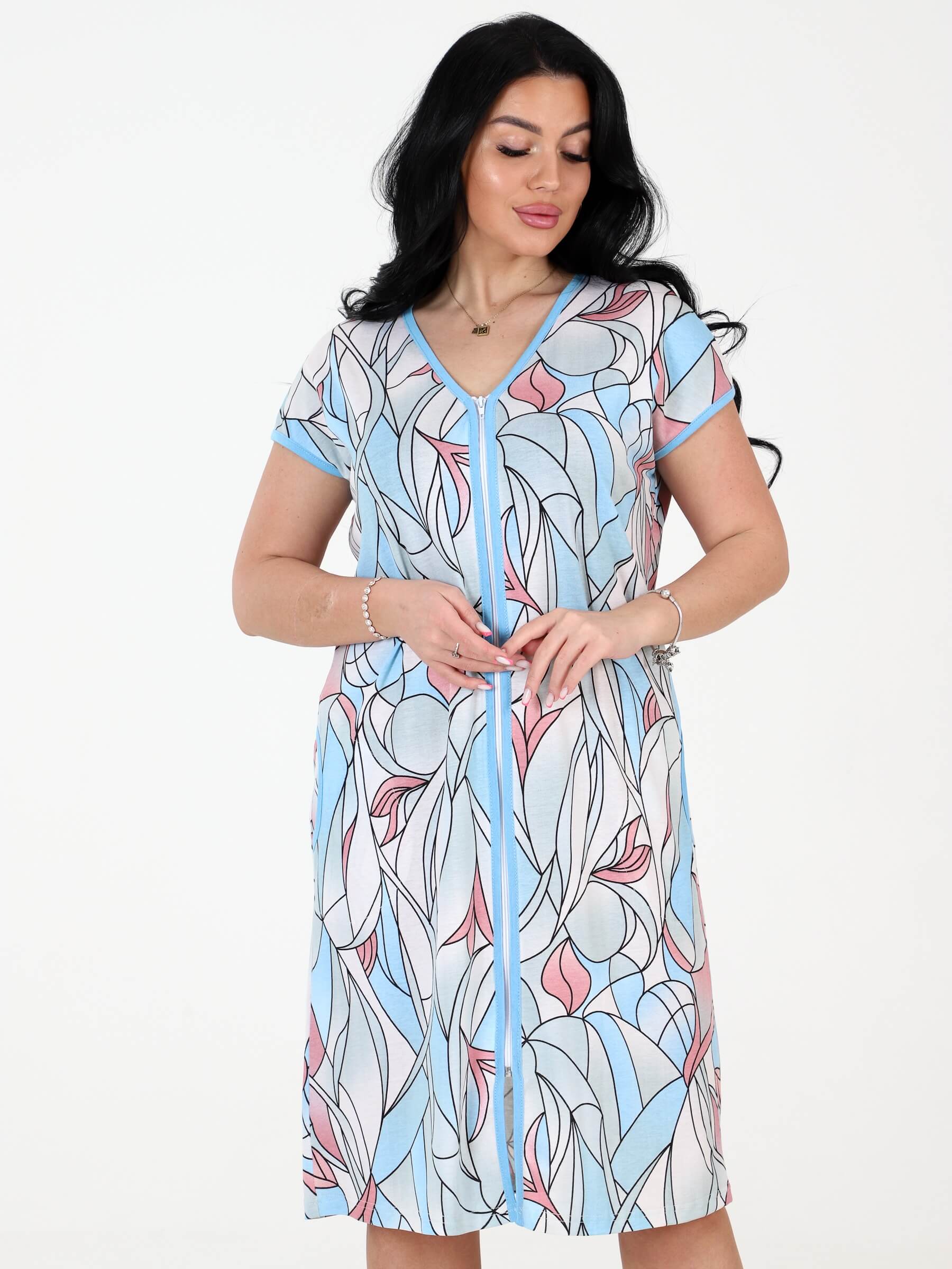 Женский домашний халат КИМОНО ХВ-46 / Витраж на молнии из вискозы. Ткань эластичная, мягкая, приятная к телу. Ткань пропускает воздух и позволяет коже дышать. Плюсом является и тот факт, что халат из вискозы не электризуется. Халат из вискозы окантован по горловине и вдоль молнии по всей длине халата, вход в карманы также окантован. Изящный V-образный вырез. Будет удобен не только в домашних условиях, а также подойдет для посещения бассейна, пляжа, поездах в поезде, отдыха в санатории или лечении в больнице и т.д.