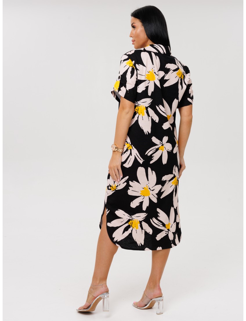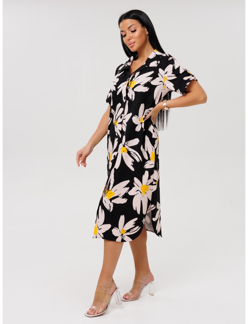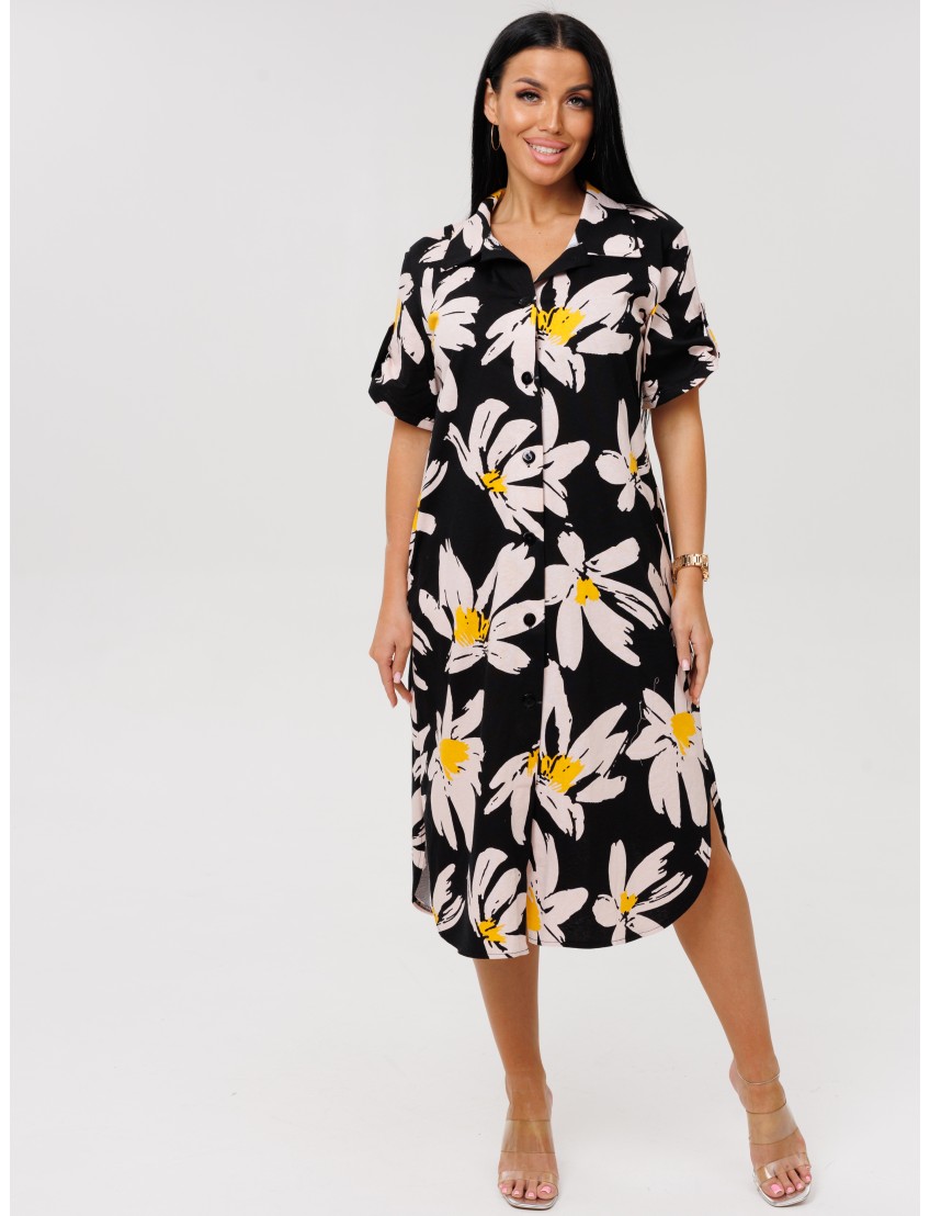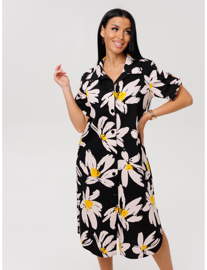 Женский халат Х-105(К) / Черный (цветы) отшивается из трикотажного хлопкового полотна, кулирки. Женский домашний халат имеет застежку на пуговицы, короткие рукава и разрезы по бокам.