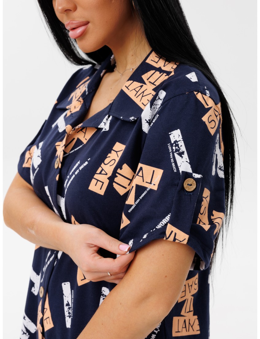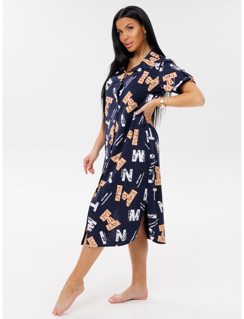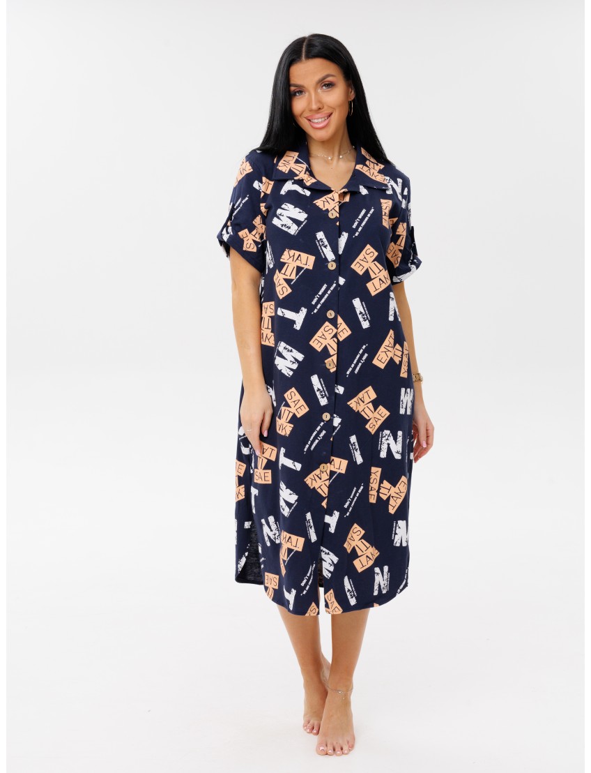 Женский халат Х-105(К) / Темно-синий (надписи) отшивается из трикотажного хлопкового полотна, кулирки. Женский домашний халат имеет застежку на пуговицы, короткие рукава и разрезы по бокам.