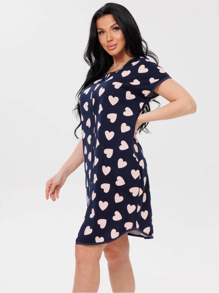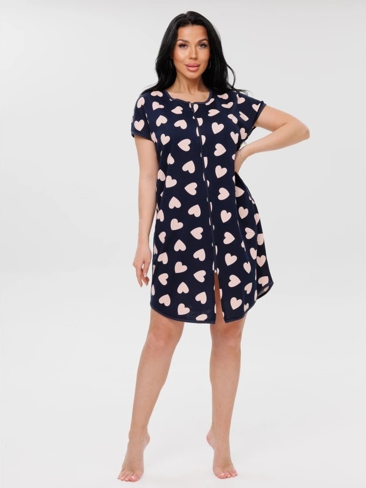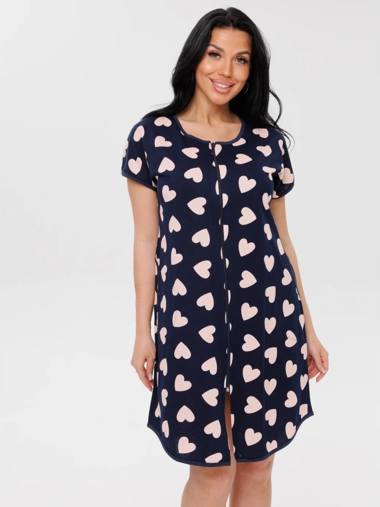 Женский халат Х-154(К) / Темно-синий (сердечки) на молнии, с короткими рукавами. Женский домашний халат из кулирки имеет широкий размерный ряд и яркие расцветки.