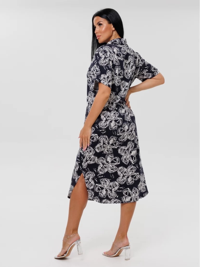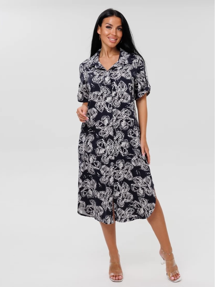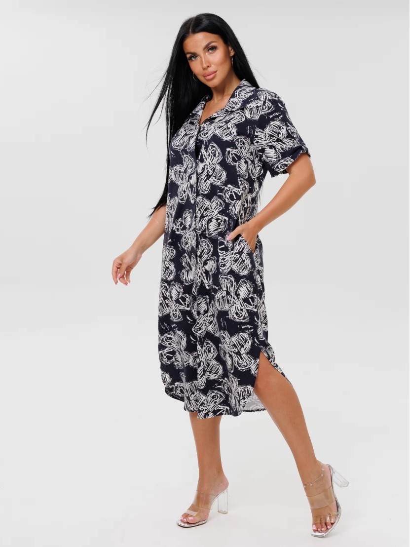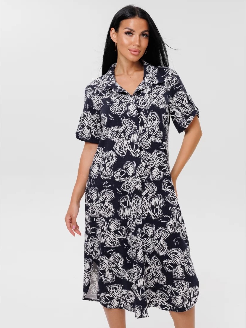 Женский халат Х-105(К) / Темно-синий (цветы) отшивается из трикотажного хлопкового полотна, кулирки. Женский домашний халат имеет застежку на пуговицы, короткие рукава и разрезы по бокам.