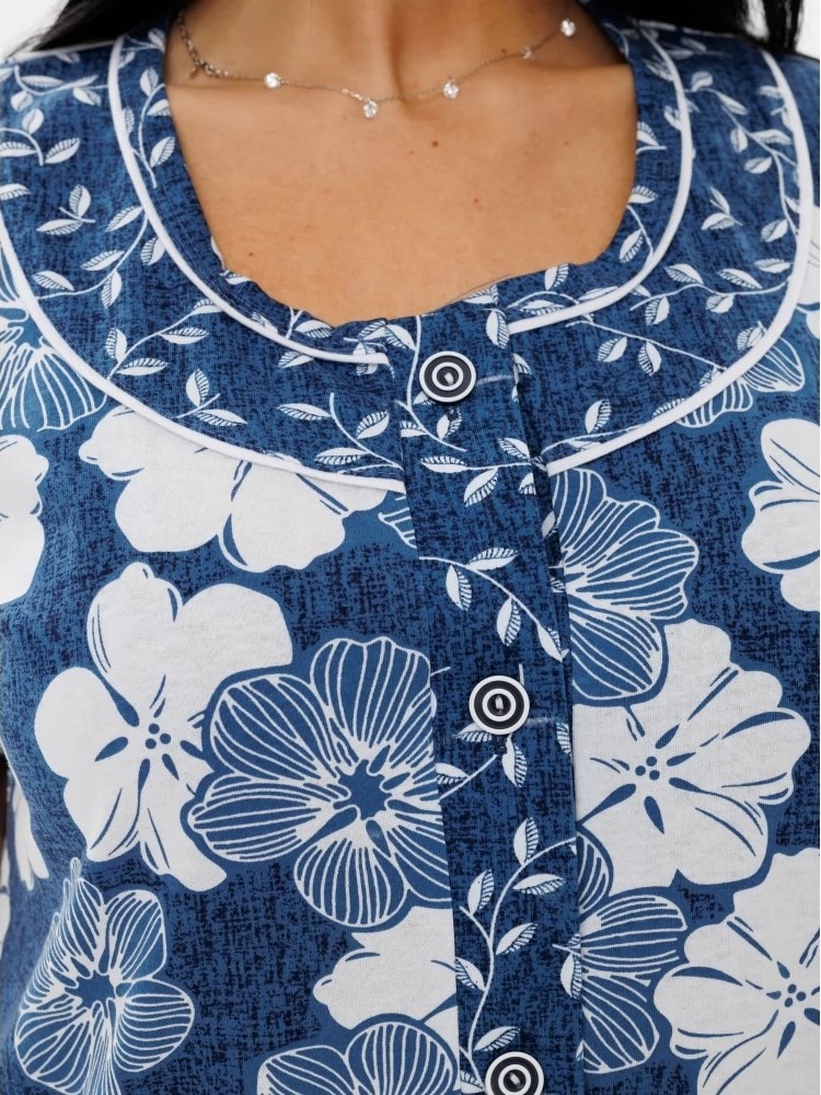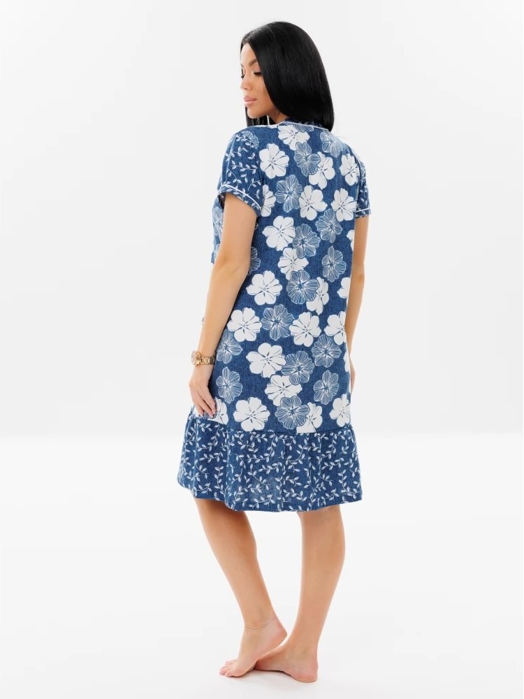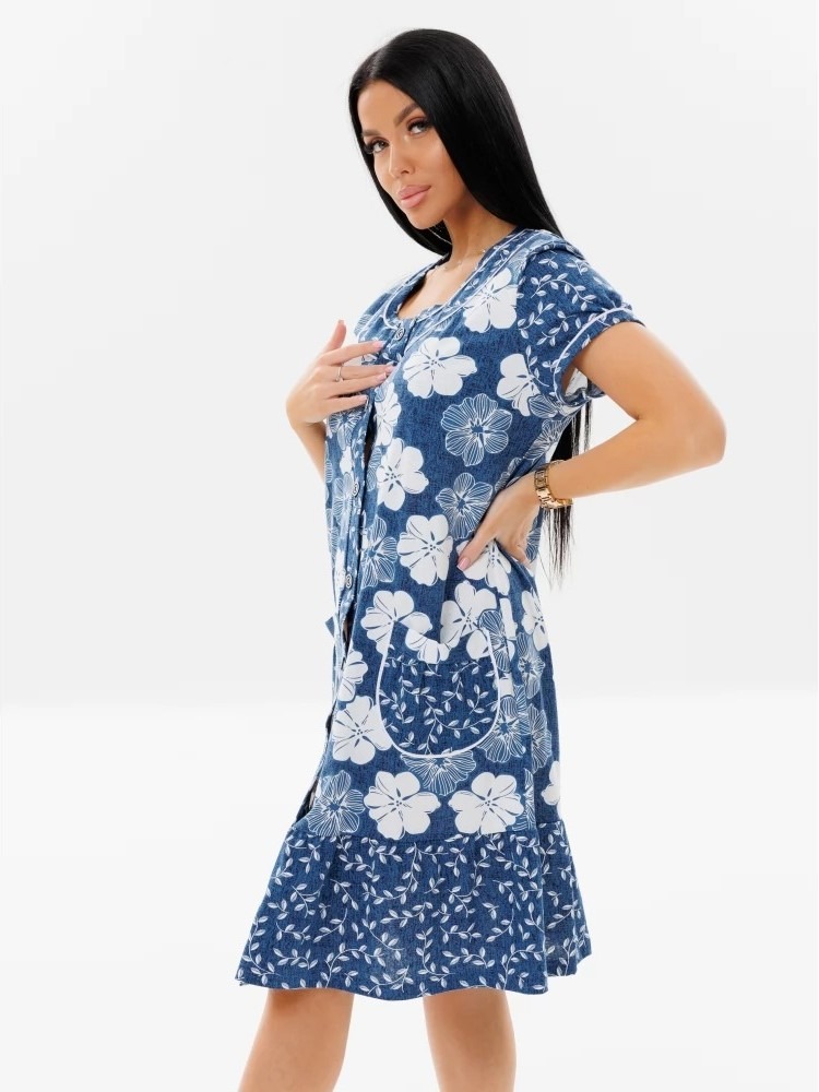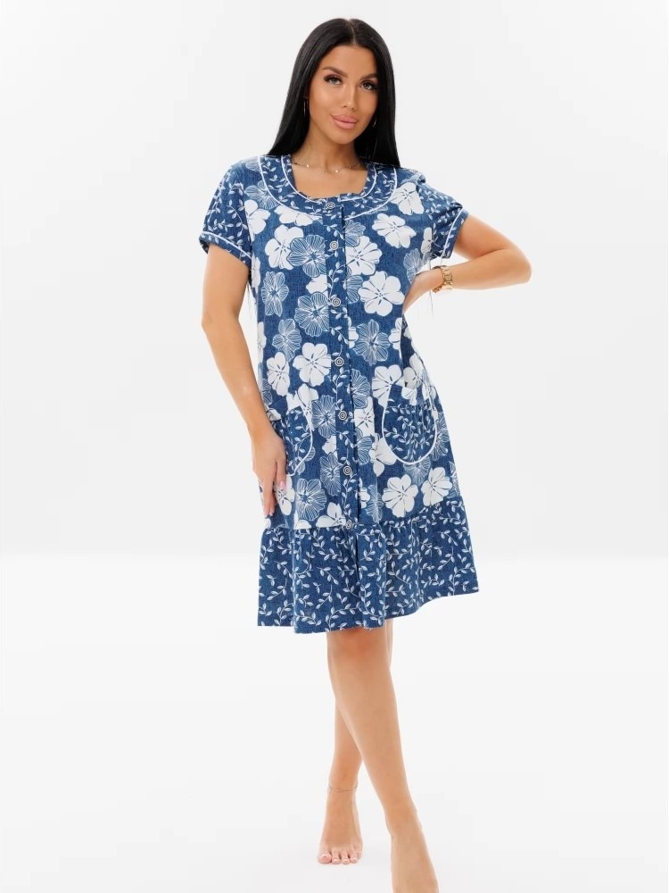 Женский халат Х-48(К) / Индиго (цветы) из 100% хлопка свободного силуэта. Модель на пуговицах с укороченным рукавом. Нежная оборка, карманы и рукава придают акцент принтом с горошком.