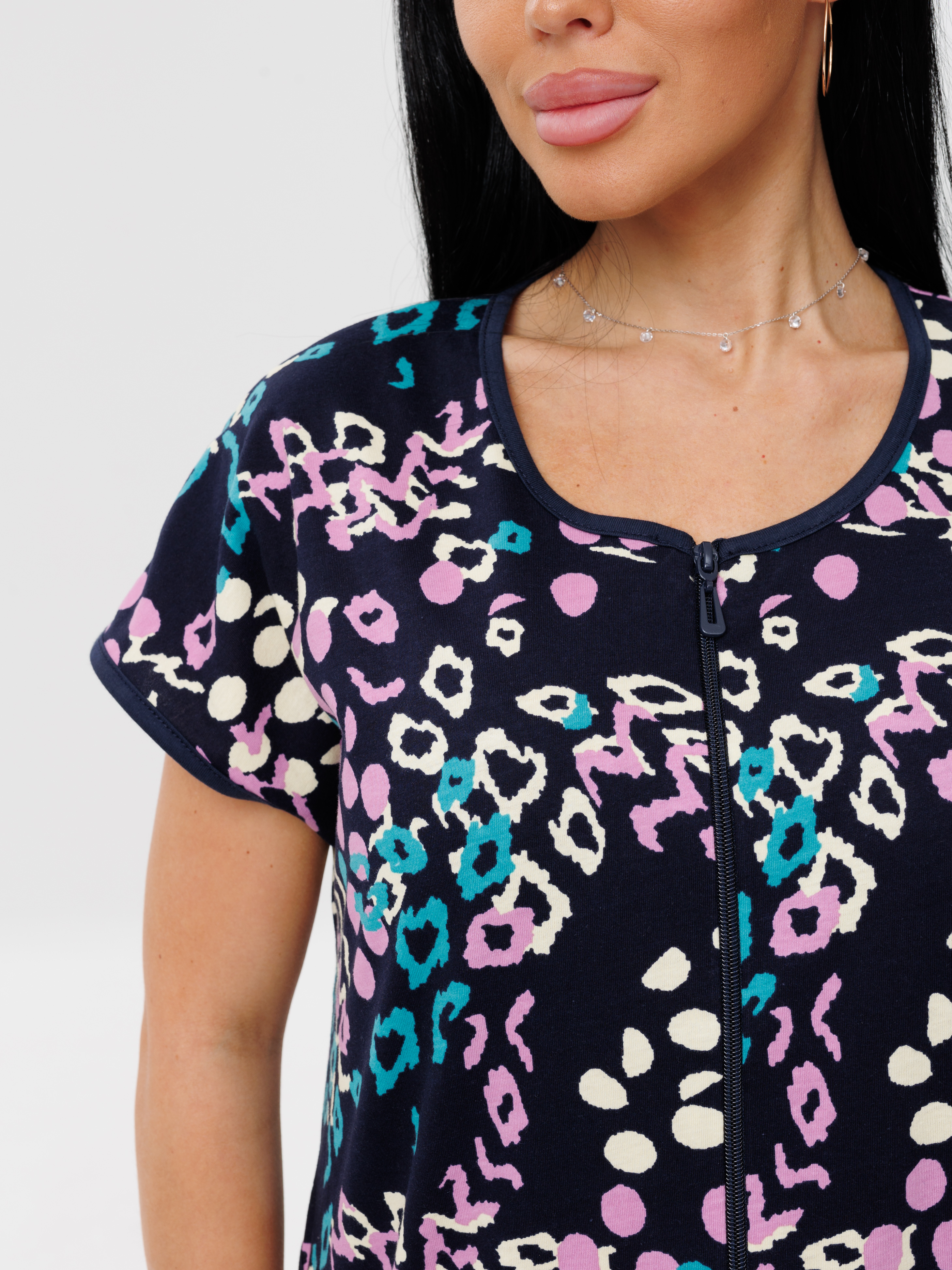 молнии, с короткими рукавами. Женский домашний халат из кулирки имеет широкий