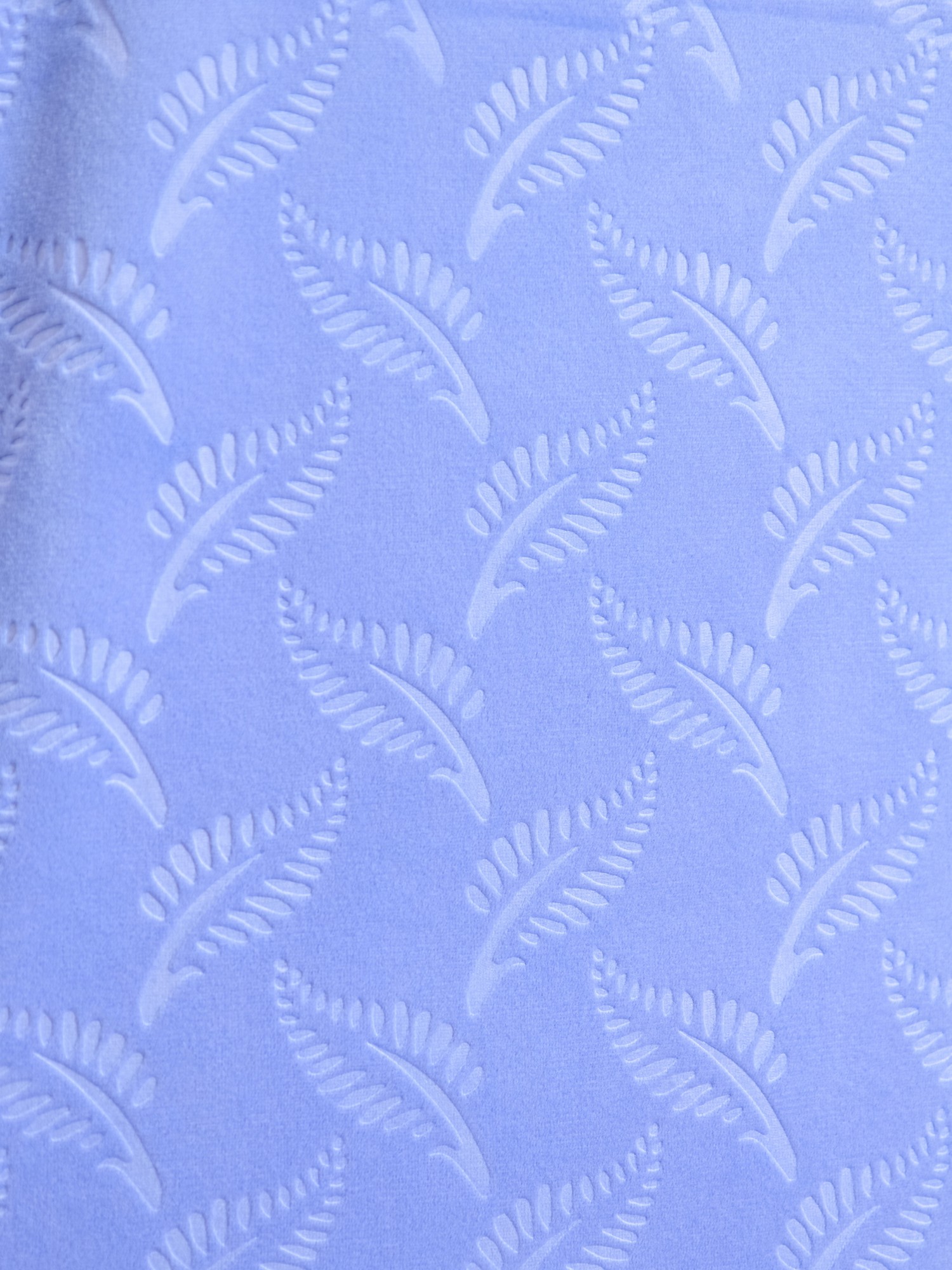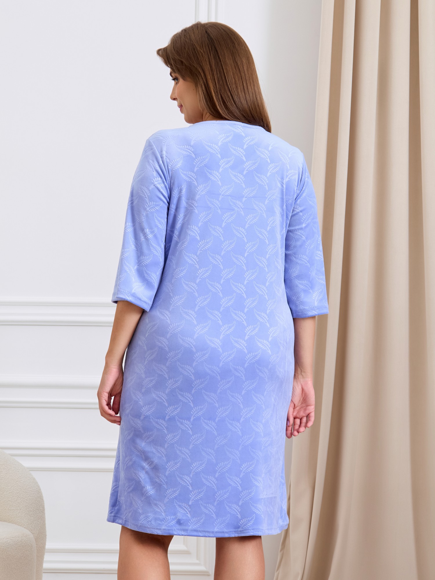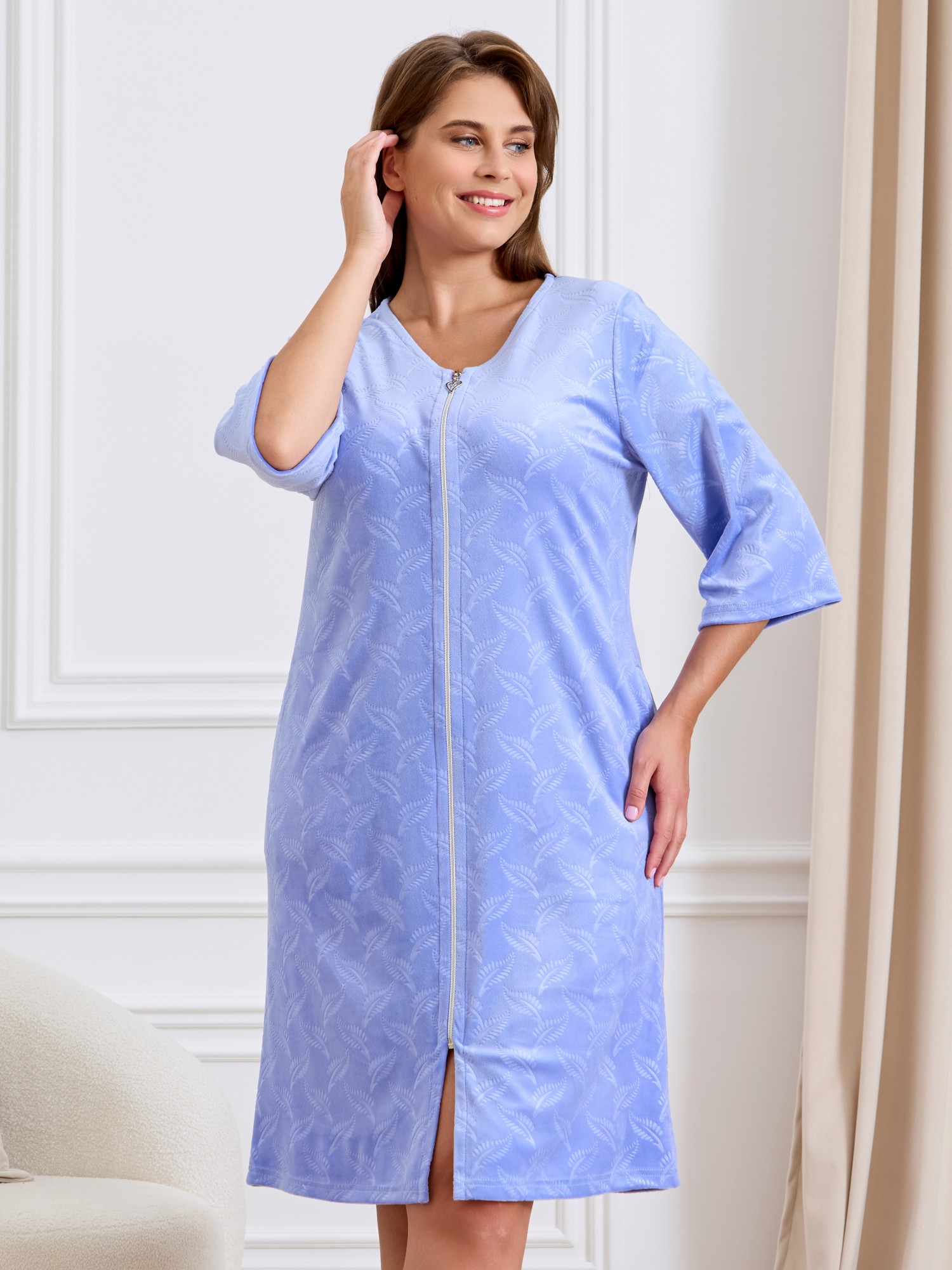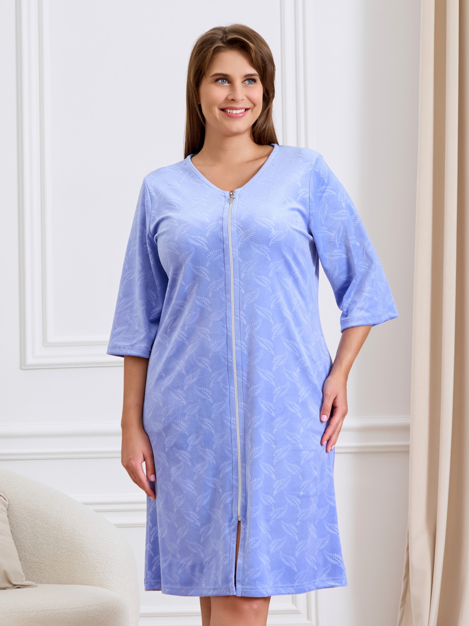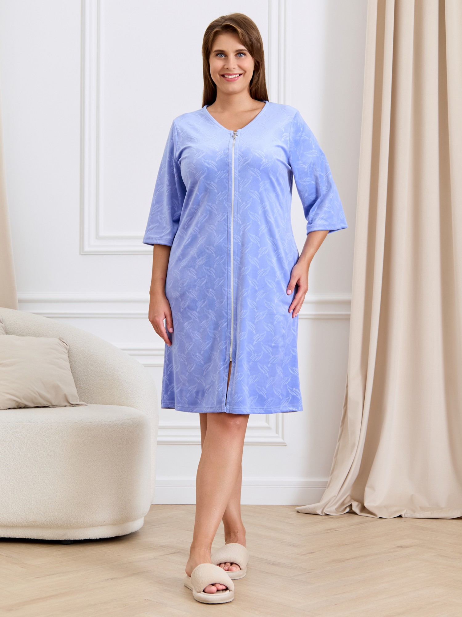 Халат женский из гладкокрашеного полотна «велюр» с рисунком, выполненным тиснением на термопрессе. Изделие прямого силуэта, с втачными рукавами длиной ¾, горловиной овальной формы, карманами в боковых швах и центральной бортовой застежкой на тесьму «молния».