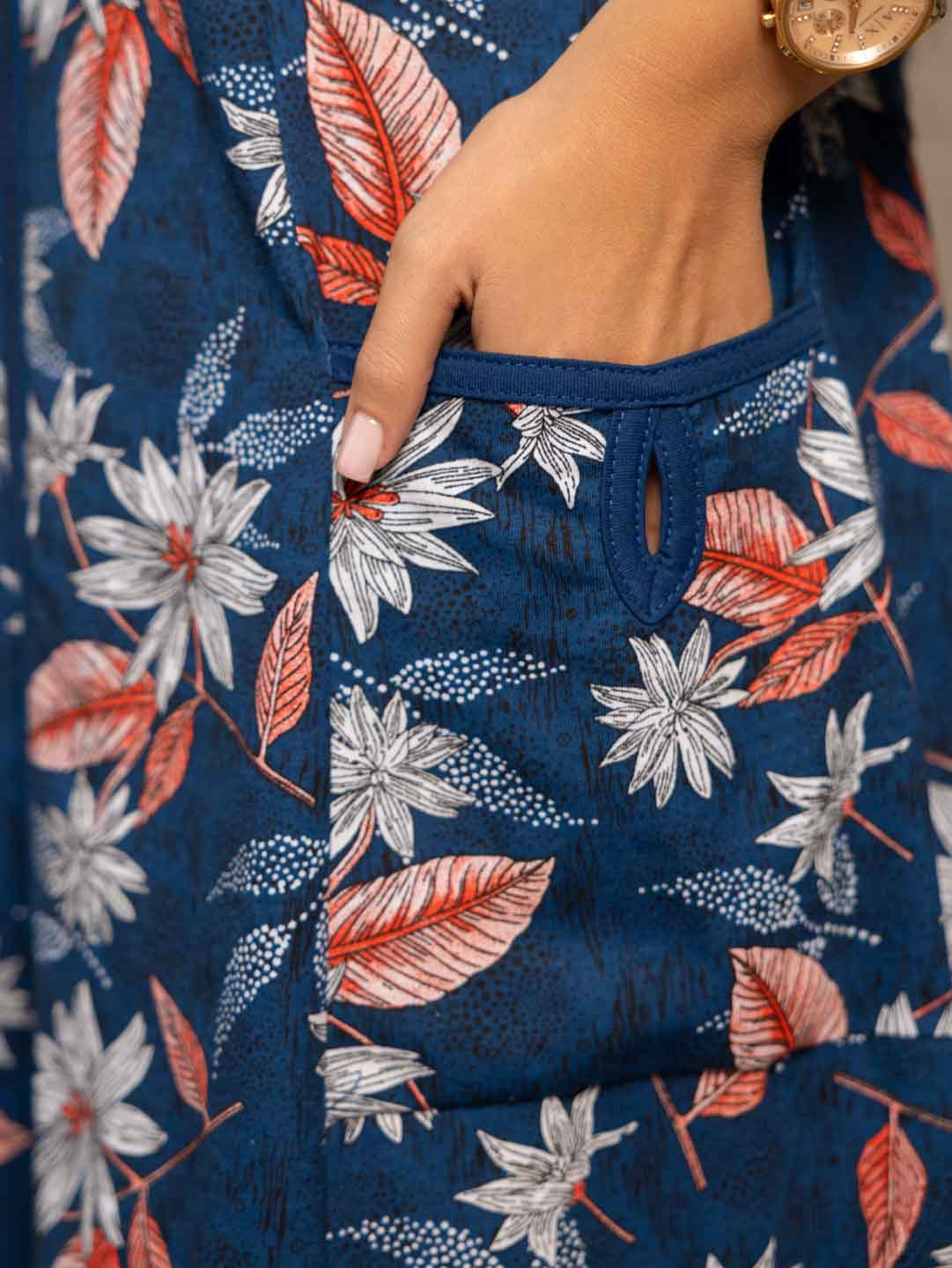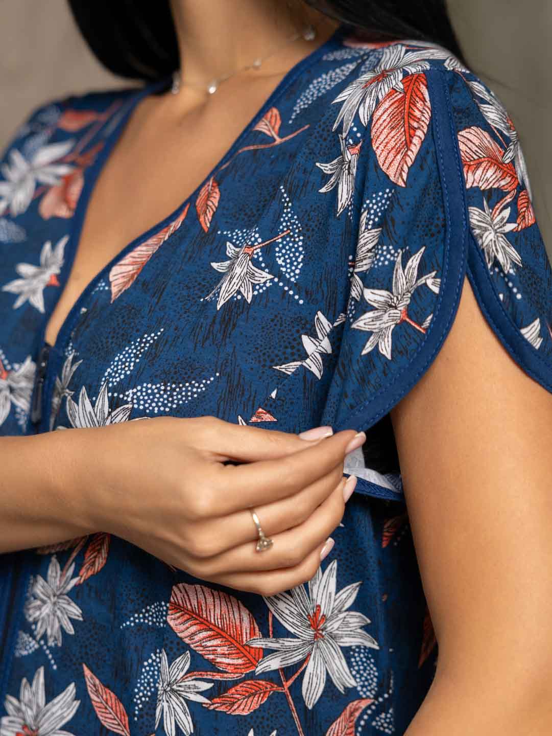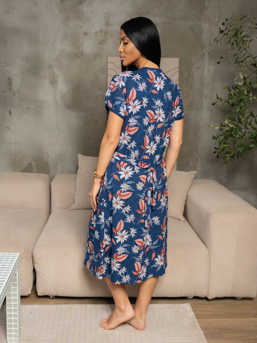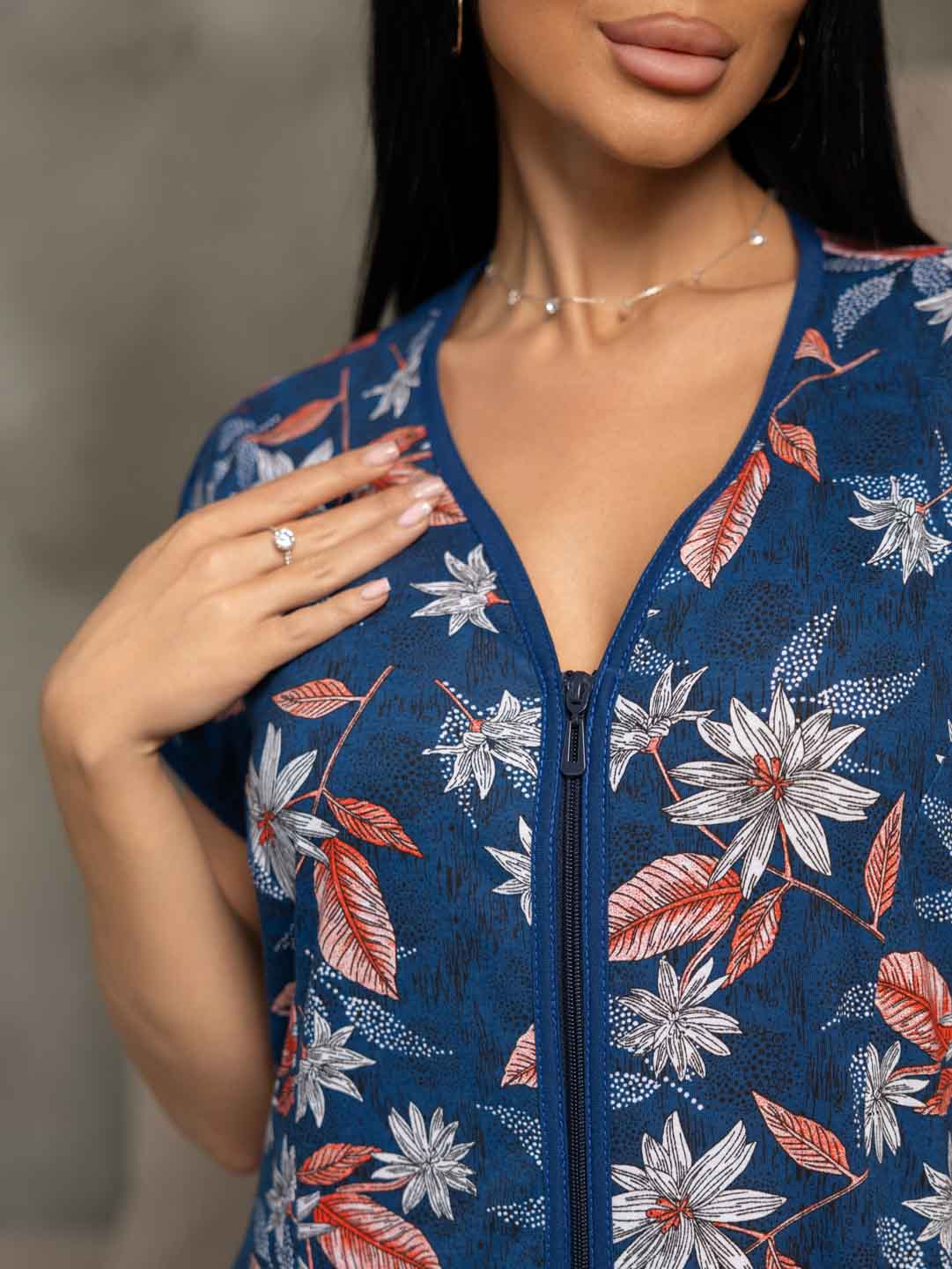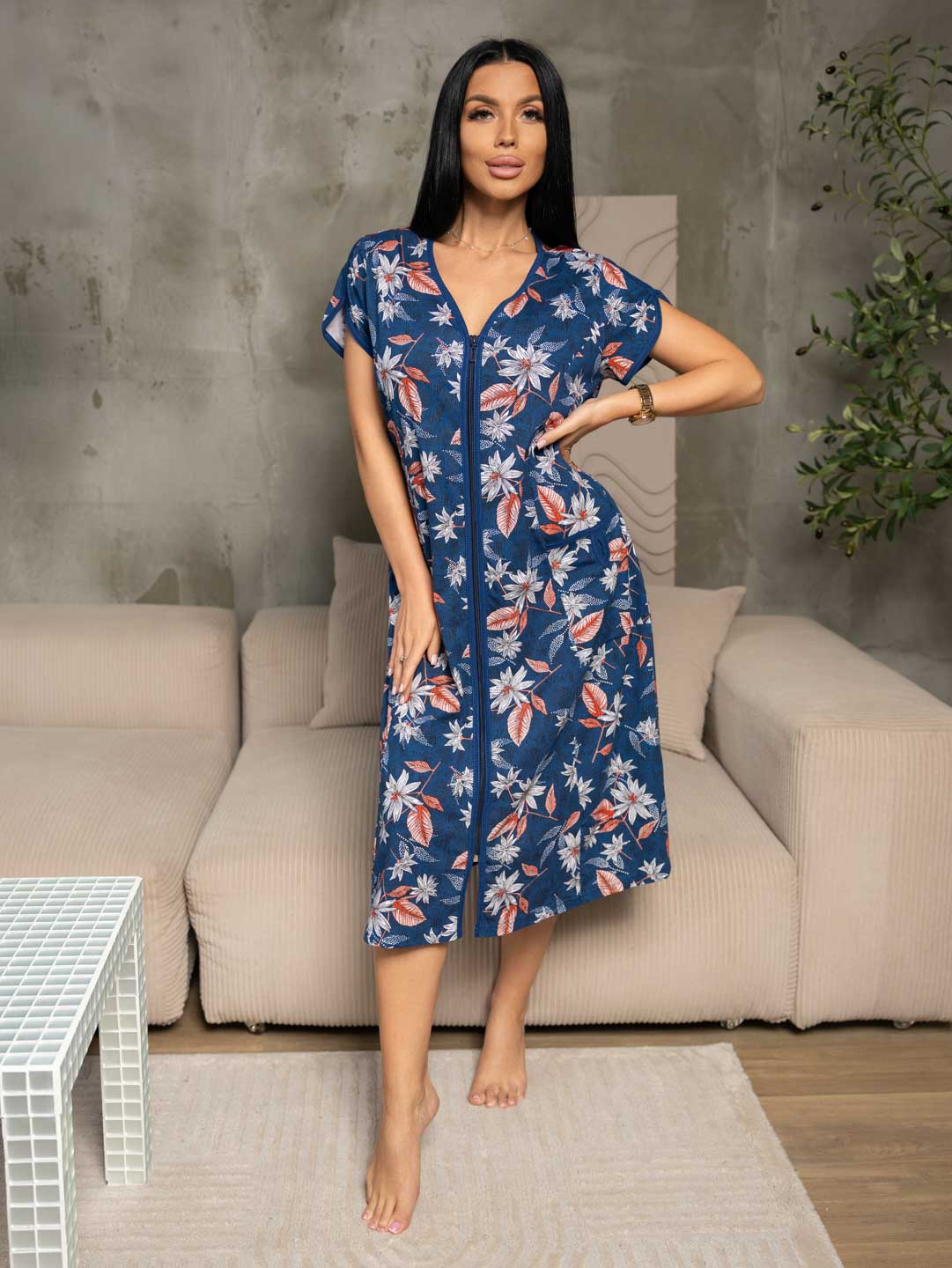 Женский домашний халат из хлопка, полуприлегающего силуэта с застежкой на молнию. Спереди на халате рельефные швы и два накладных кармана. Сзади пояс, обеспечивающий прилегание по спинке и создающий силуэт песочные часы.