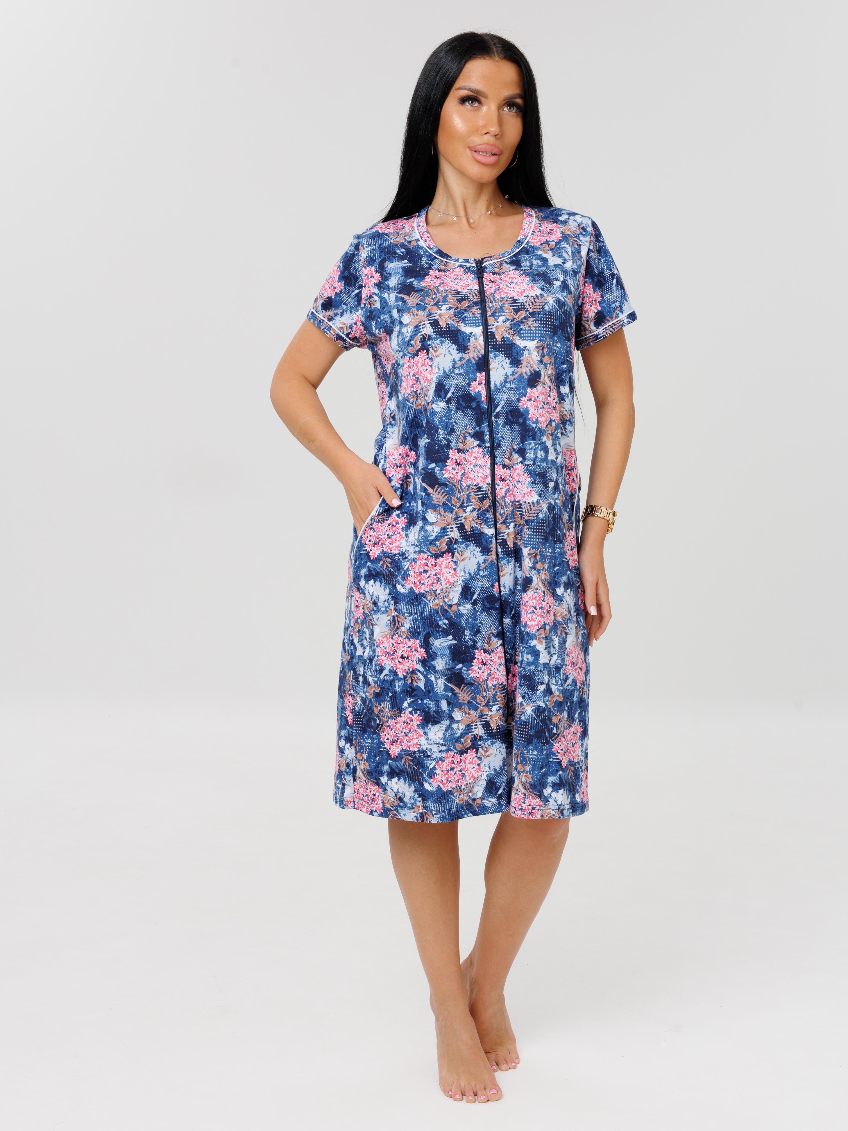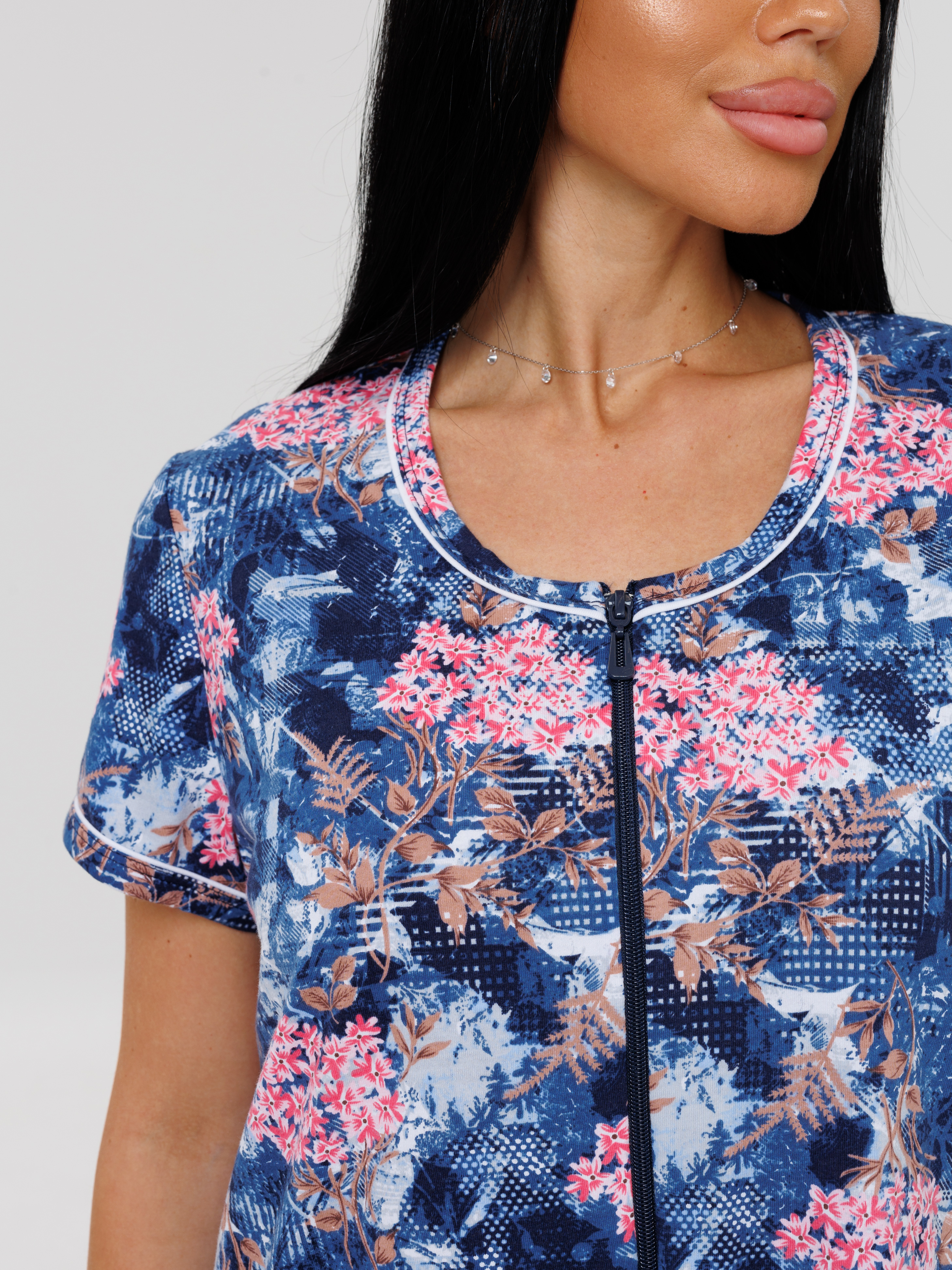 молнии, с короткими рукавами. Женский домашний халат из кулирки имеет широкий